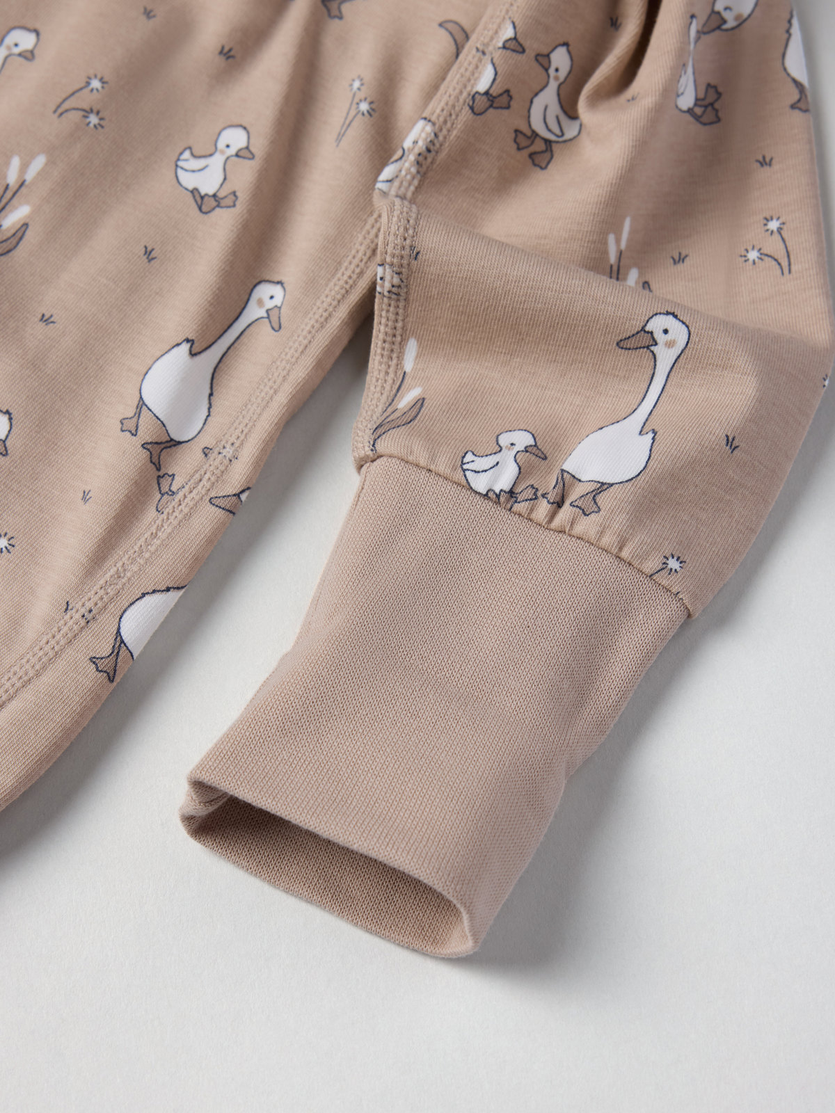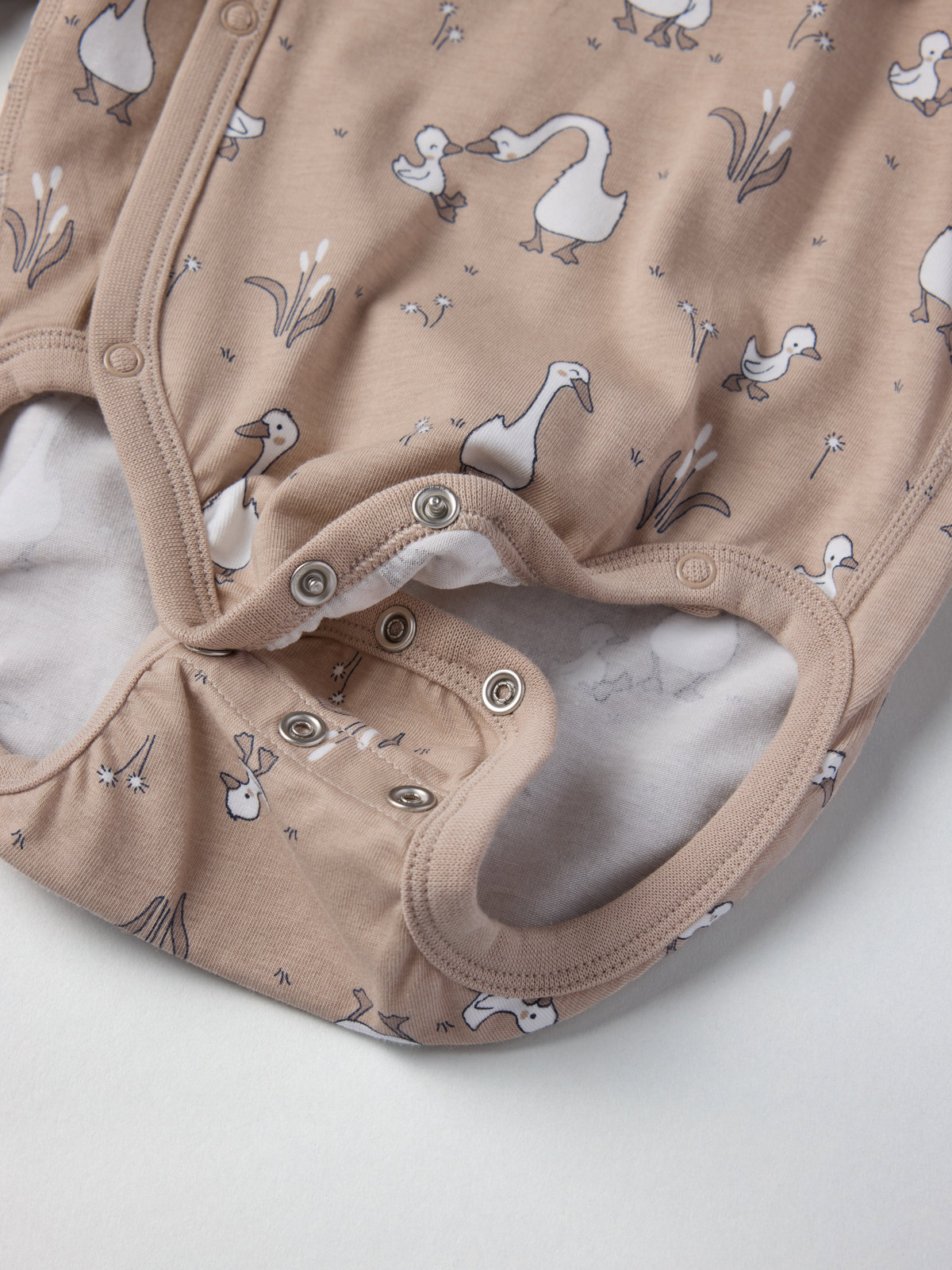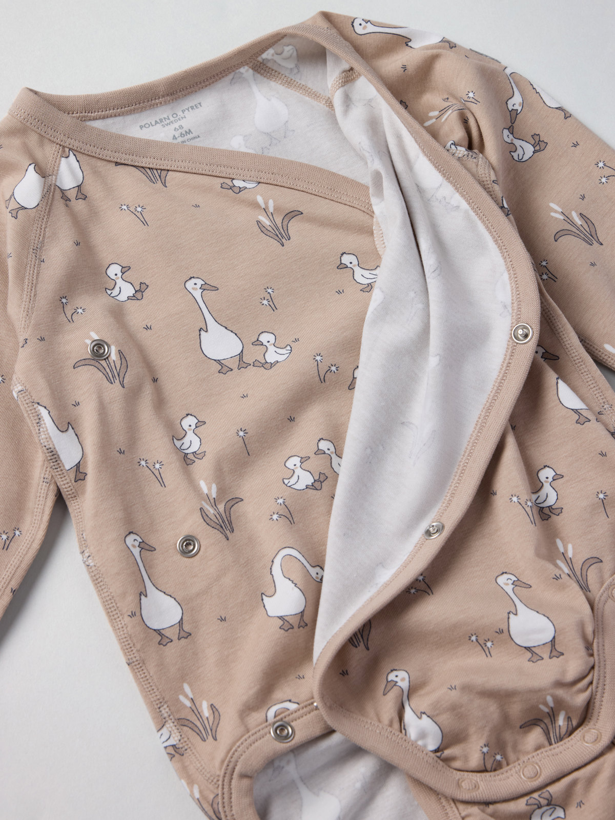 Förlängningsbar omlottbody i 100 % ekologisk bomull, helmönstrad med gäss. Tack vare den smarta lösningen med en extra rad tryckknappar i grenen och nedvikbara muddar vid ärmsluten kan bodyn växa tillsammans med bebisen!