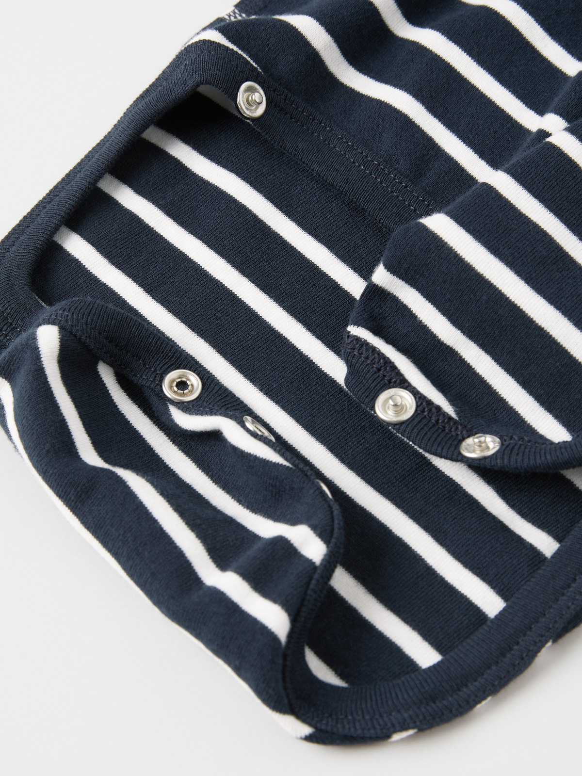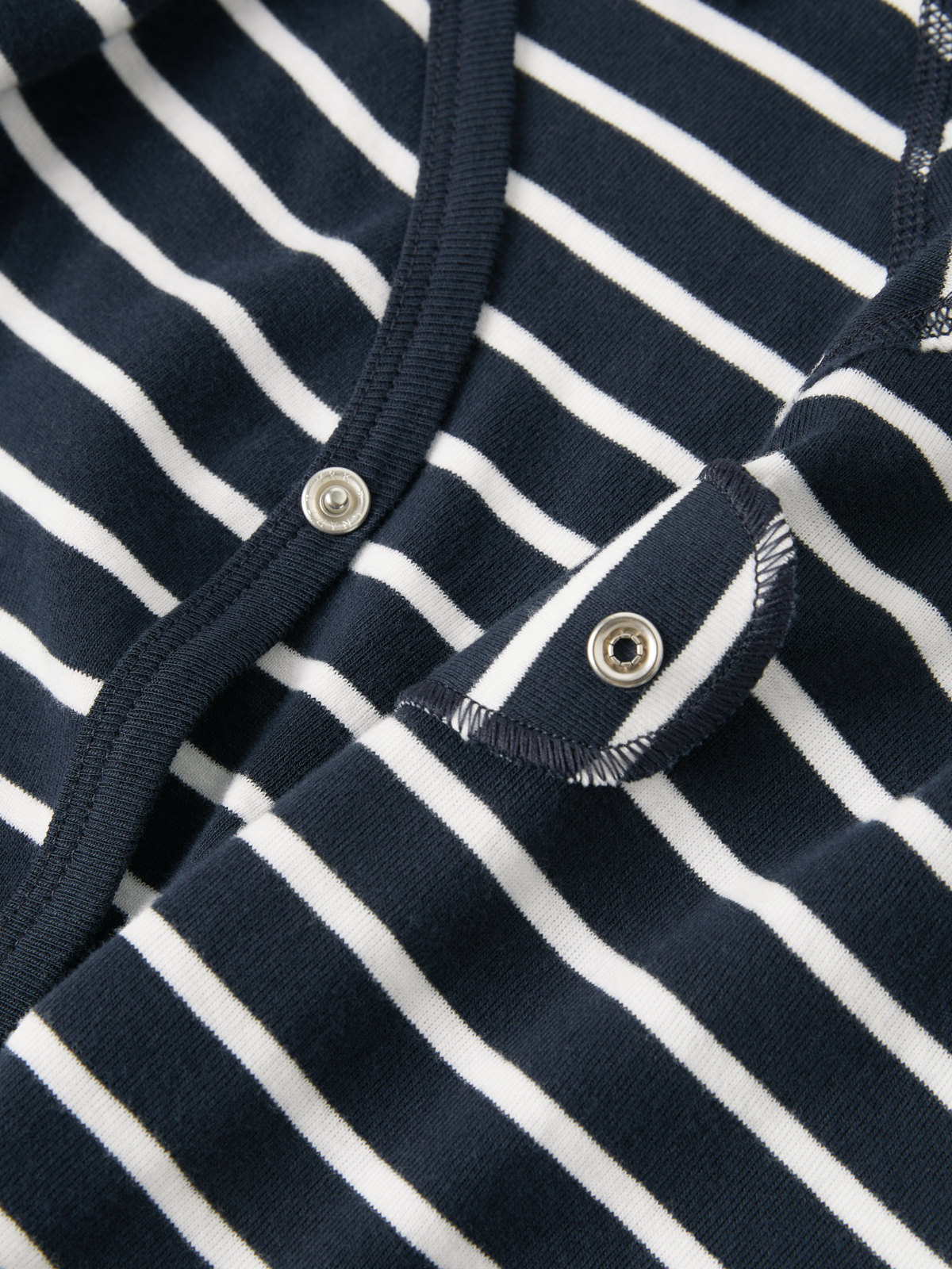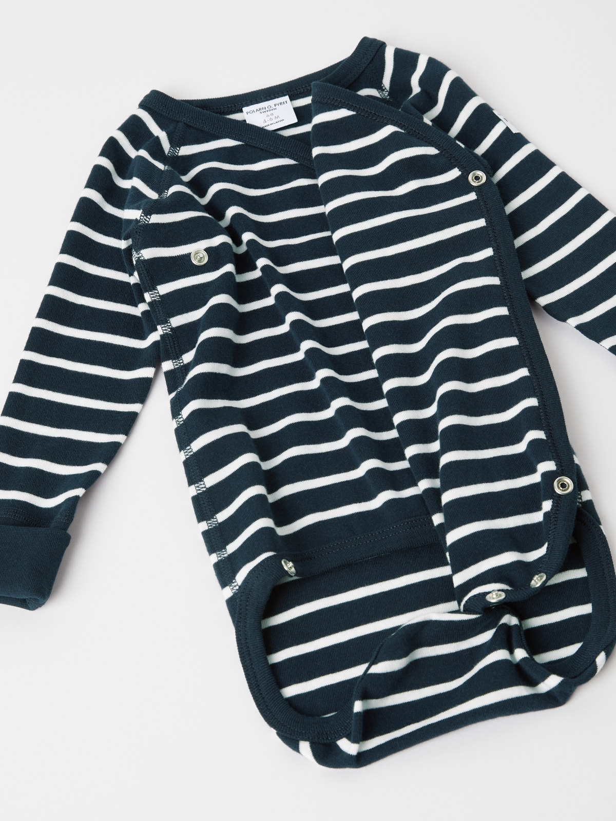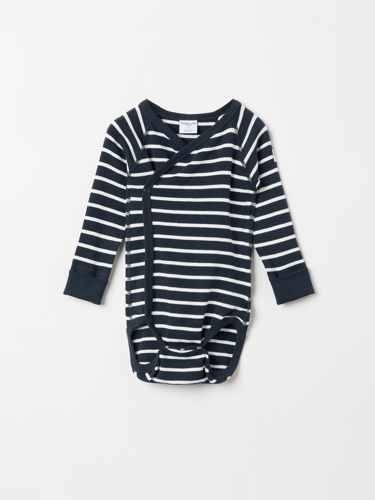 Randig omlottbody i 100 % ekologisk bomull för baby. Bodyn är sydd med extra mjuka sömmar som inte skaver mot känslig hud. Tryckknapparna längs omlottöppningen underlättar klädbyten.