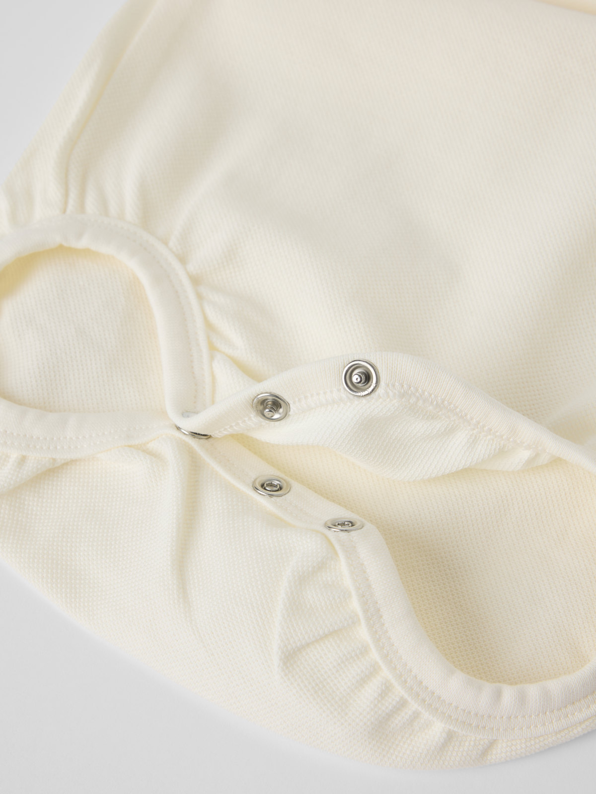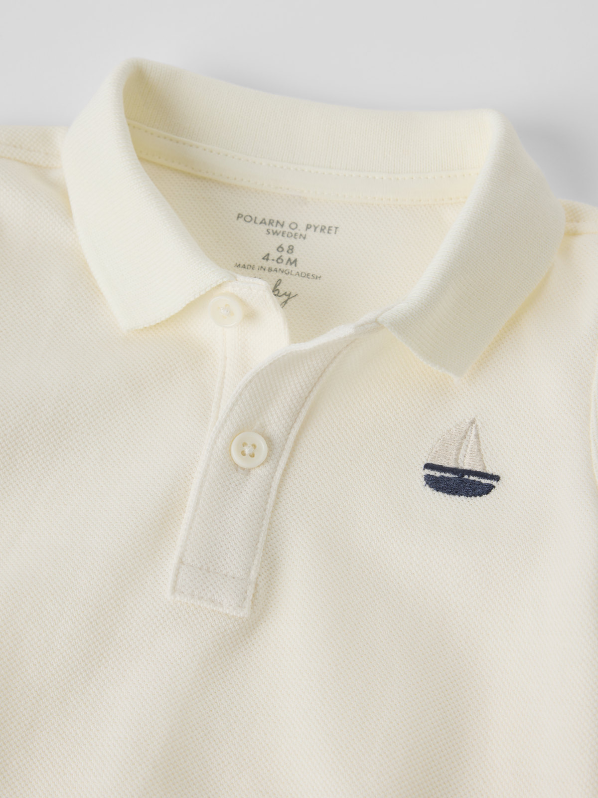 Pikébody i 100 % ekologisk bomull med krage och knappslå – ett fint plagg för alla tillfällen! Bodyn har en liten segelbåt broderad på bröstet och ribbad mudd i ärmslut för skön passform. Tryckknapparna i grenen underlättar blöjbyten.