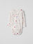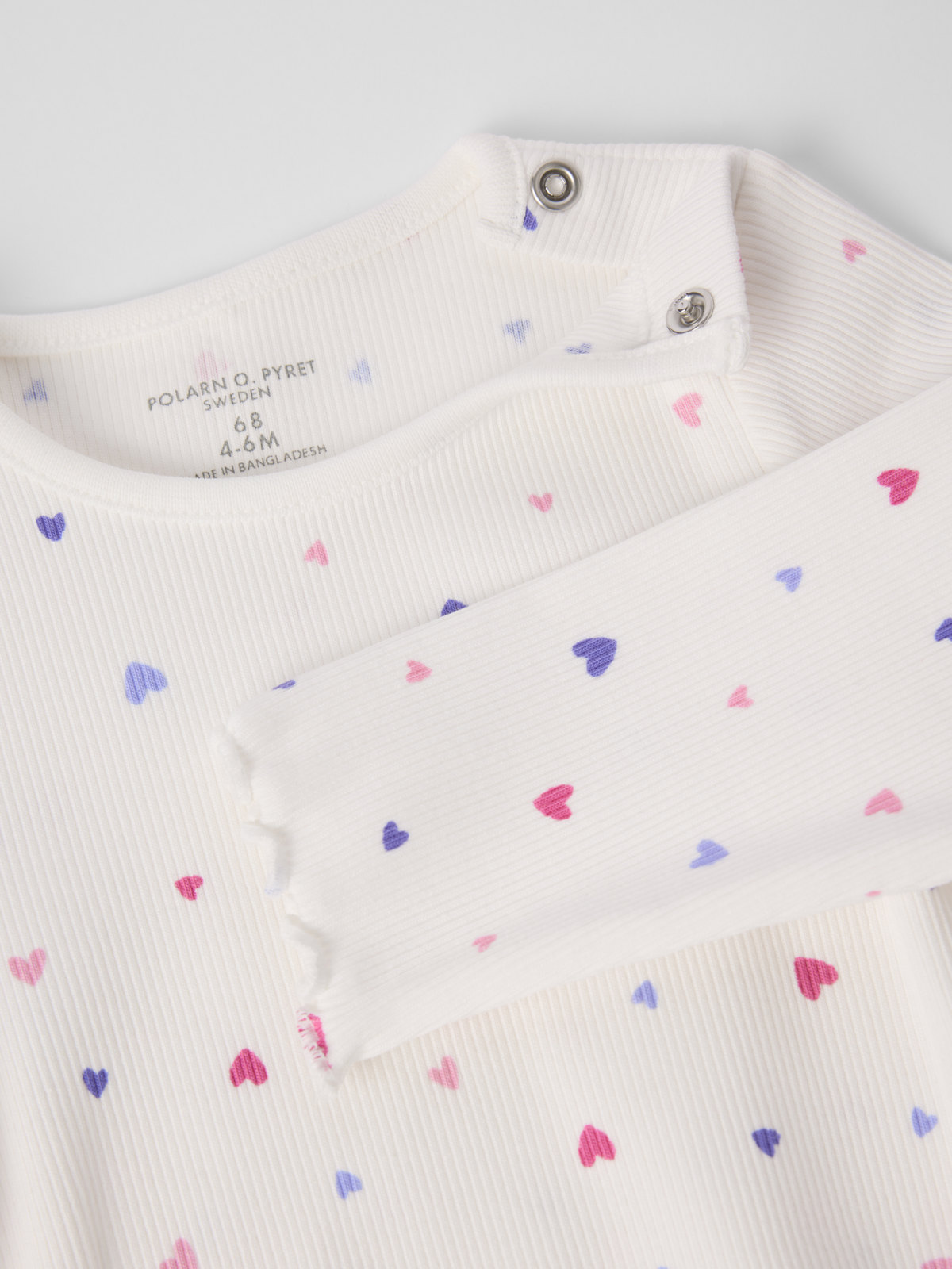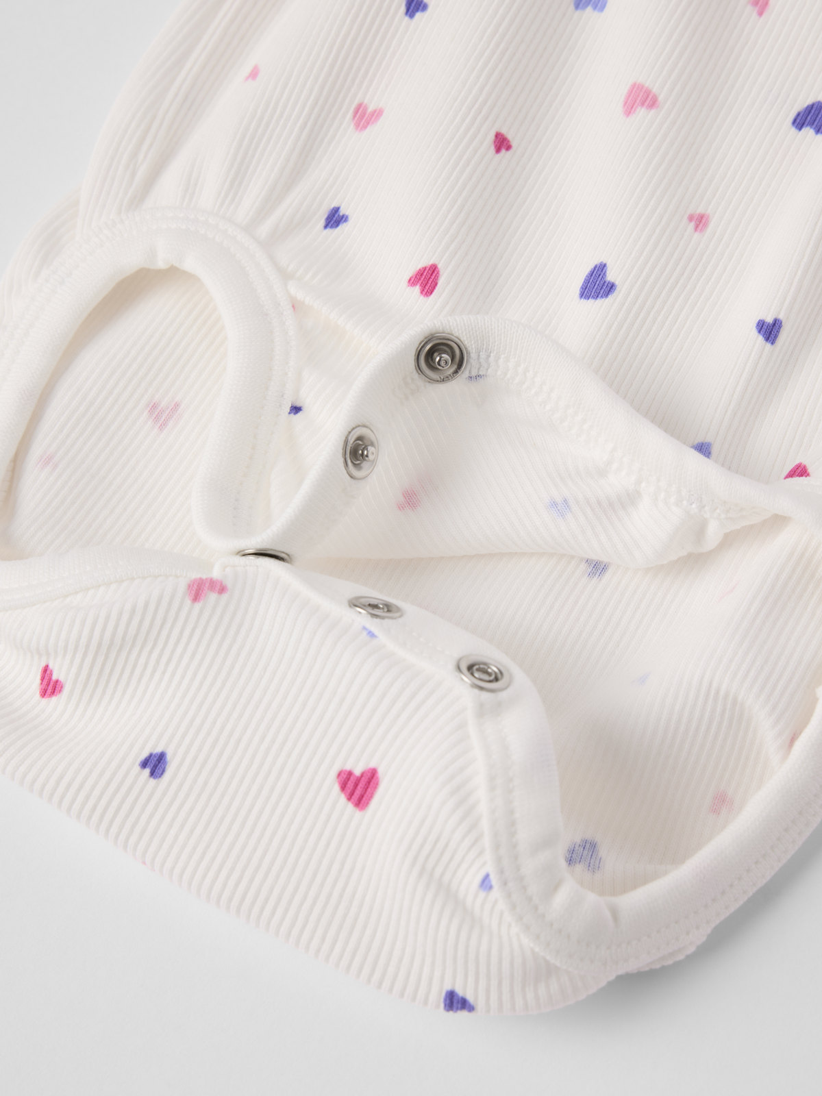 Ribbad body i tunn, ekologisk bomull för baby. Bodyn är sydd med extra mjuka, platta sömmar som inte skaver mot känslig hud och har söt krusad uddkant i ärmslut. Tryckknapparna på ena axeln och i grenen underlättar klädbyten.