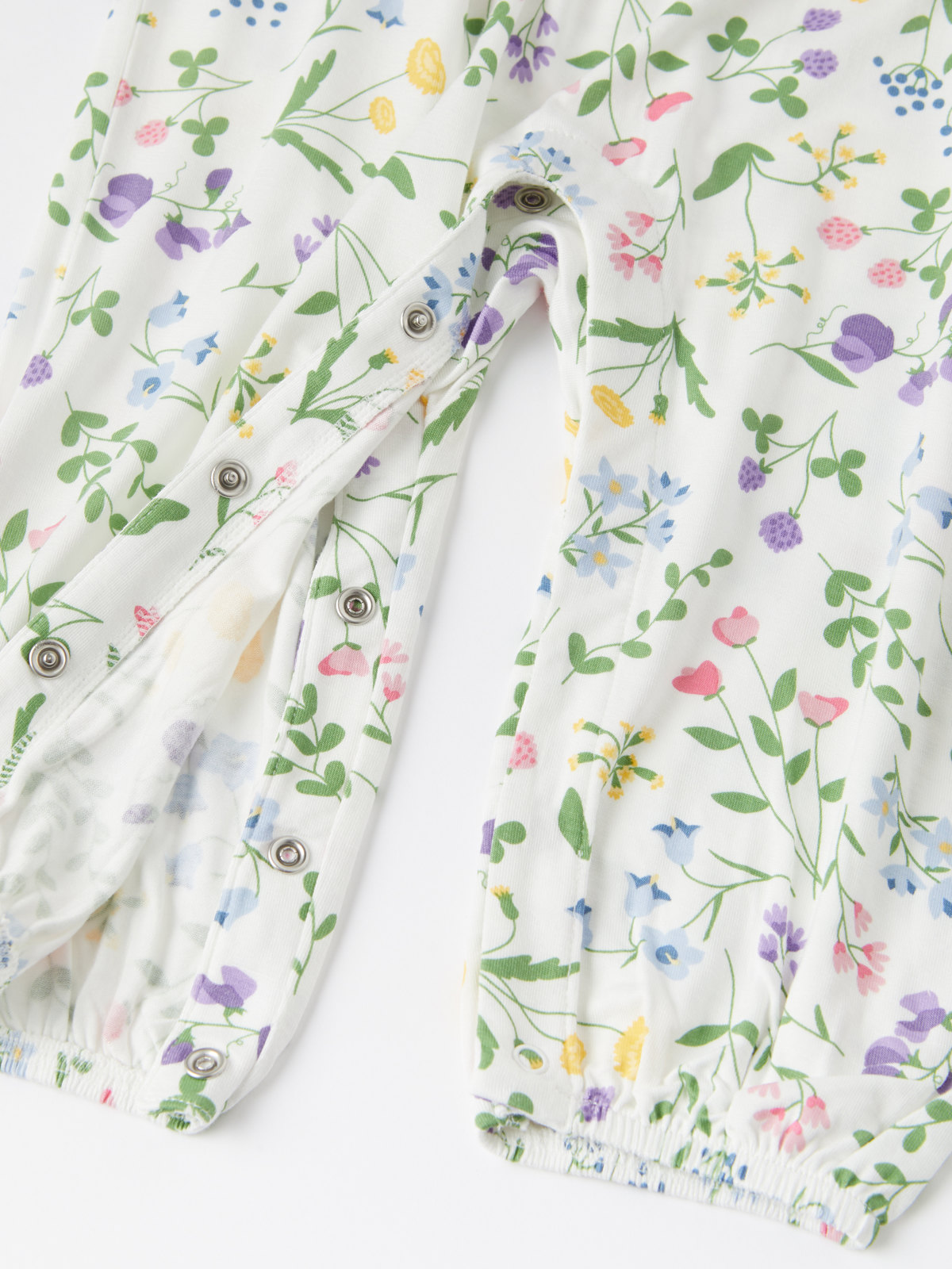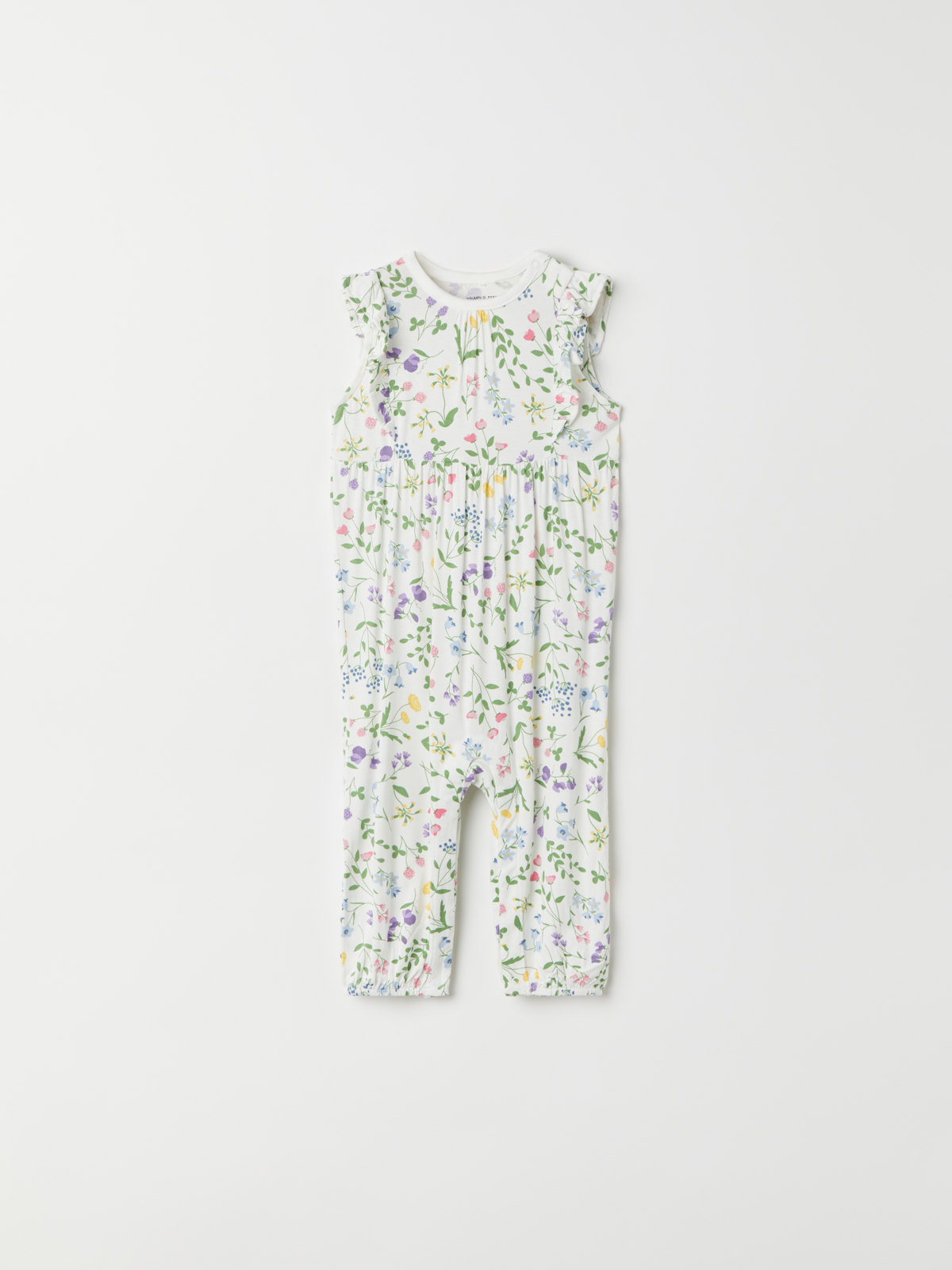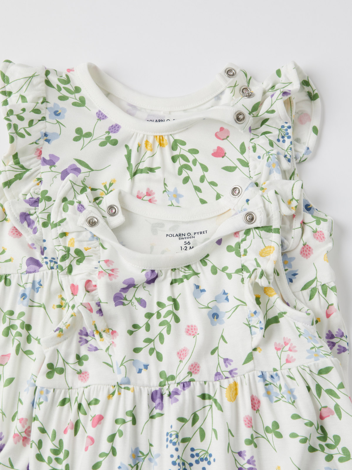 Byxdressen är helmönstrad med blommor och prydd med volanger fram som fortsätter över axlarna och bak på ryggen.