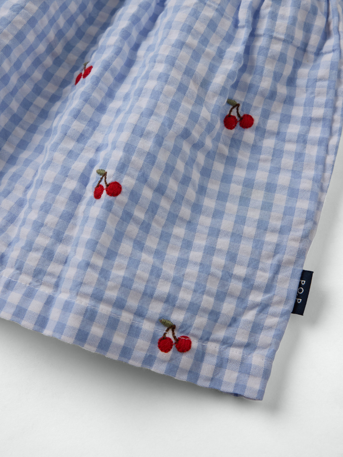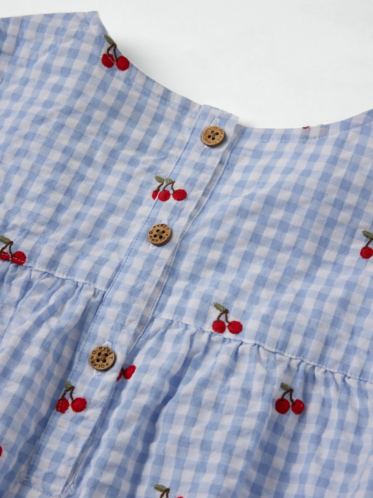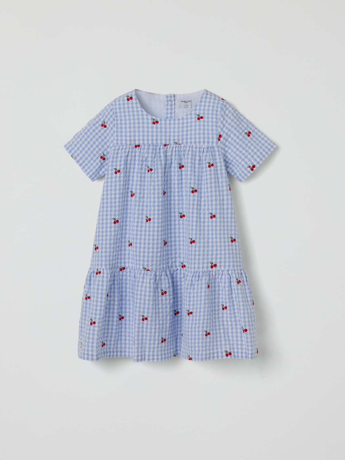 Kortärmad klänning i mjuk bäckebölja av ekologisk bomull – en fin och skön sommarfavorit! Klänningen har vid passform och stängs med knappar i ryggen. Den är broderad med små körsbär.