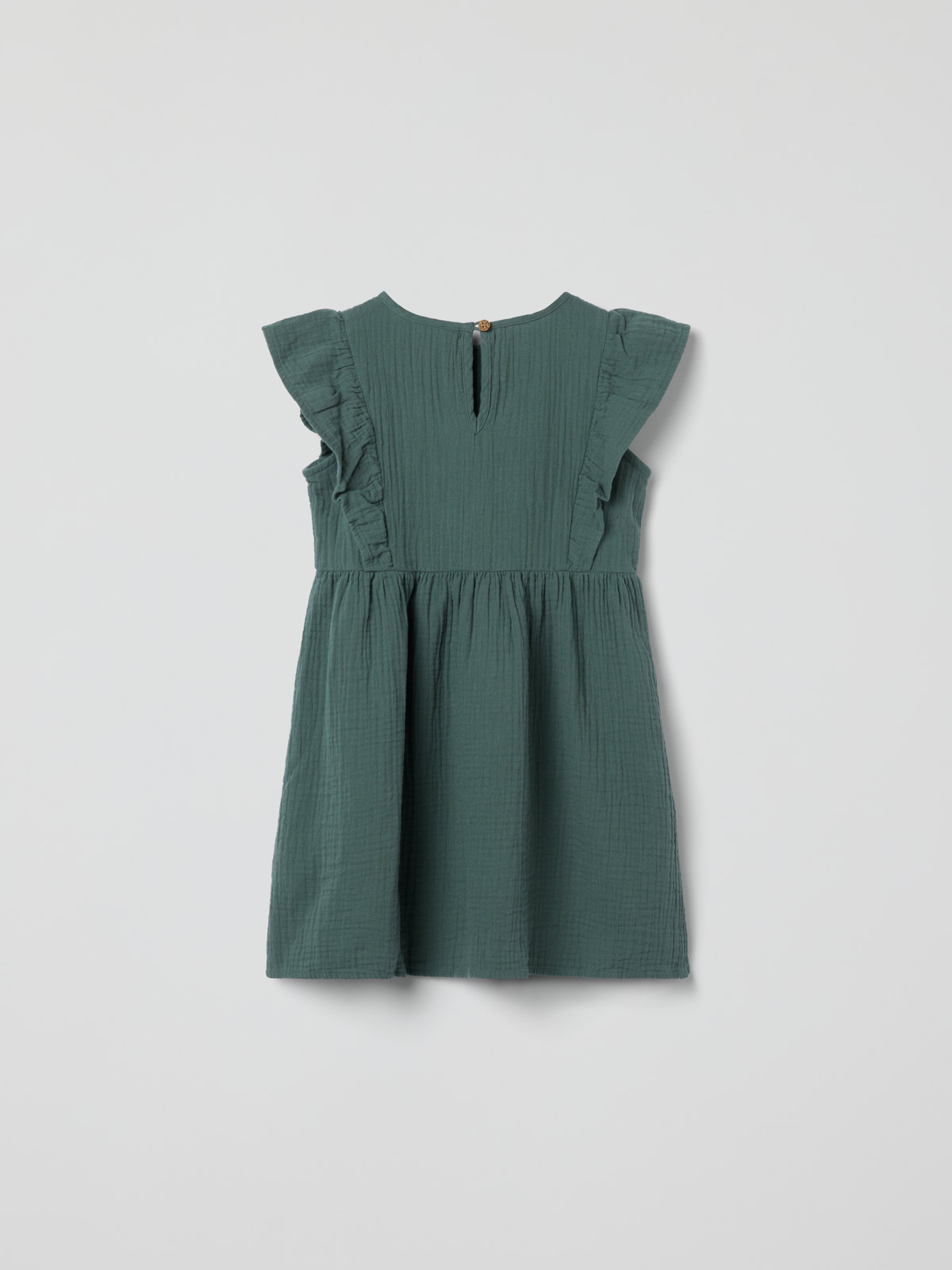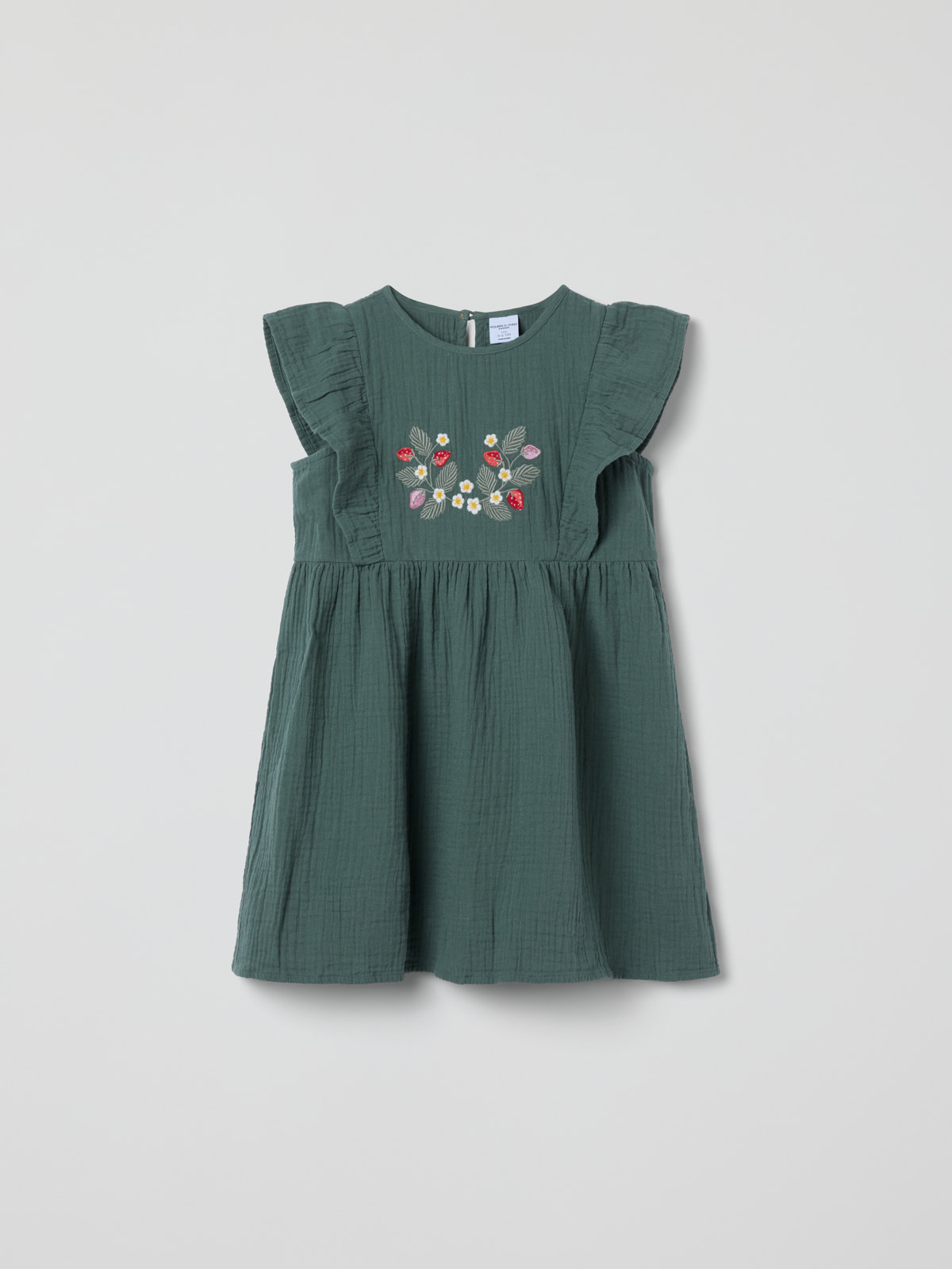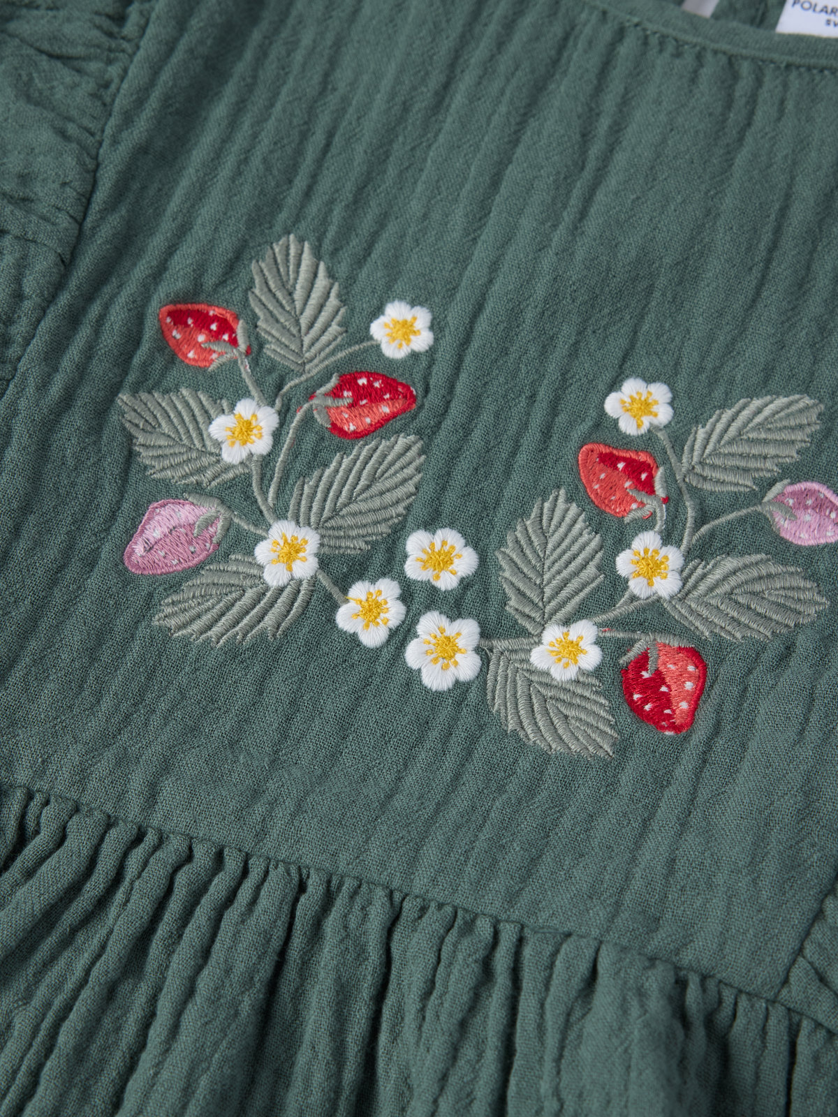 Söt klänning i mjuk muslin av 100 % ekologisk bomull – en självklarhet på sommarens festligheter! Klänningen har mjuka volanger över axlarna och fin brodyr på bröstet. Den stängs med knapp i ryggen.
