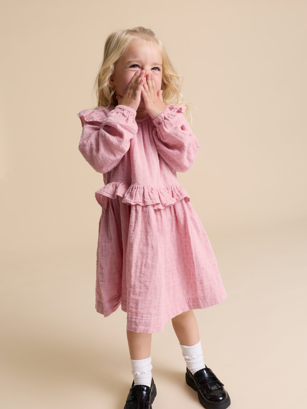 Söt muslinklänning i 100% ekologisk bomull – fin för alla tillfällen! Klänningen är prydd med volanger i midjan och över axlarna och stängs med knappslå bak på ryggen. Ärmarna har elastik i nederkant.