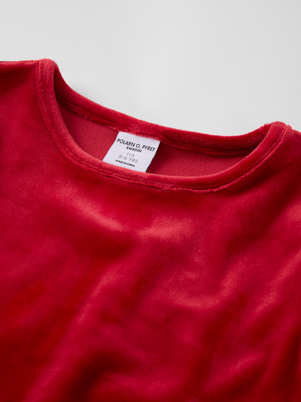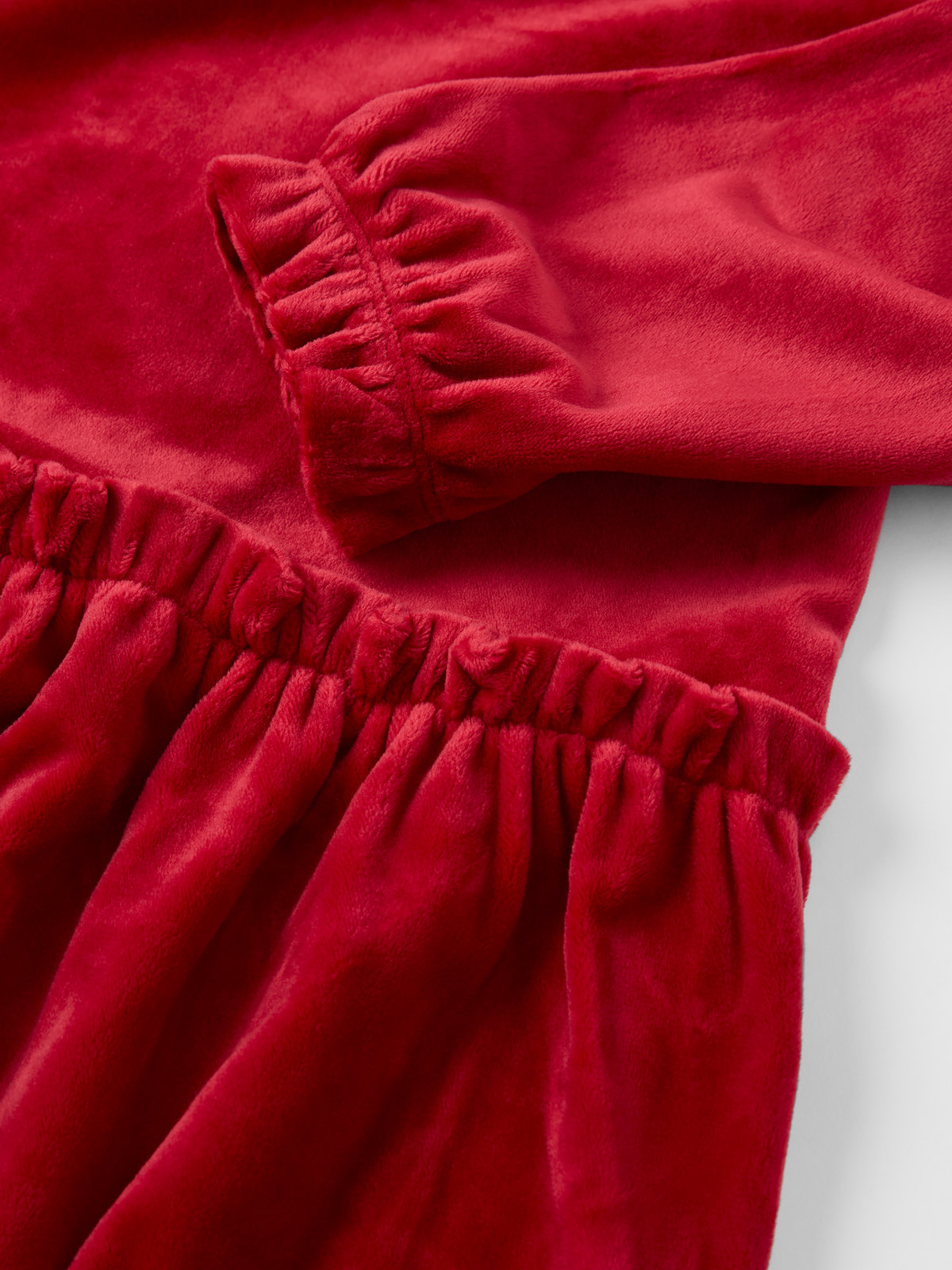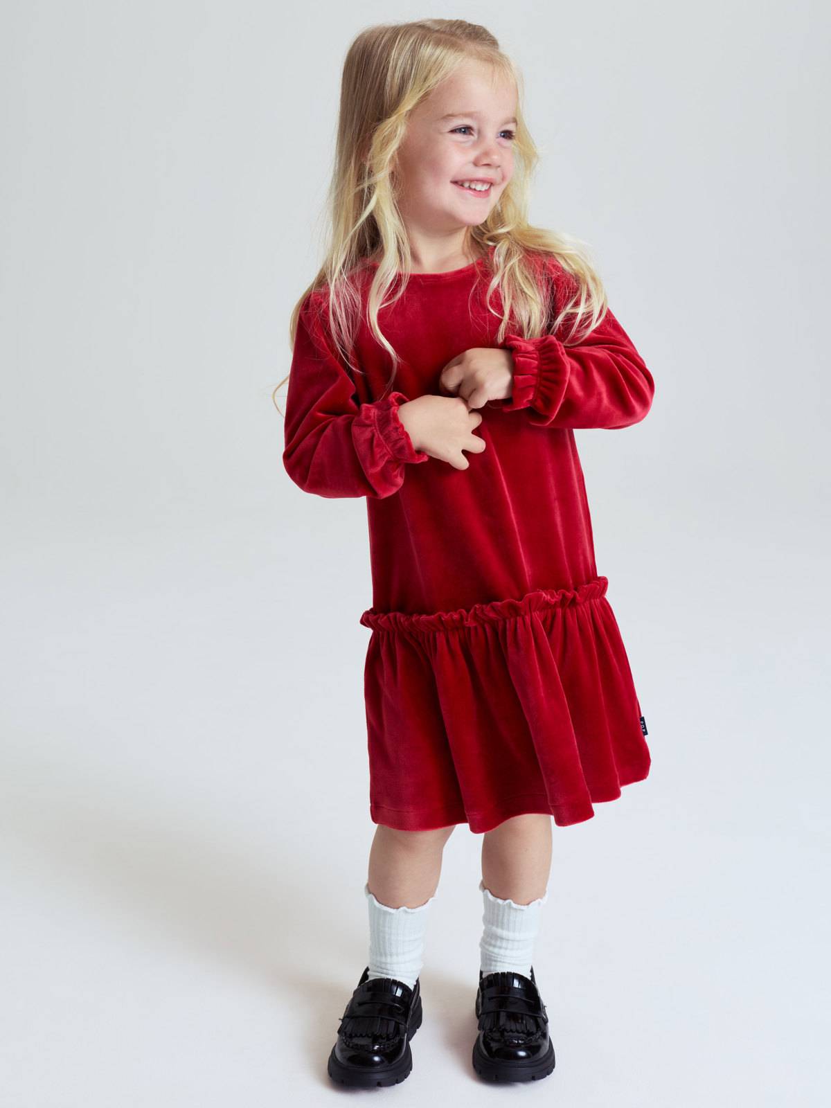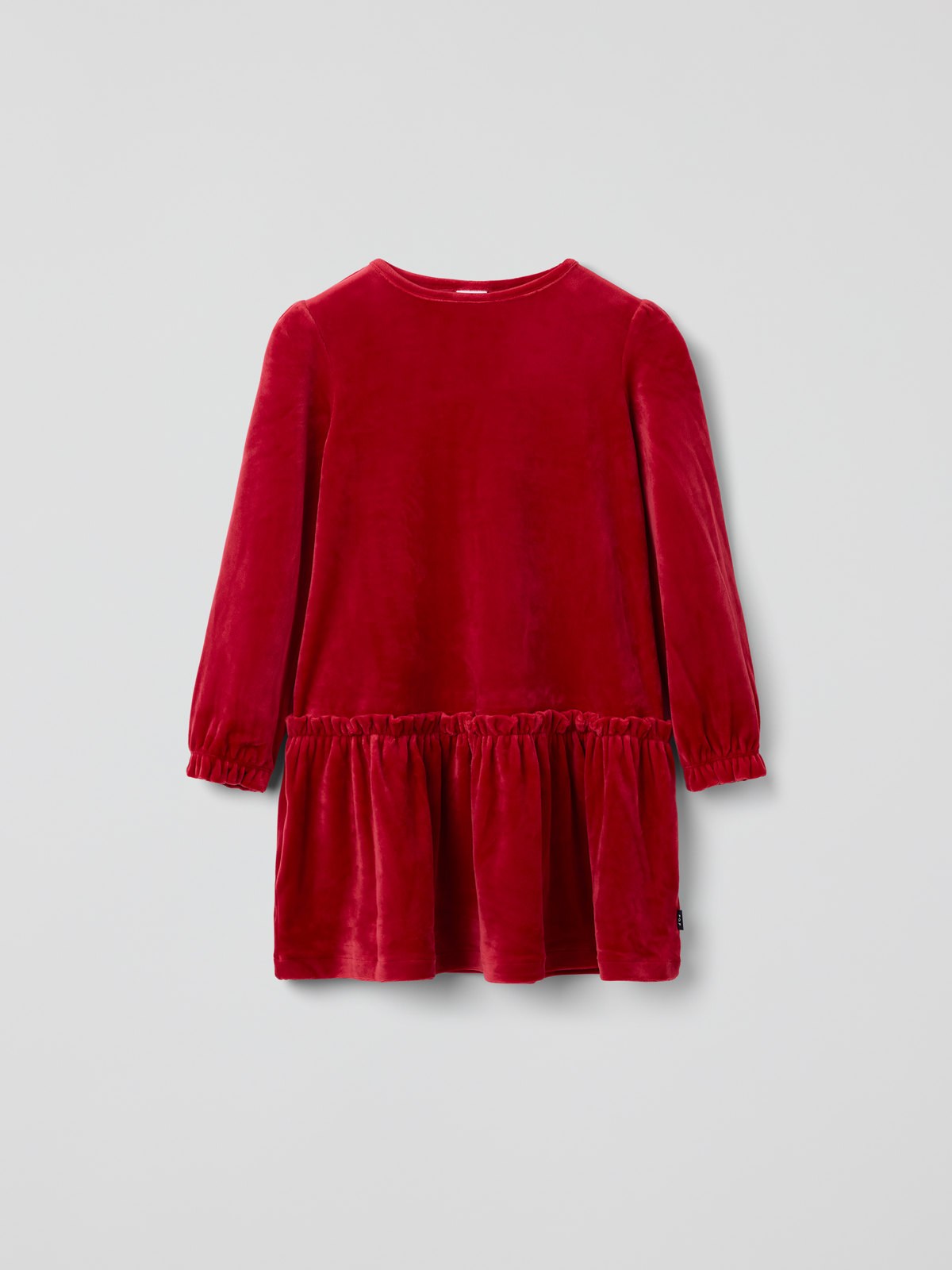 Klänning i mjuk velour tillverkad av återvunnen polyester. Klänningen har låg midja med volang, rynkad kjoldel och elastik med mjuka volanger i ärmslut.