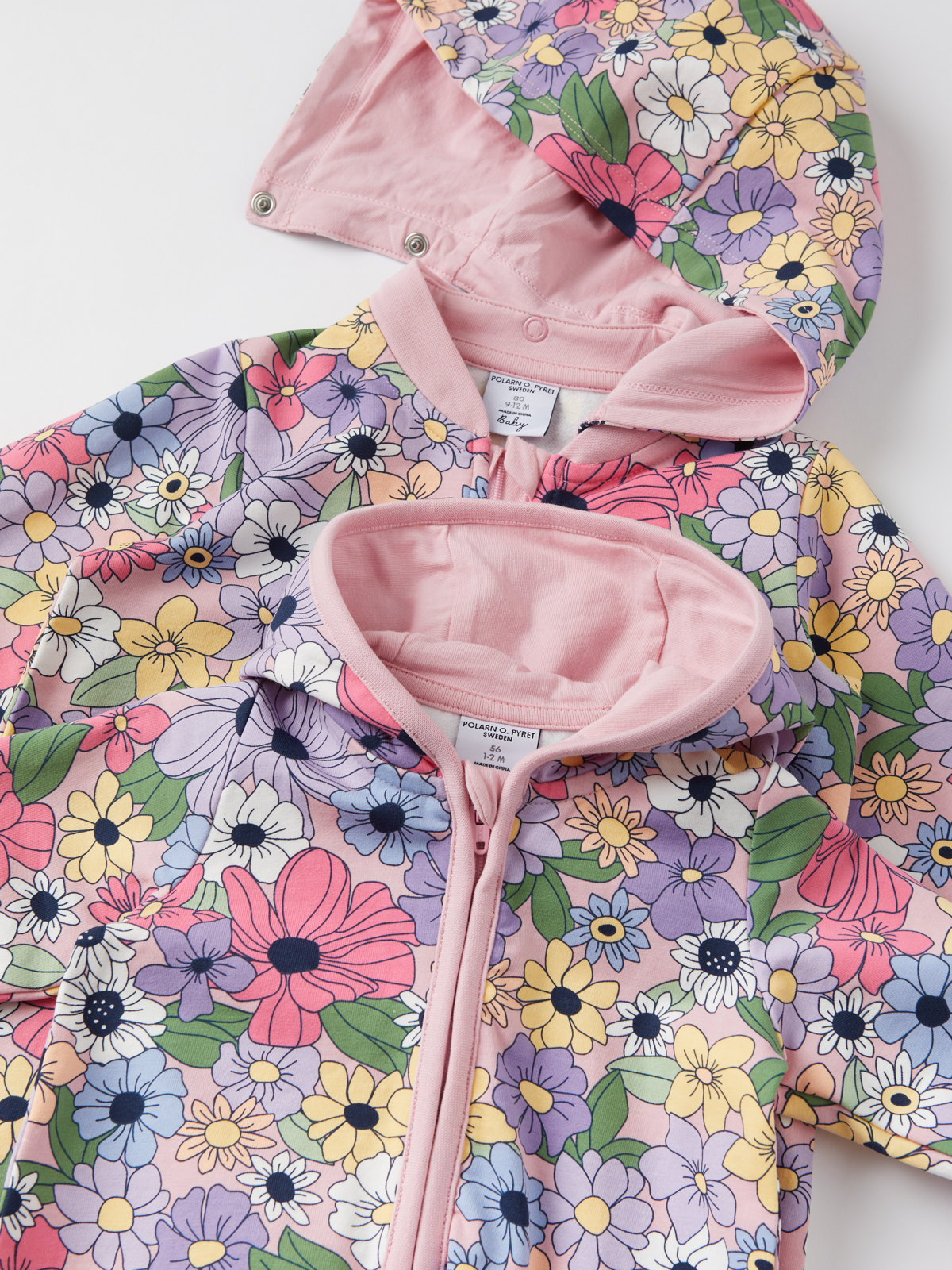 Overallen är helmönstrad med blommor och har en fast huva som är fodrad med mjuk bomullstrikå.