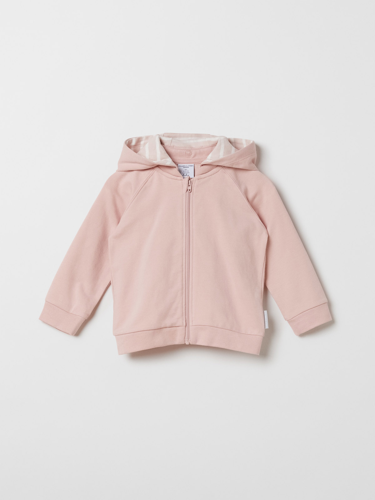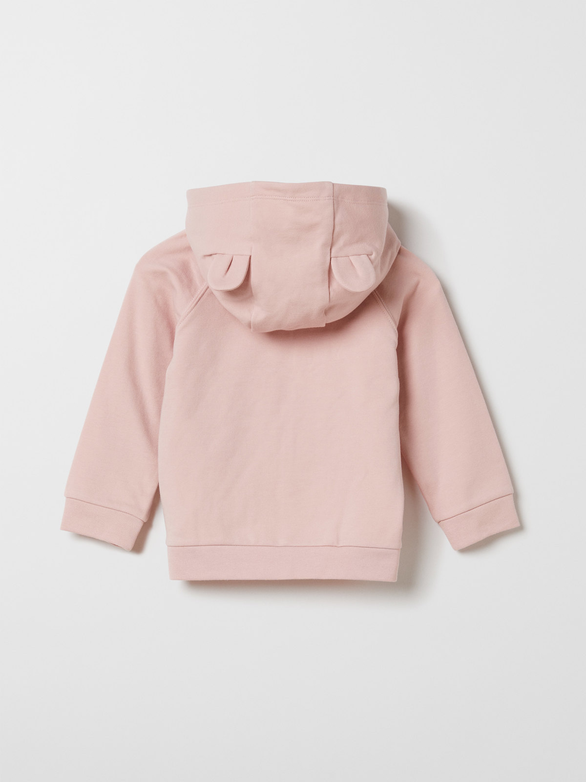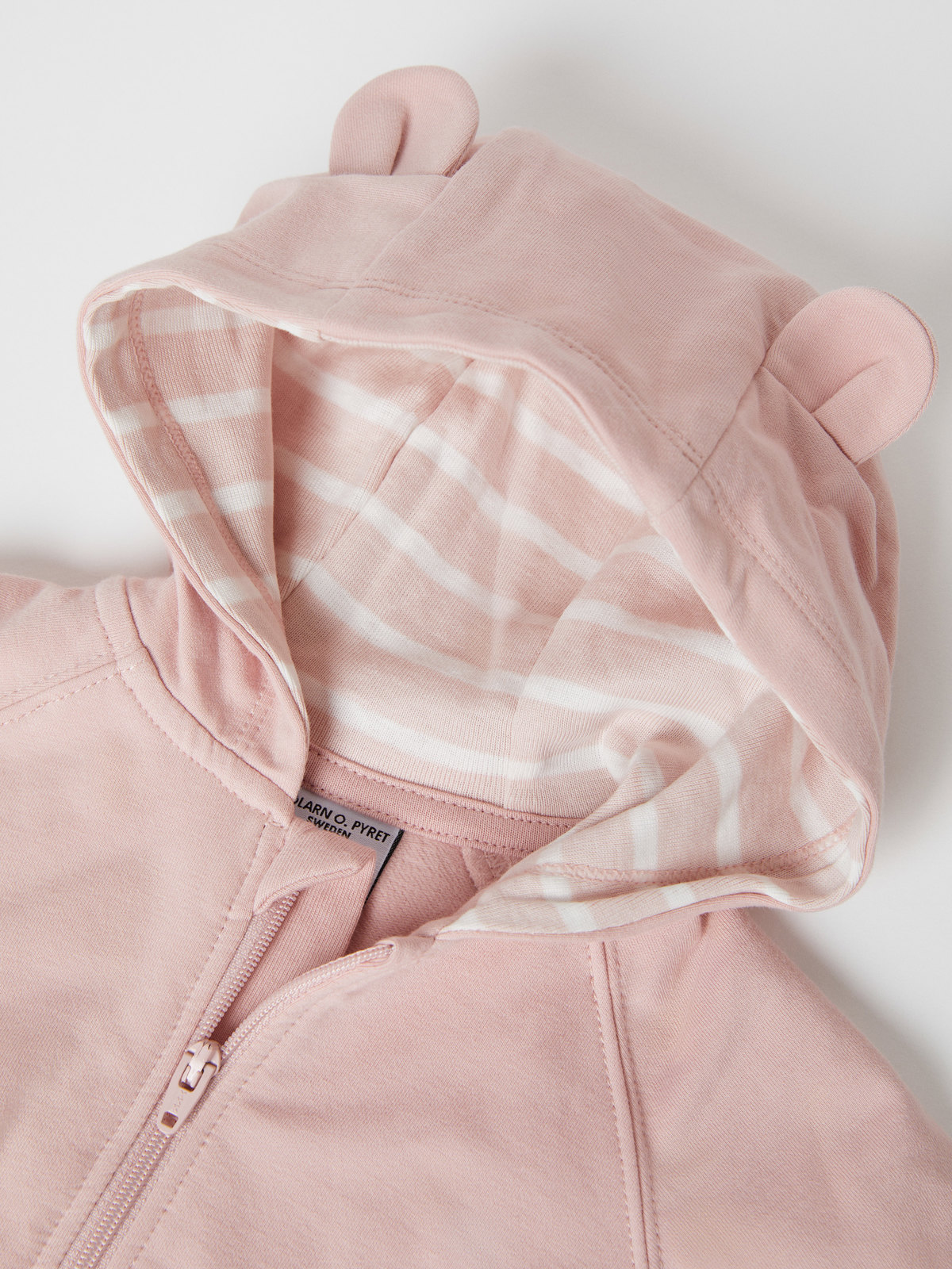 Hoodien har en huva med små påsydda öron och är fodrad med randig trikå.
