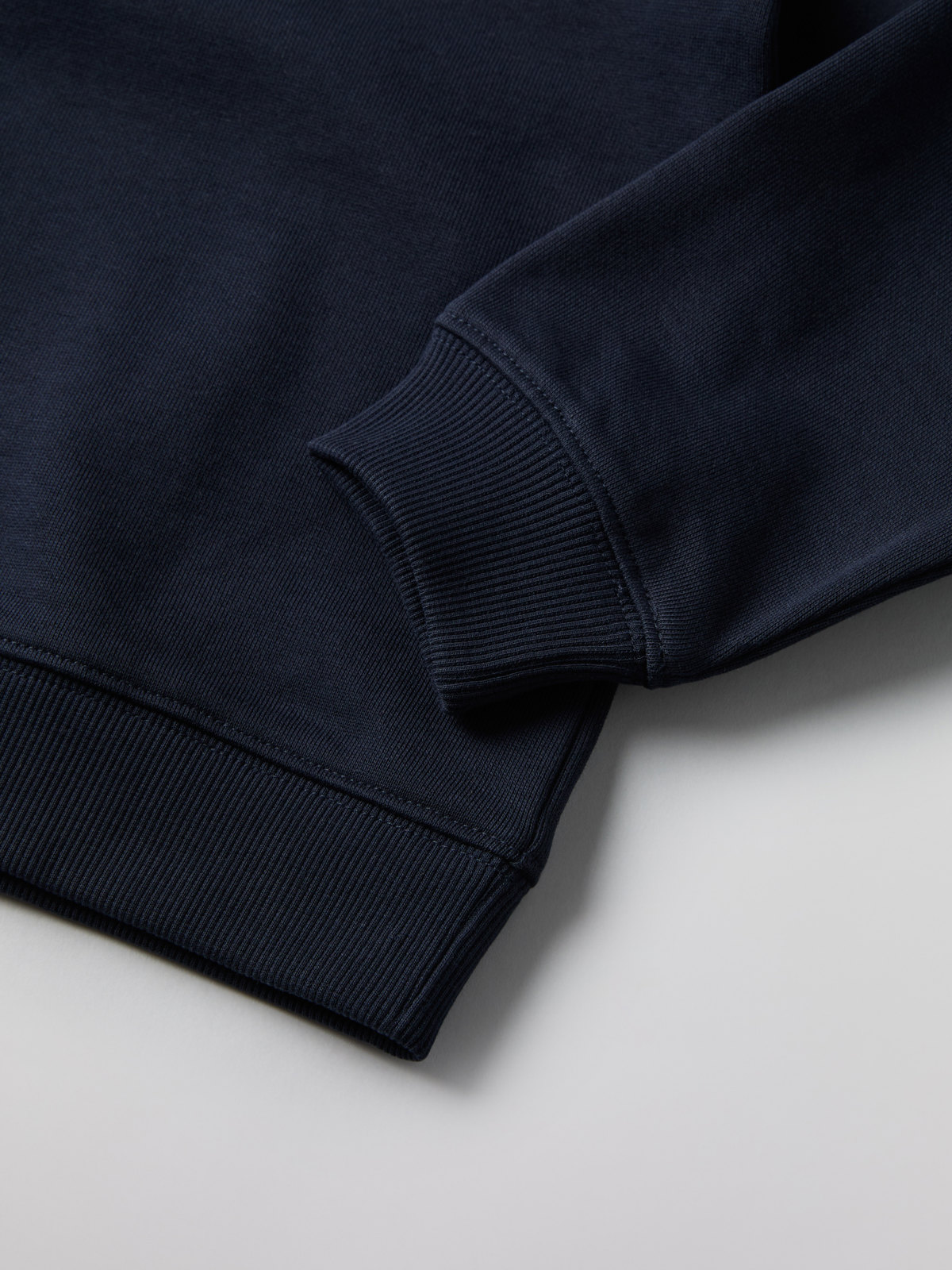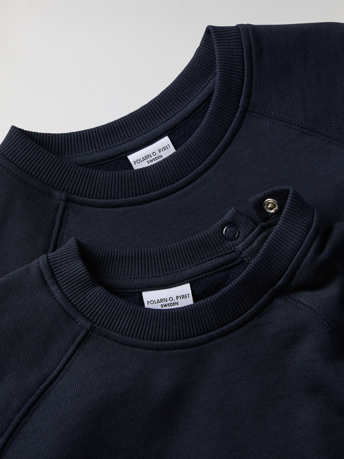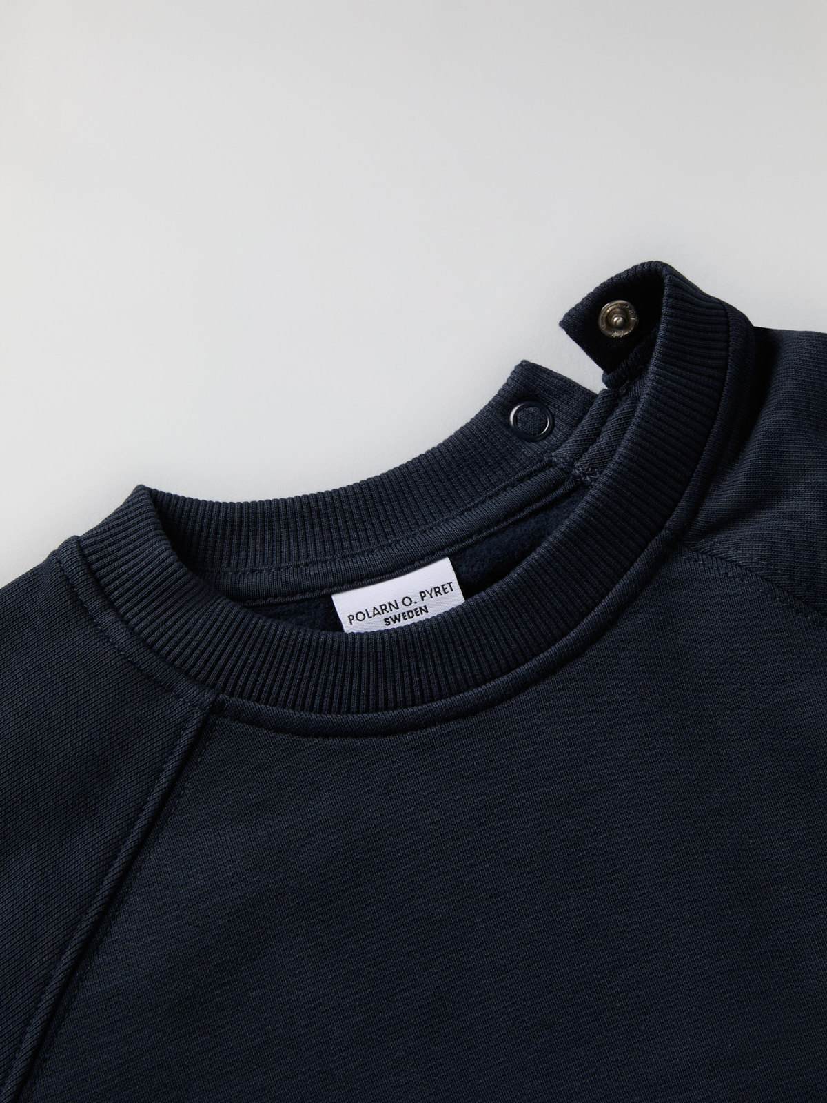 En enfärgad sweatshirt i 100 % ekologisk bomull. Ett perfekt plagg att ha till förskolan! Tröjan har mjuk ribbad mudd vid ärmslut och i nederkant. Storlekarna 86-92 har tryckknappar bak på ena axeln för att underlätta klädbyten.