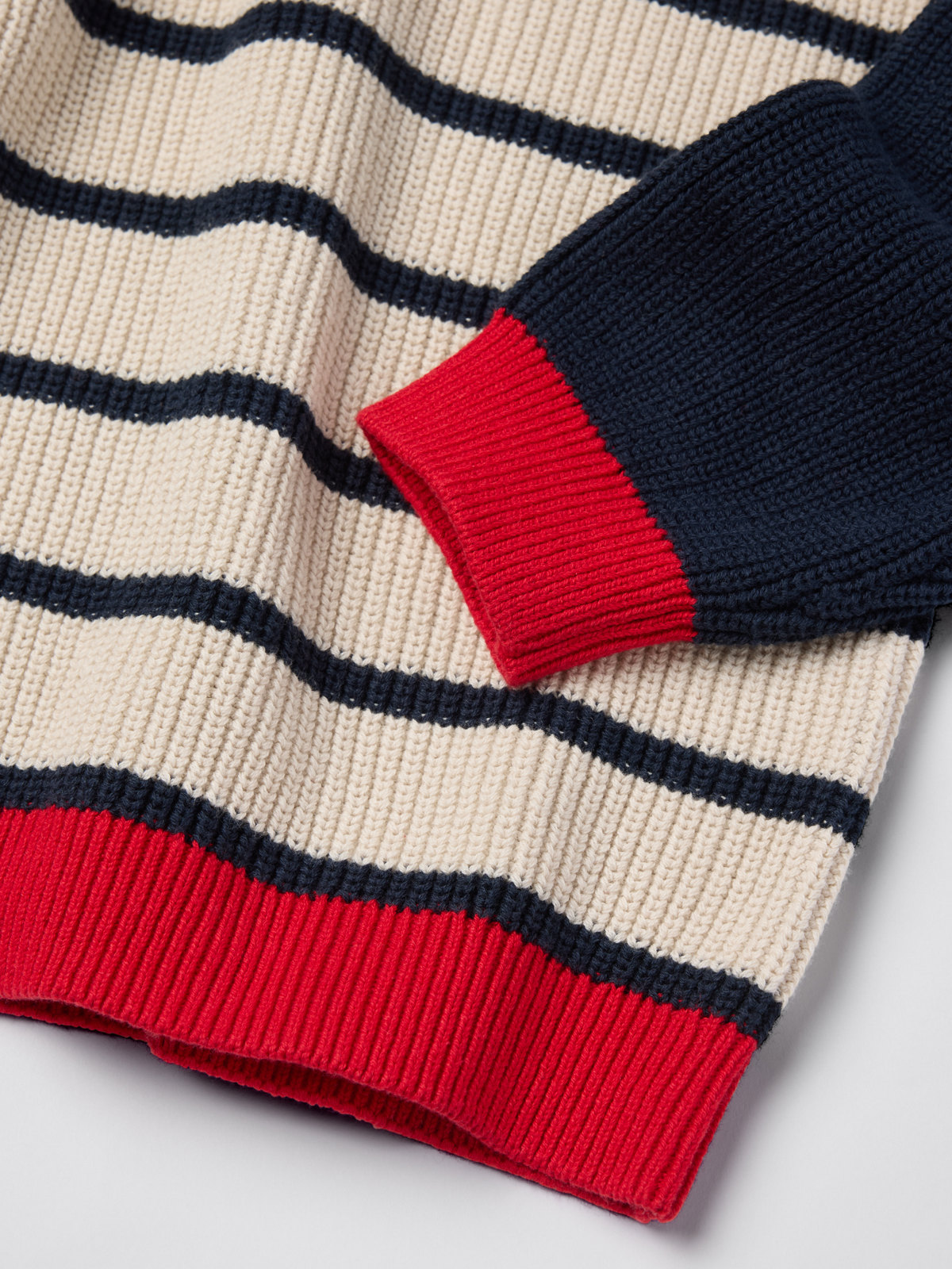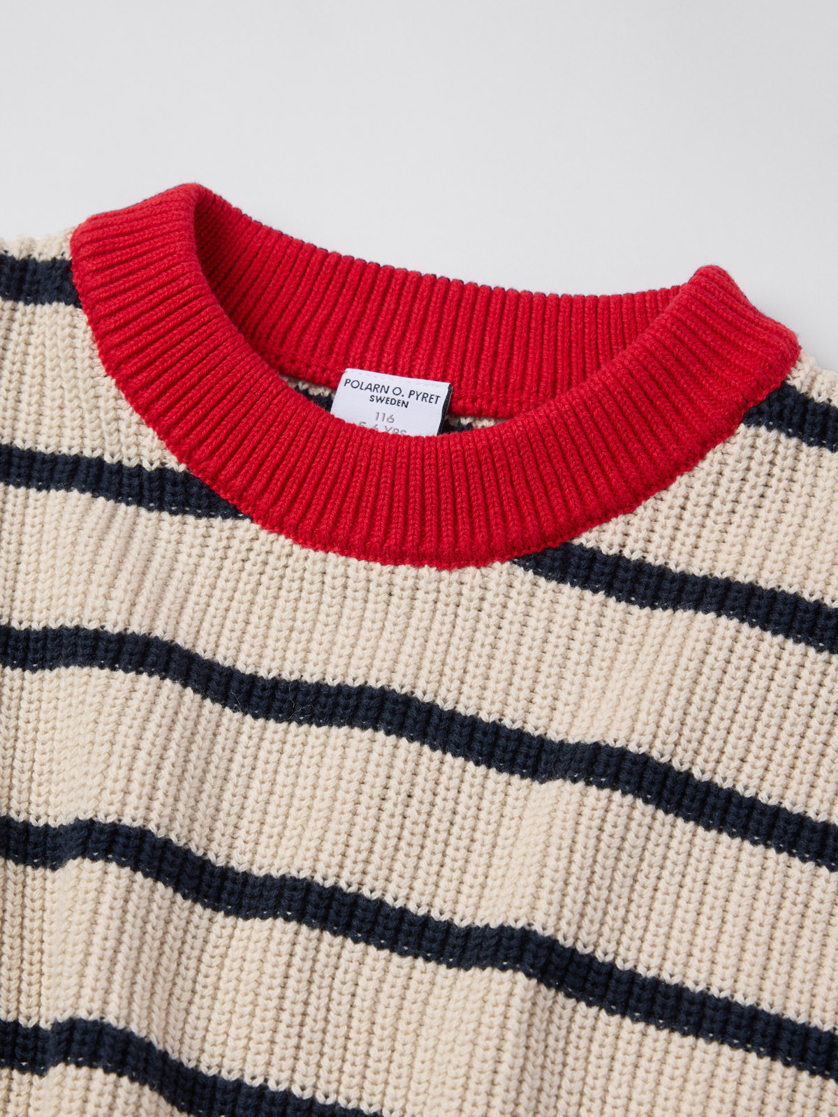 Stickad tröja i 100 % ekologisk bomull – en riktigt mysig höstfavorit! Tröjan är randig och blockfärgad. Mjuka muddar i halsringning, ärmslut och nederkant ger en skön passform.