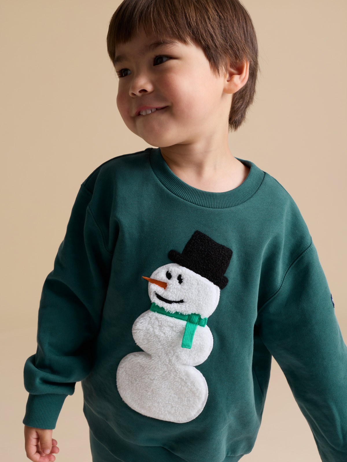 Tröja i 100 % ekologisk bomull med mjuk sweatshirtkvalitet. Tröjan har ett stort fint broderi i form av en snögubbe på framstycket samt mjuka muddar i hals, ärmslut och nederkant för skön passform.