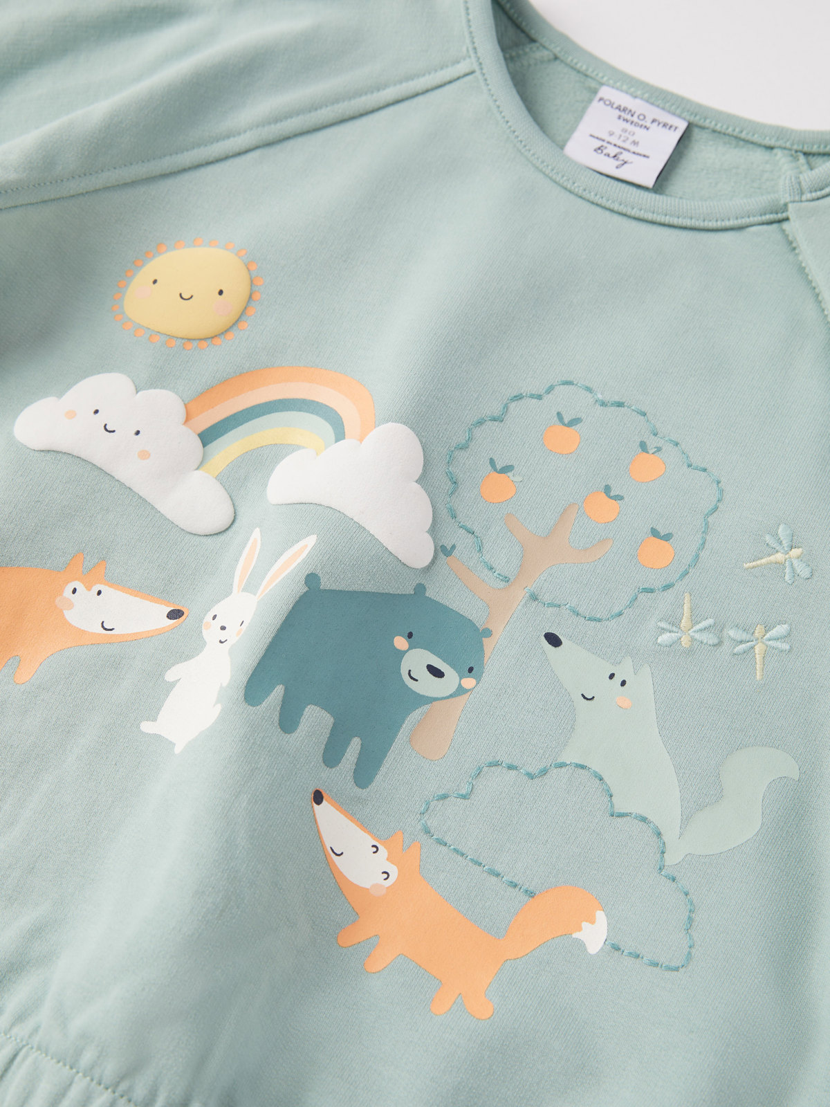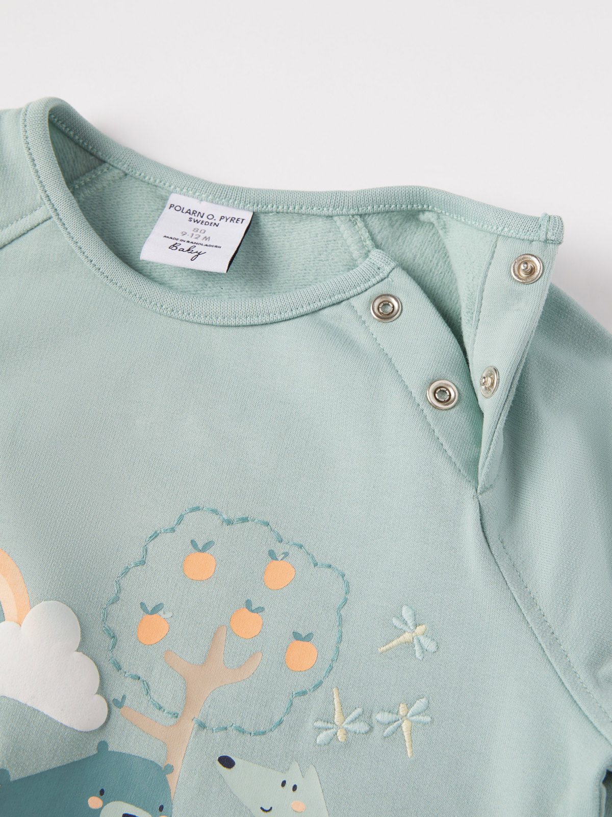 Rymlig tröja i 100 % ekologisk bomull för baby. Tröjan har ett fint tryck med broderade detaljer på framstycket och mjuka muddar vid ärmsluten.