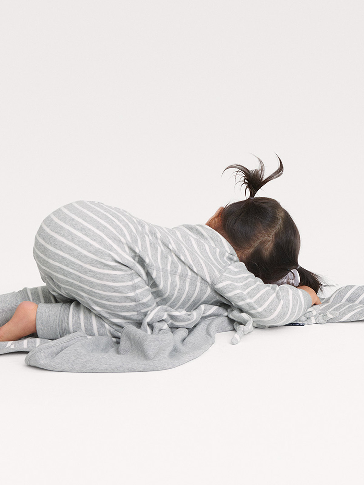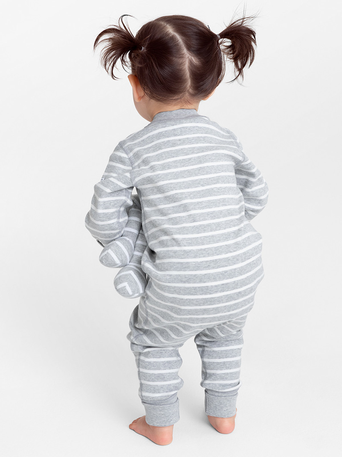 Randig overall för baby i mjuk ekologisk bomull. Overallen har vår klassiska rand och tryckknappar från hals till benslut som gör den lätt att ta på och av. Muddar är extra långa och går att vikas ned när barnet växer.