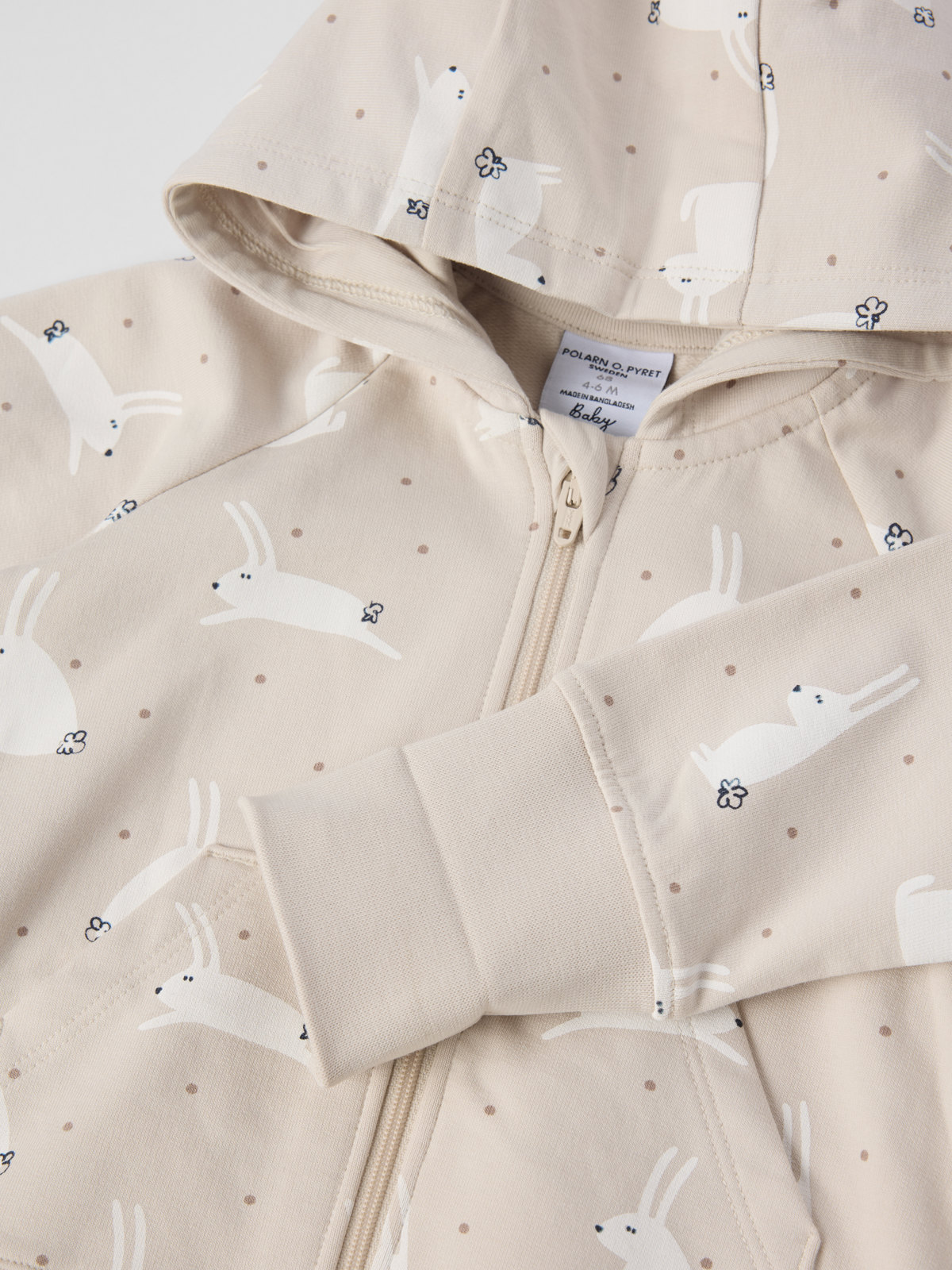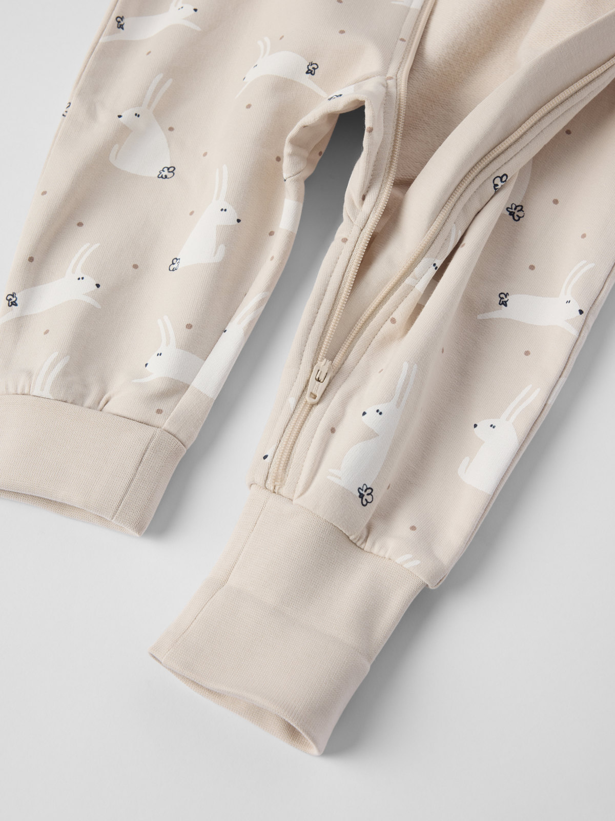 Mjuk overall i ekologisk bomull med skön sweatshirtkvalitet och borstad insida för baby. Overallen har en känguruficka och fast huva som är fodrad med mjuk bomullstrikå. Den långa dragkedjan från hals till benslut underlättar klädbyten och har ett skydd högst upp för att inte skava mot haka och kind. Overallen har extra långa, ribbade muddar vid ärm- och benslut, som går att vika ned allt eftersom barnet växer.