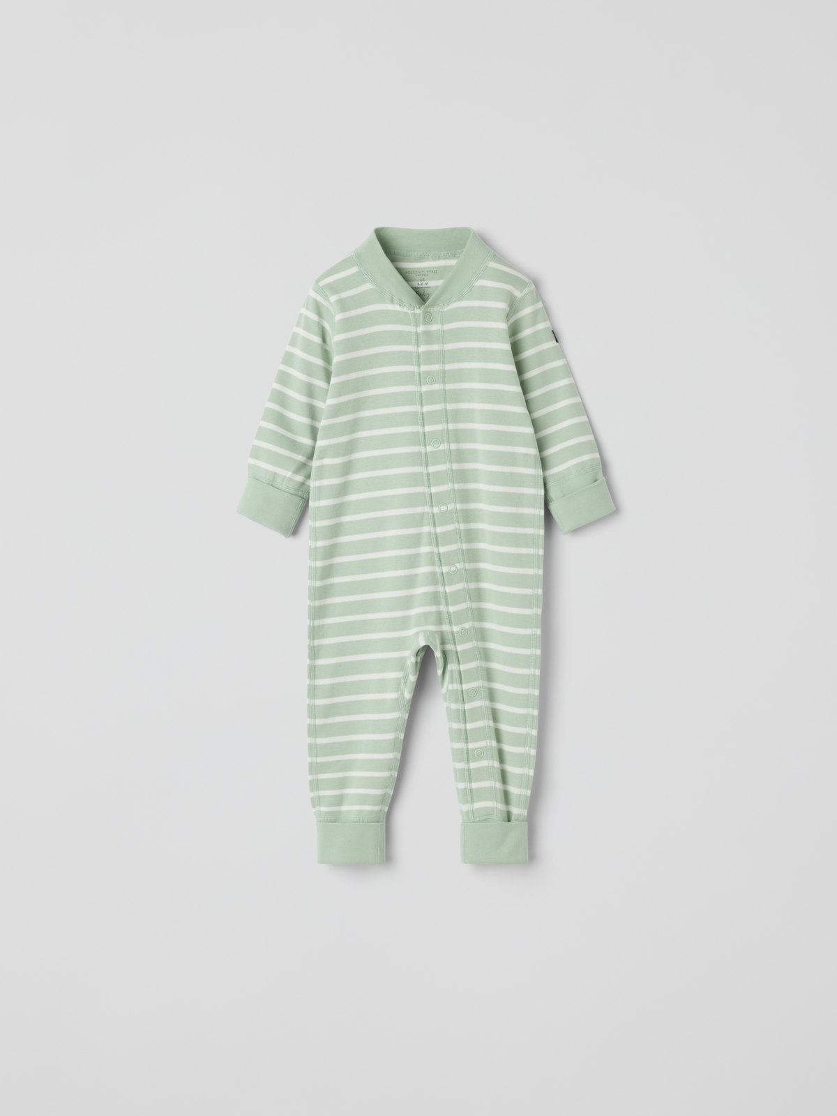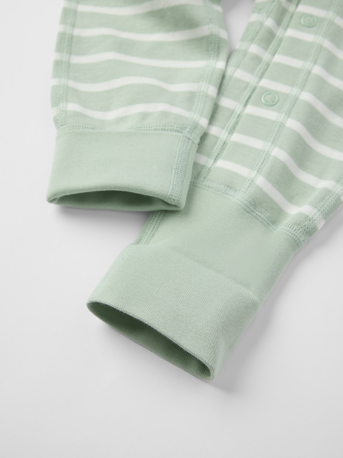Vår klassiska randiga overall i mjuk ekologisk bomull – perfekt som både pyjamas och mysplagg! Overallen är sydd med extra mjuka, platta sömmar som är skonsamma mot känslig hud. Muddarna vid ärm- och benslut är extra långa och går att vika ned allteftersom barnet växer. Den långa knappslån från hals till benslut underlättar klädbyten.