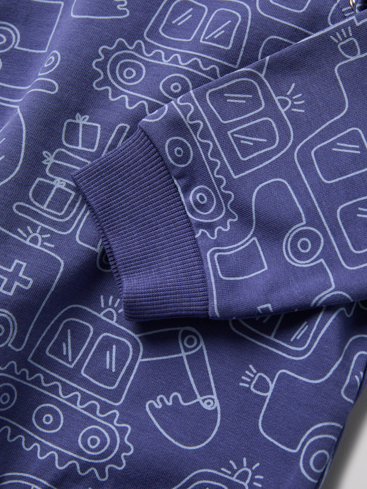 Rymlig tröja i 100 % ekologisk bomull med skön sweatshirtkvalitet, för baby. Tröjan är helmönstrad med bilar och har mjuka muddar vid ärmsluten.