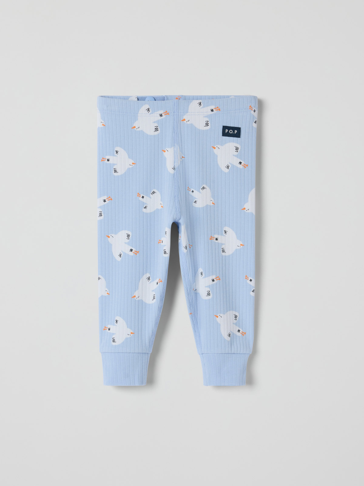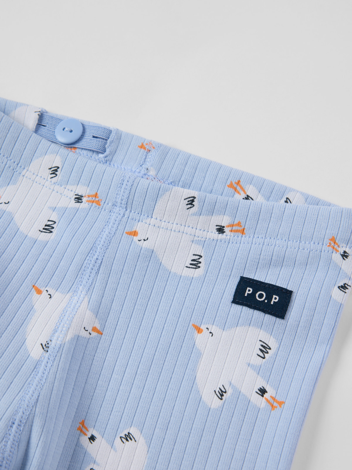 Ribbad byxa i mjuk ekologisk bomull för baby. Byxan är sydd med extra mjuka, platta sömmar som inte skaver mot känslig hud och har mjuka muddar i benslut och justerbar midja med knapphålsresår.