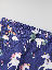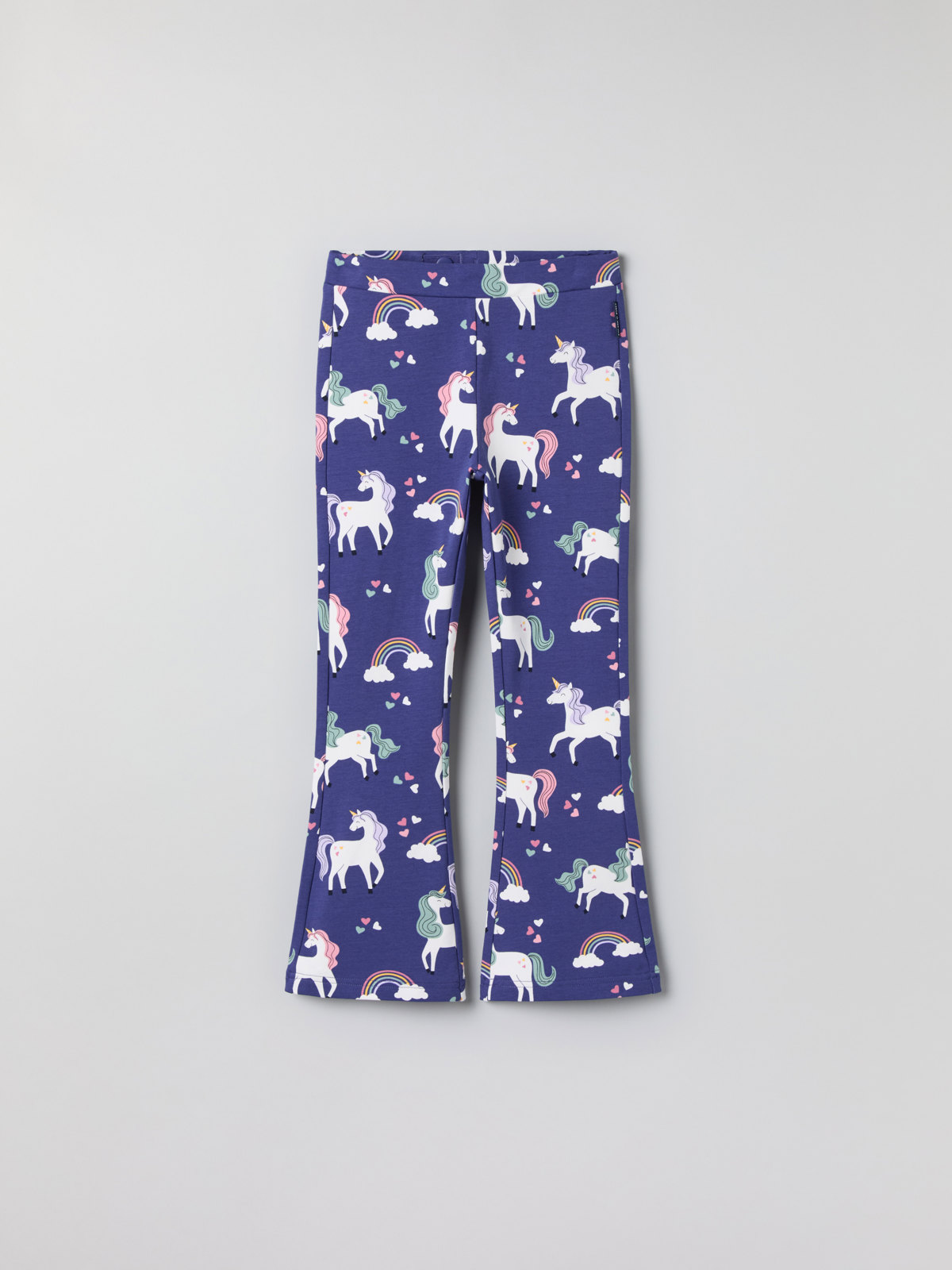 Byxan är helmönstrad med enhörningar och har elastisk midja som går att justera med knapphålsresår. Bensluten är utsvängda.