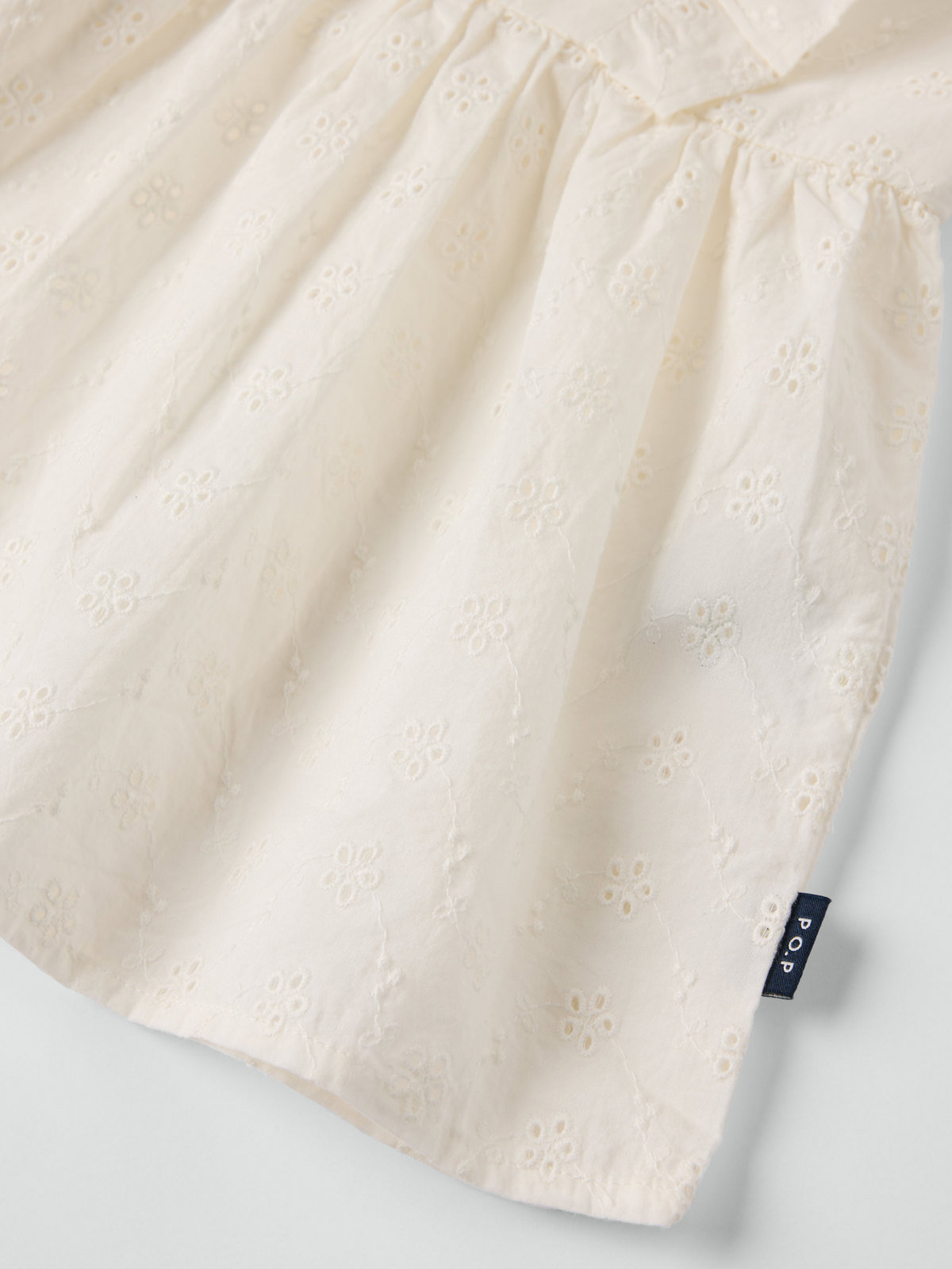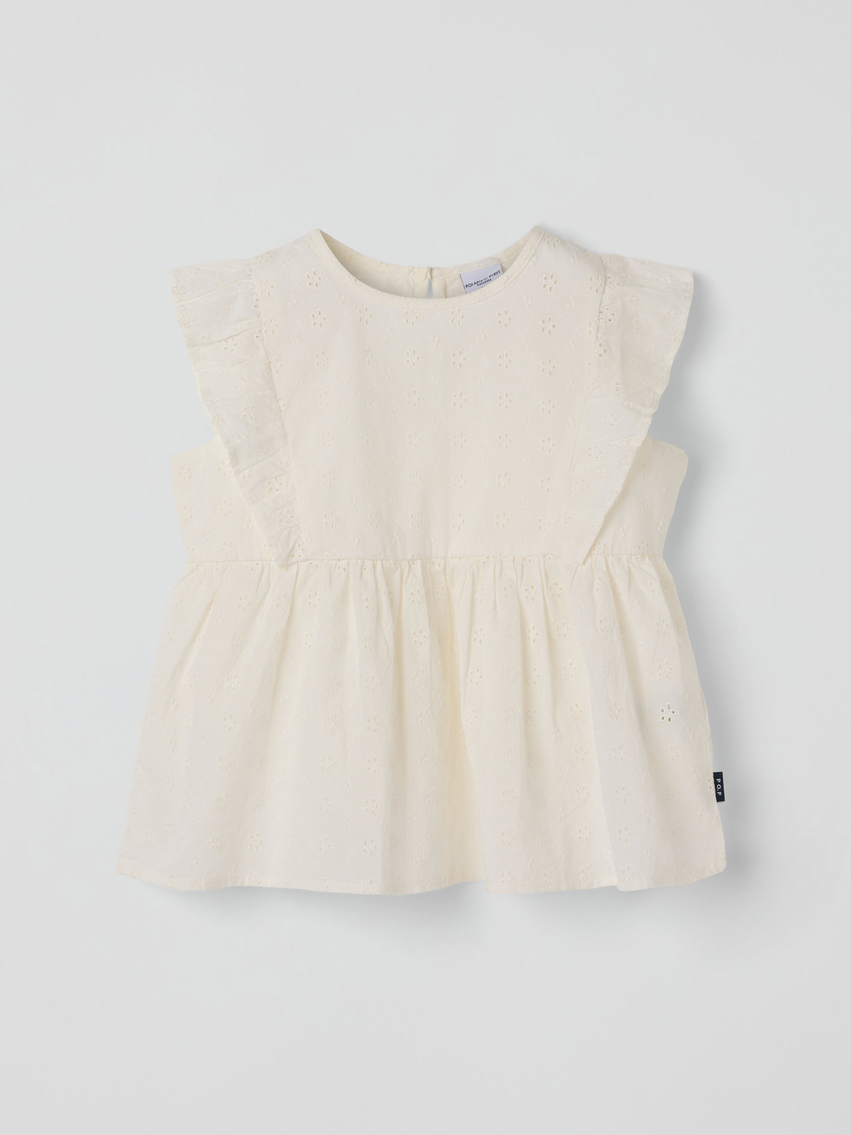 Söt topp i tunn och mjuk muslin av ekologisk bomull – en självklarhet på både skolavslutning och sommarfest! Toppen har mjuka volanger över axlarna och rynkad nederkant med fint fall. Den stängs med knapp i ryggen.