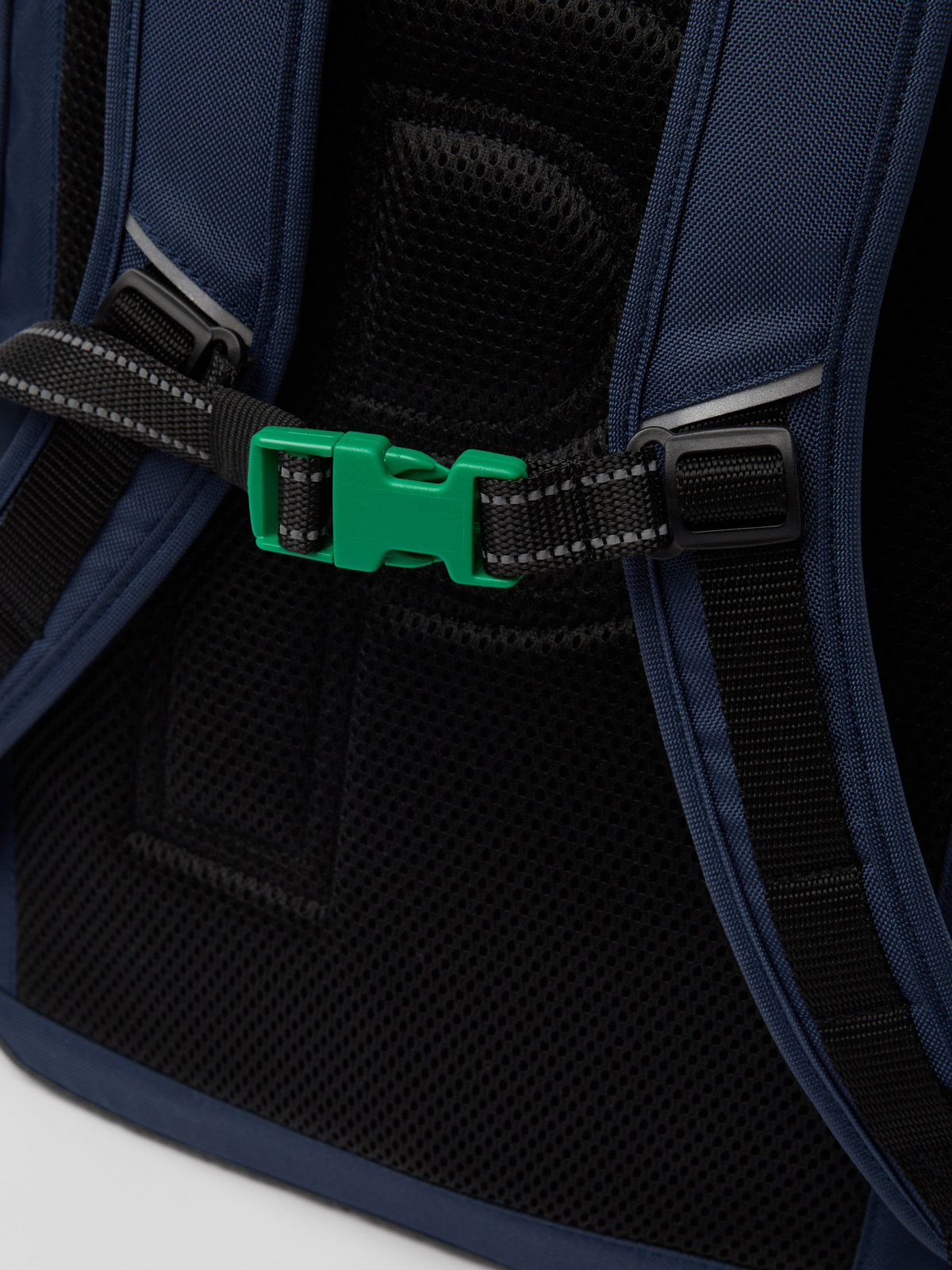 Ryggsäcken har mjuk ryggpanel i mesh och justerbar bröstrem med självutlösande spänne ifall man fastnar. Bröstremmen hjälper till att fördela vikten. Ryggsäckens mått passar A4 perfekt och har flera smarta fack både utvändigt och invändigt för alla viktiga saker, samt reflexdetaljer för god synlighet. Med en packvolym på 18 L passar den perfekt för barn i förskoleåldern och uppåt. Måttanpassat sittunderlag ingår!