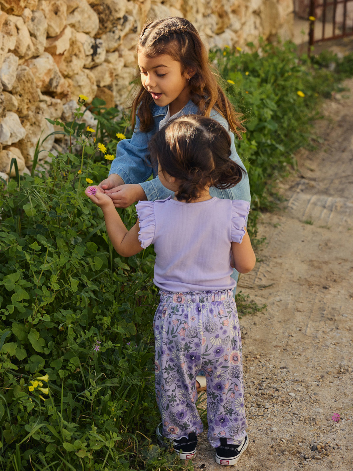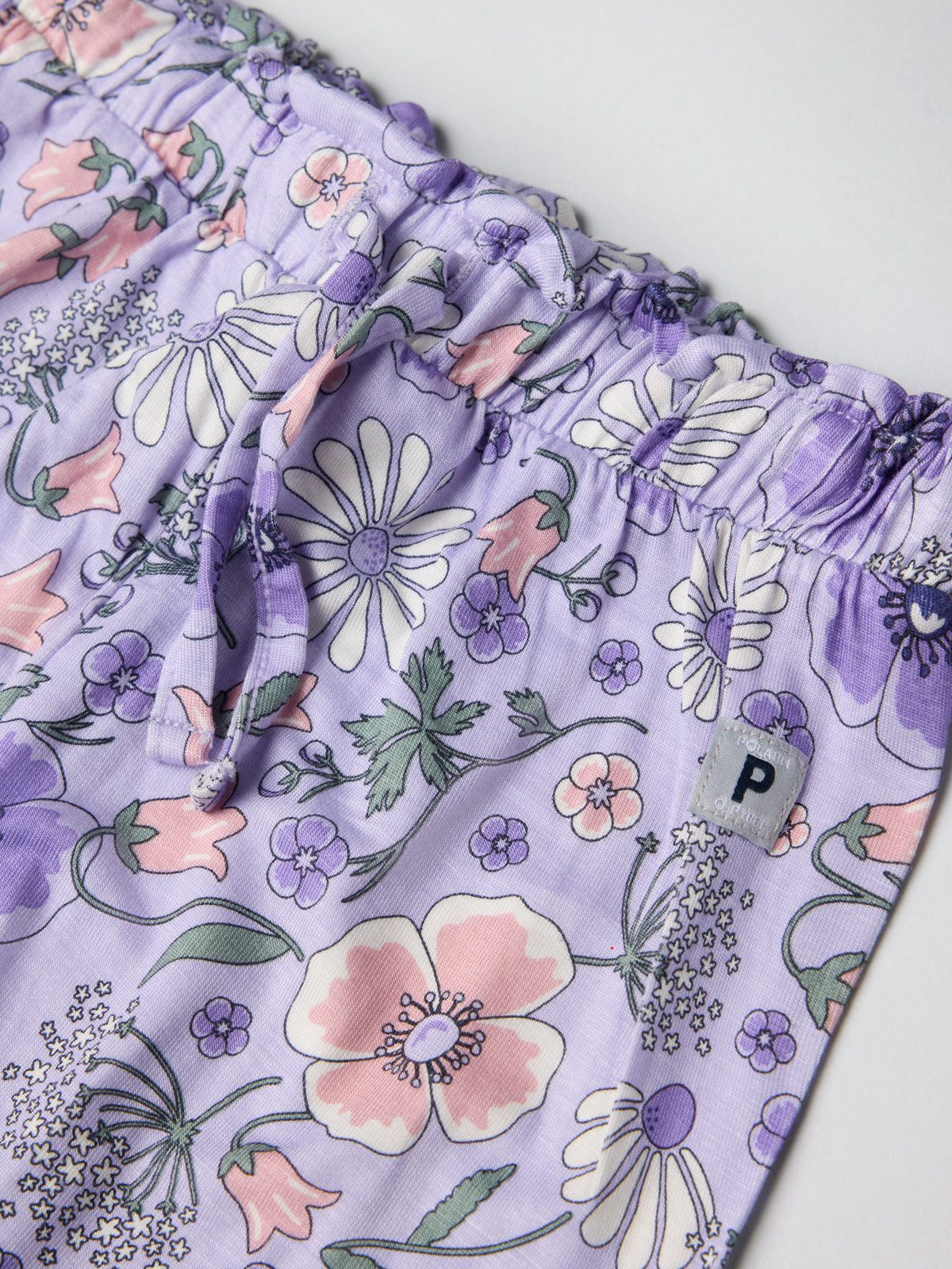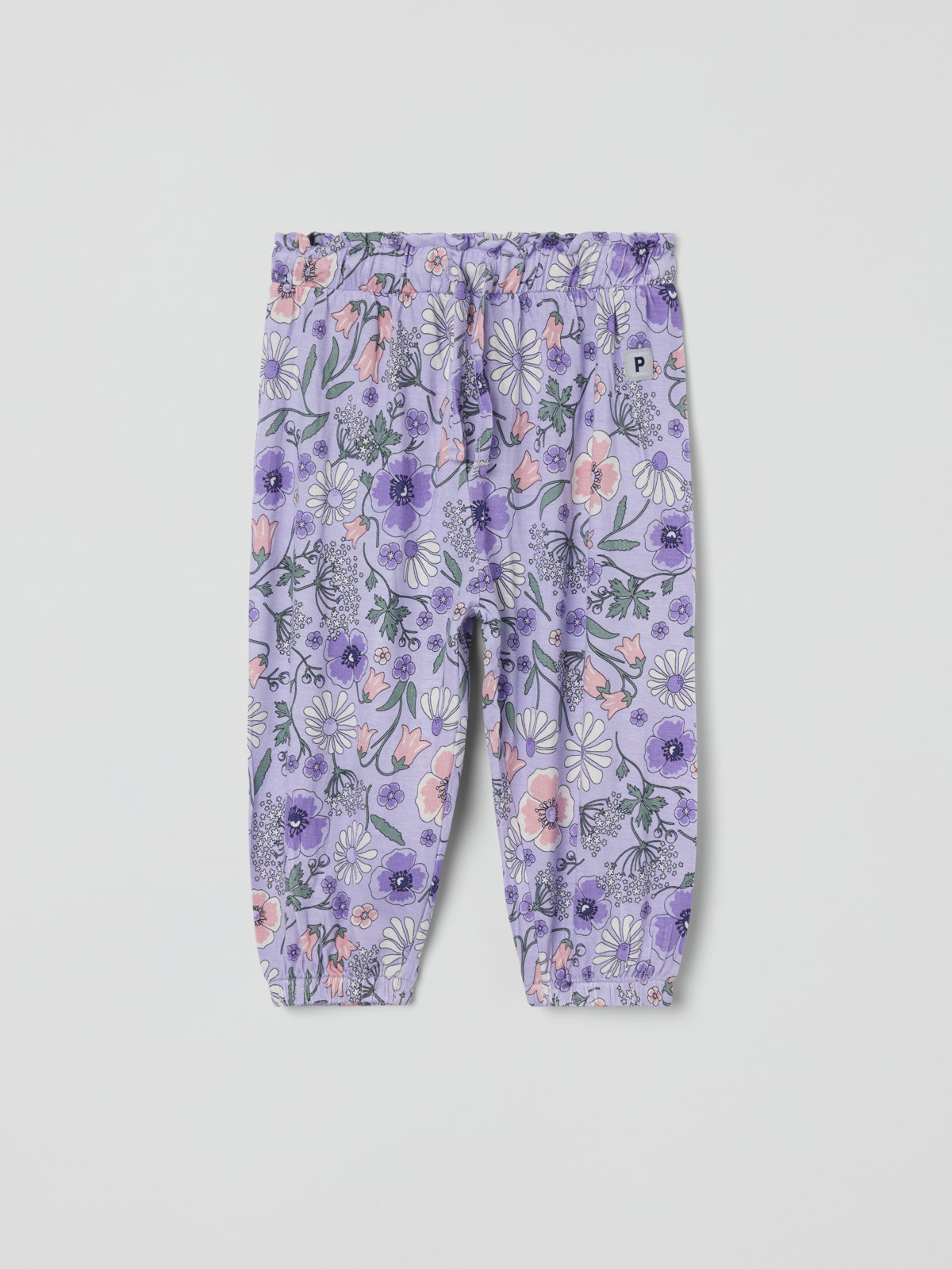Blommig byxa tillverkad i tunn och sval trikå av Ecovero™ Viscose för baby – perfekt för varma dagar! Byxan har elastisk midja och benslut för skön passform.