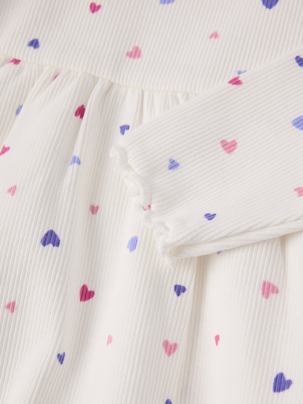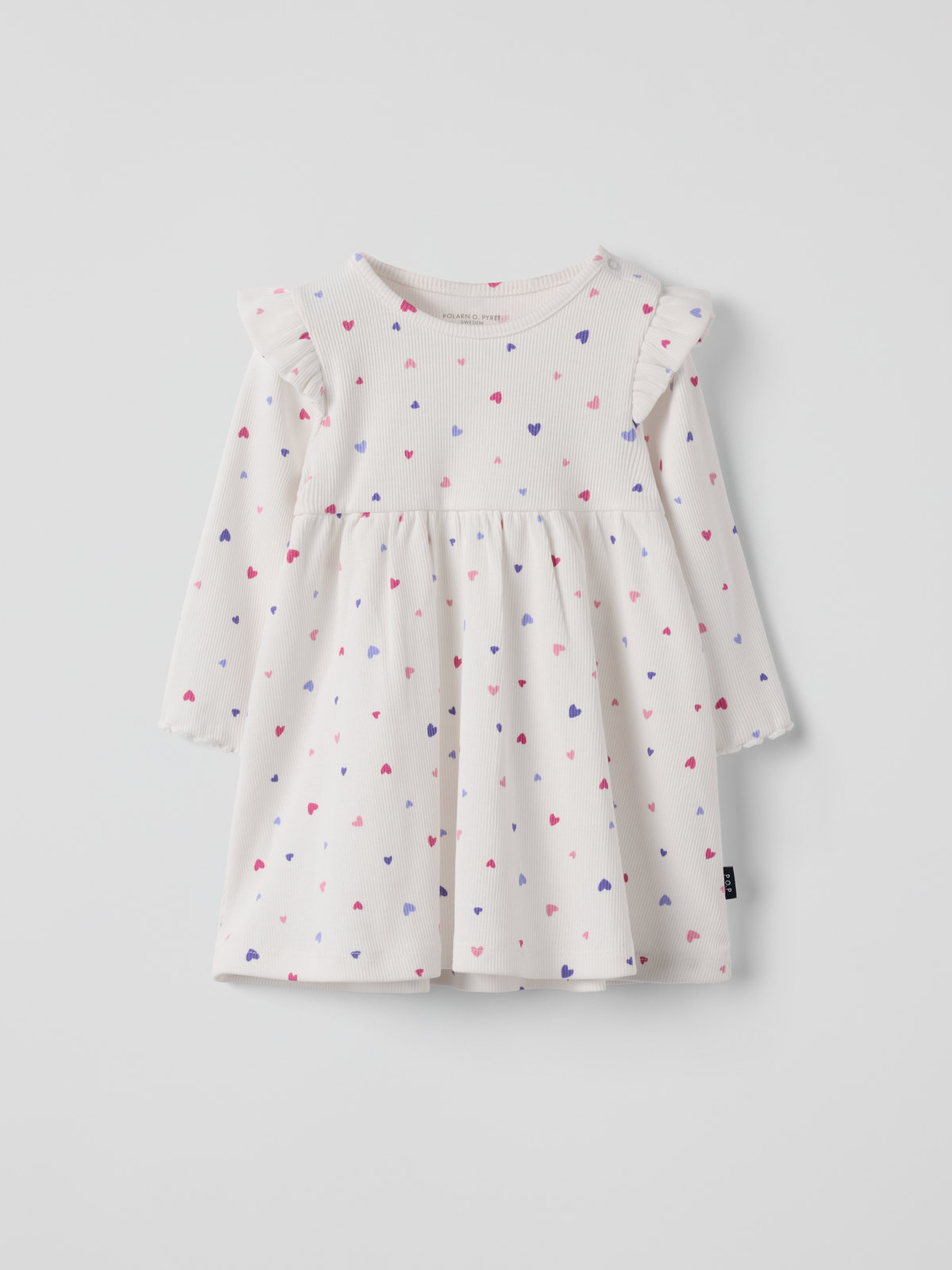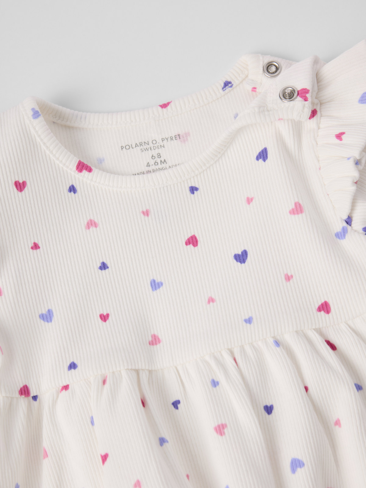 Mjuk ribbad klänning i ekologisk bomull för baby. Klänningen helmönstrad med små hjärtan och prydd med små volanger över axlarna.
