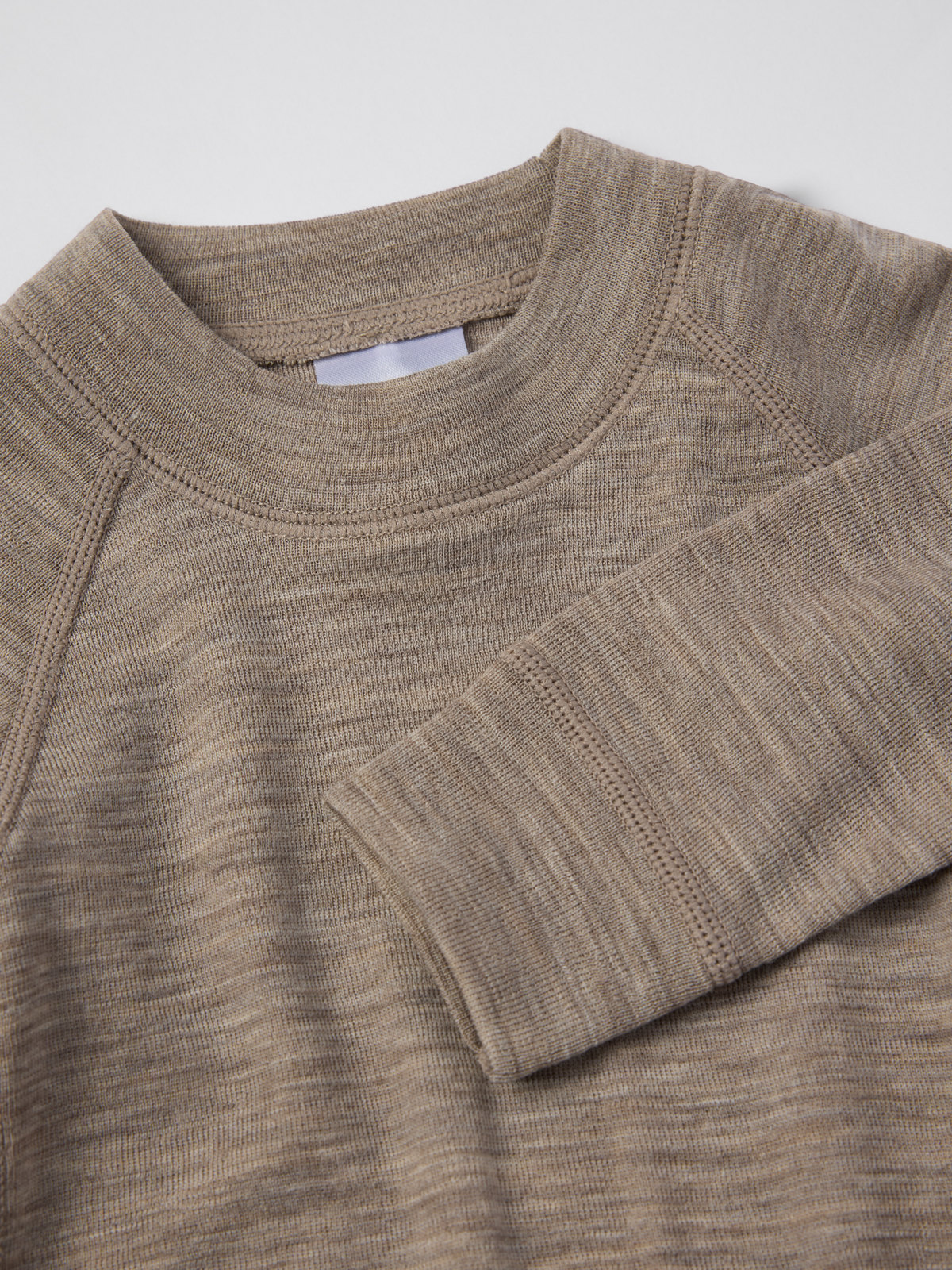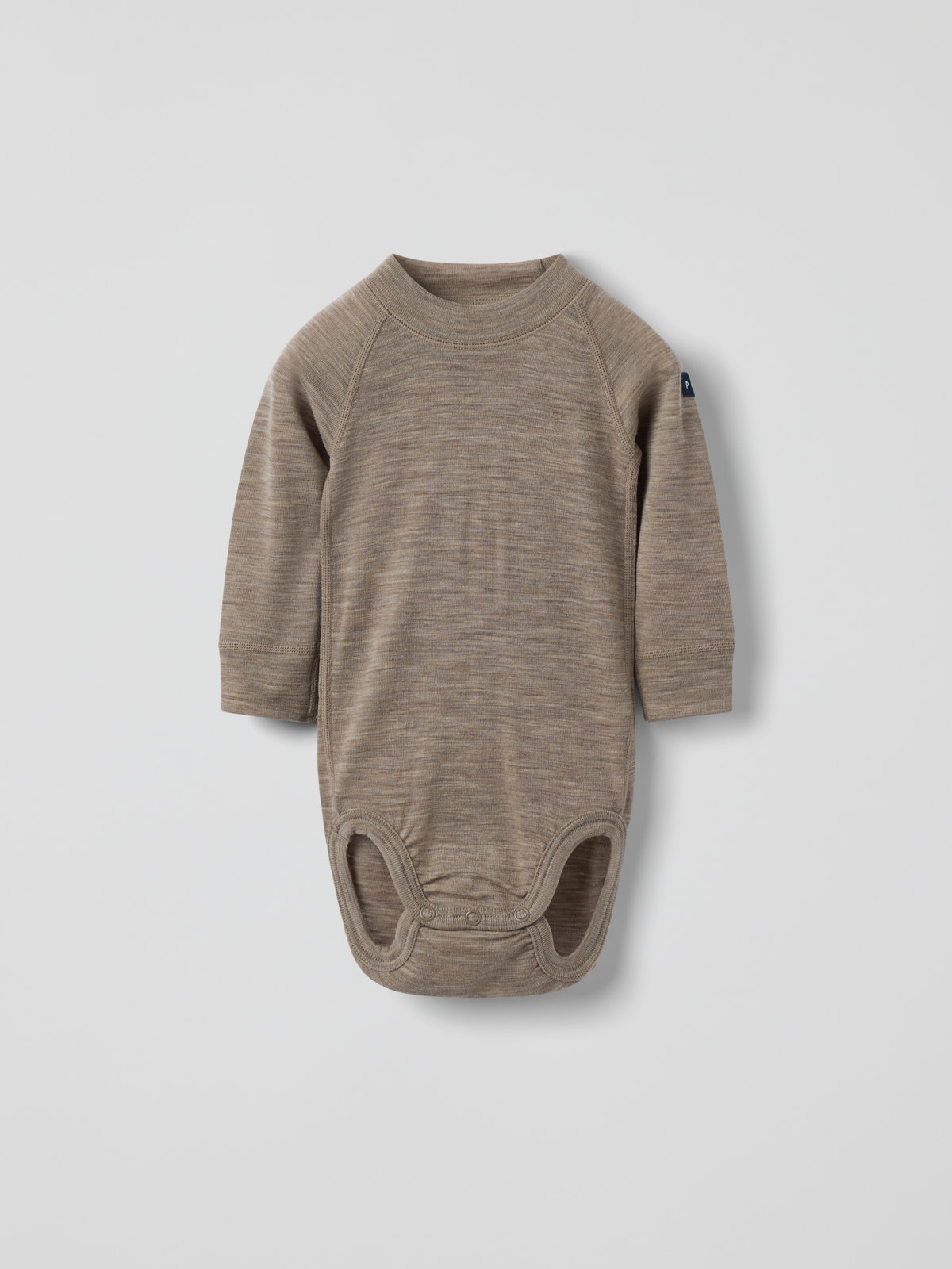 Långärmad body i värmande merinoull för baby. Ett perfekt förstalager under vinteroverallen! Merinoullen värmer även i blött tillstånd och hjälper till att reglera kroppstemperaturen. Bodyn är sydd med extra mjuka sömmar som inte skaver och har tryckknapparna i grenen för att underlätta kläd- och blöjbyten.