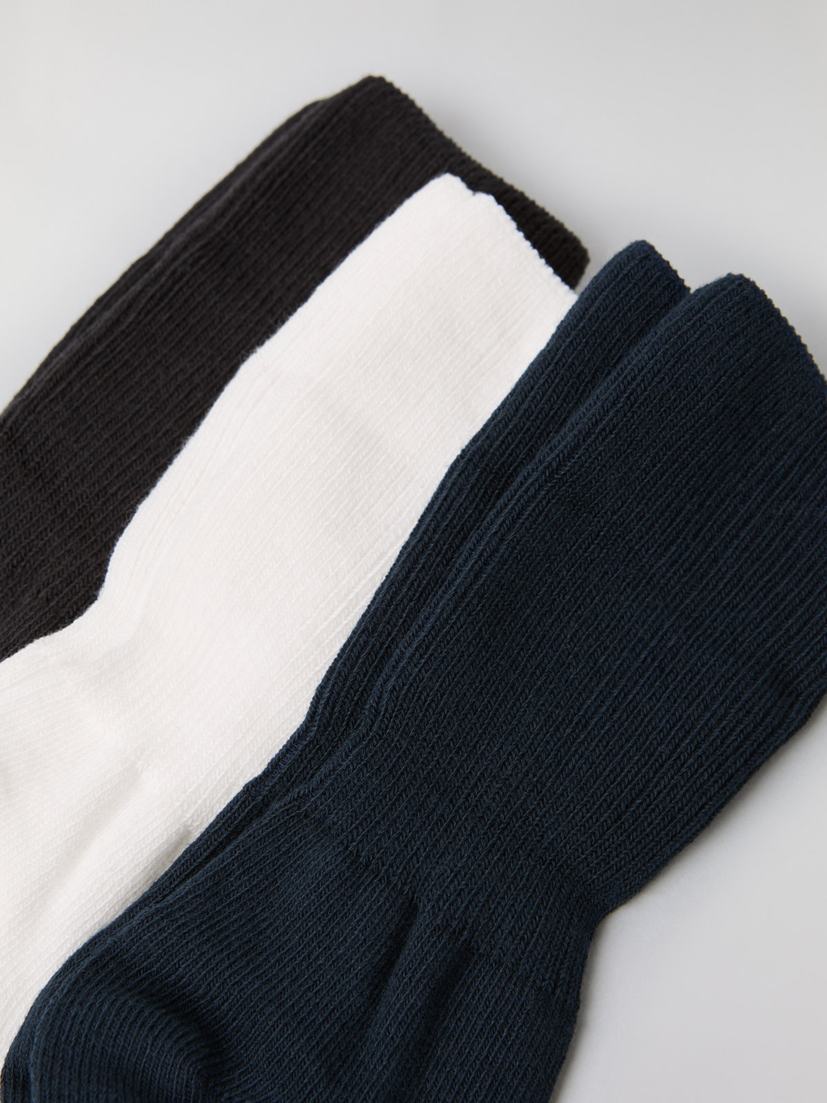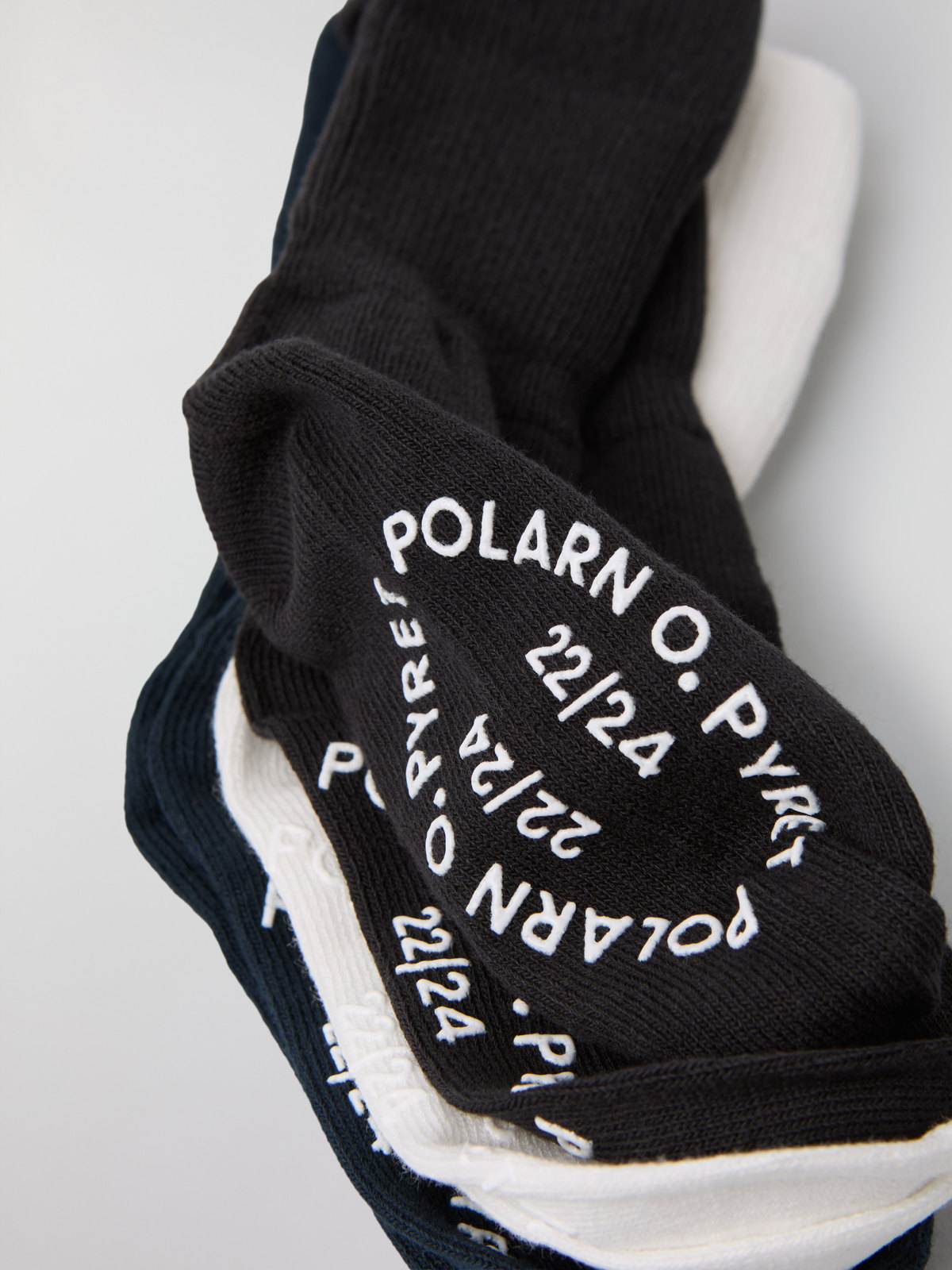 Fyll på strumplådan med ett 3-pack enfärgade strumpor med halkskydd. Strumporna är gjorda i mjuk ekologisk bomull och har en mudd som kan vikas upp eller ned.