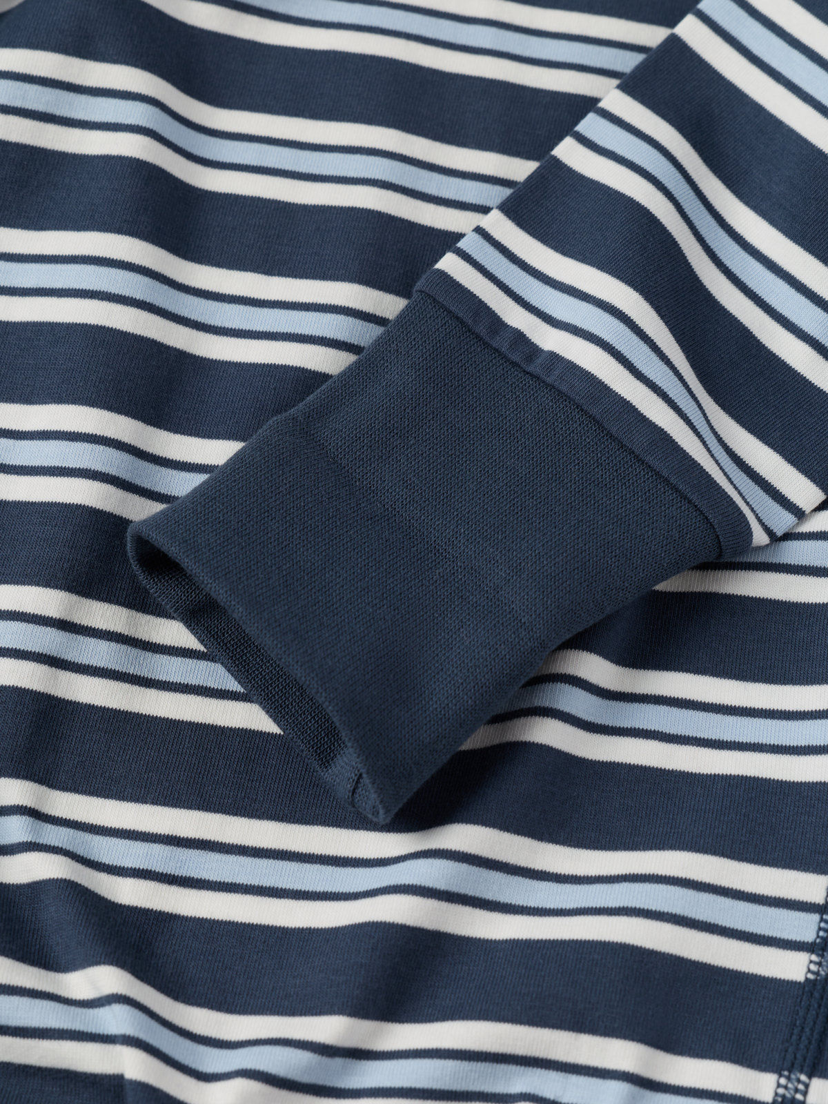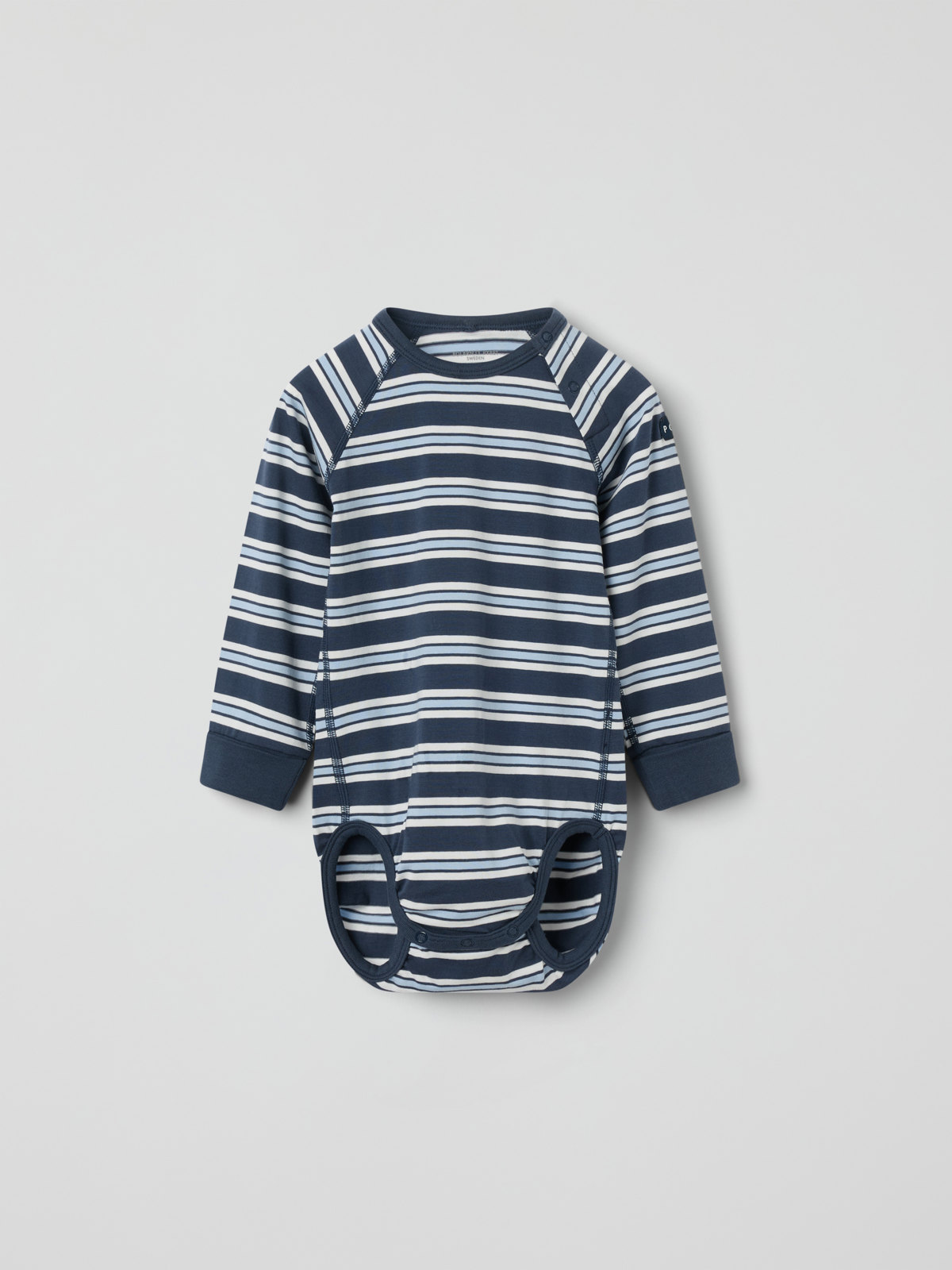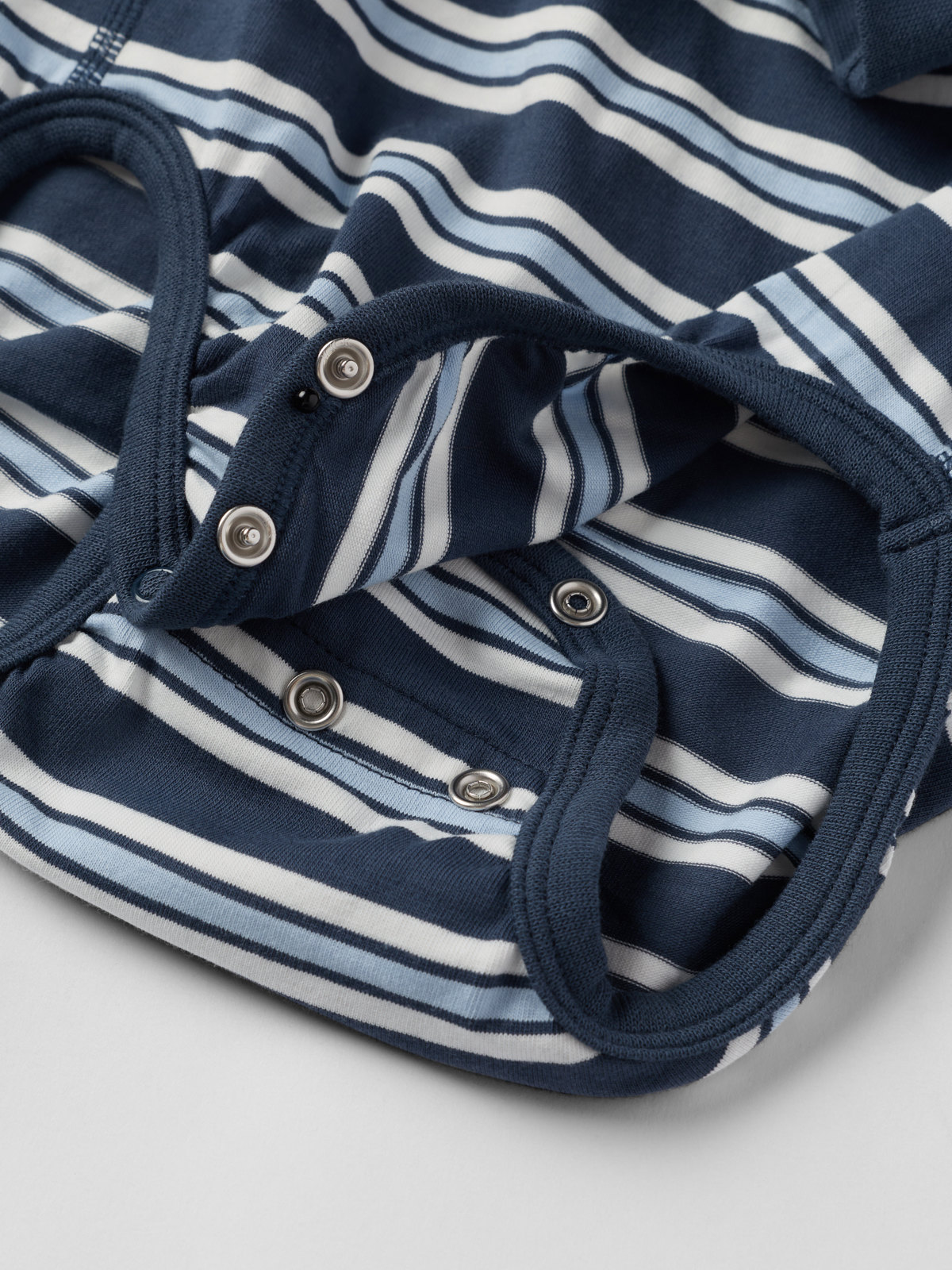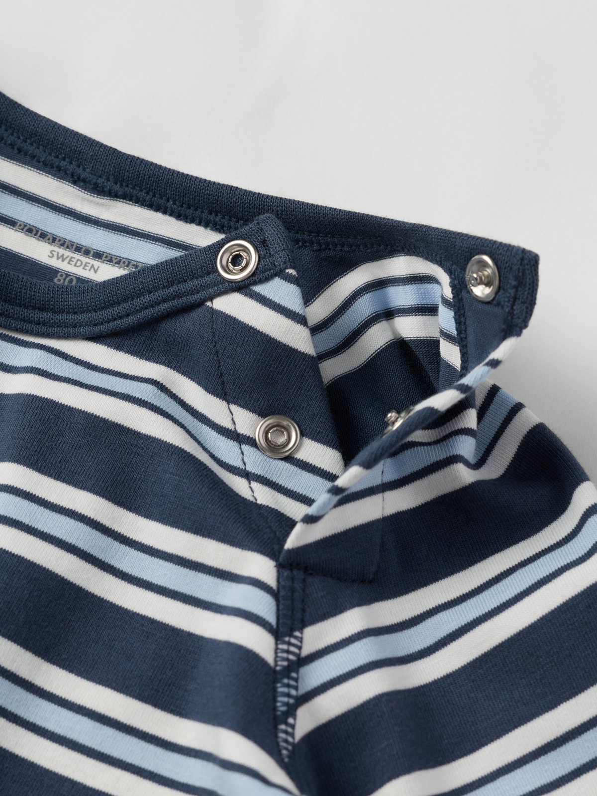 Randig förlängningsbar body i 100 % ekologisk bomull. Tack vare den smarta lösningen med en extra rad tryckknappar i grenen och nedvikbar mudd vid ärmsluten kan bodyn växa tillsammans med bebisen!