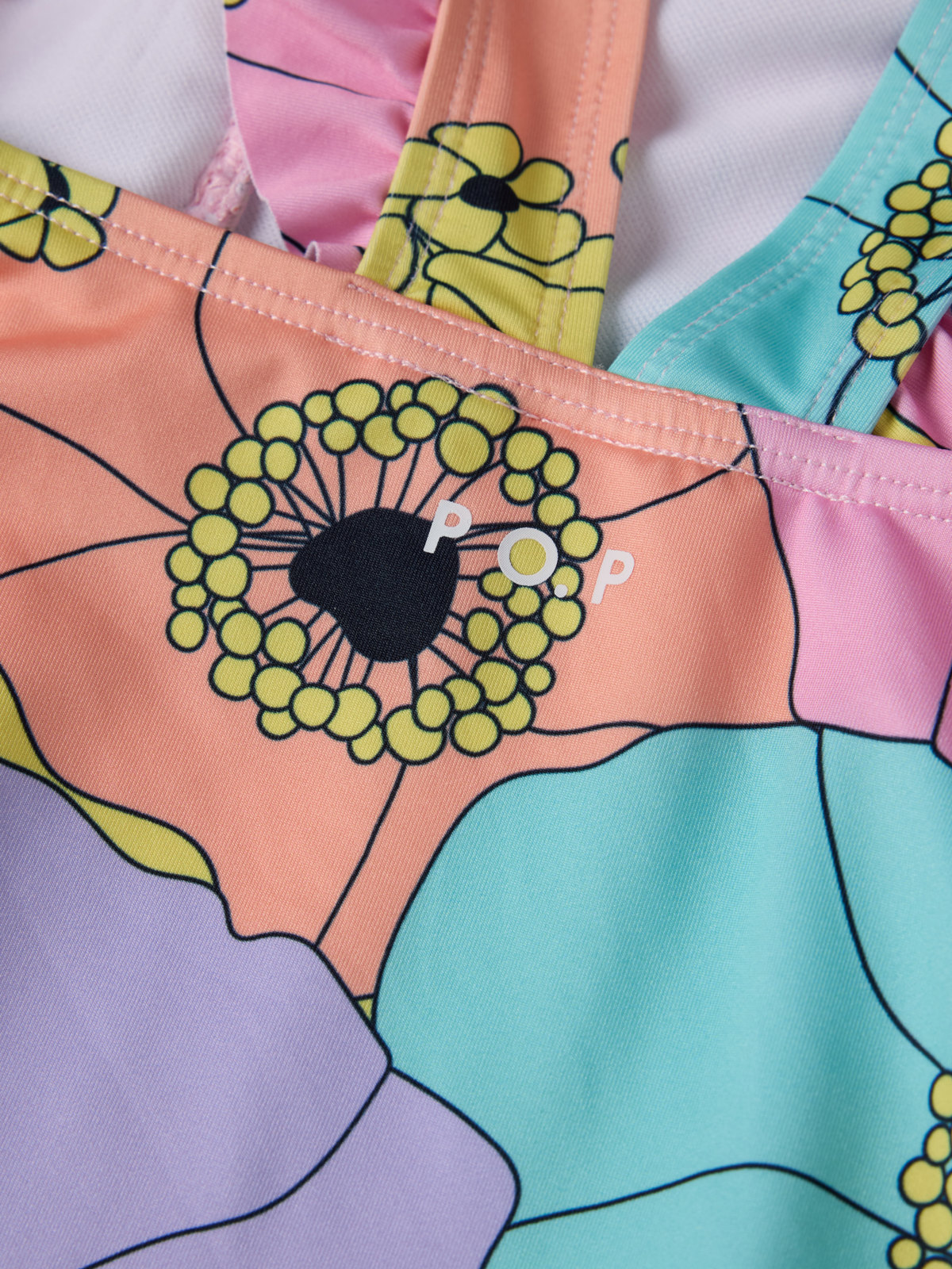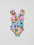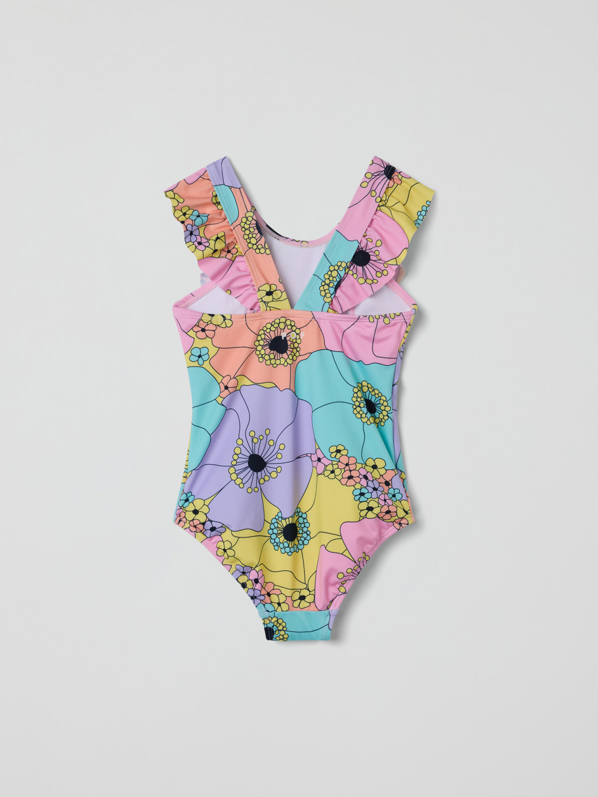 Blommig baddräkt i mjukt och skönt material av återvunnen polyester. Baddräkten är helfodrad och har breda axelband med söta volanger över axlarna.