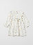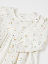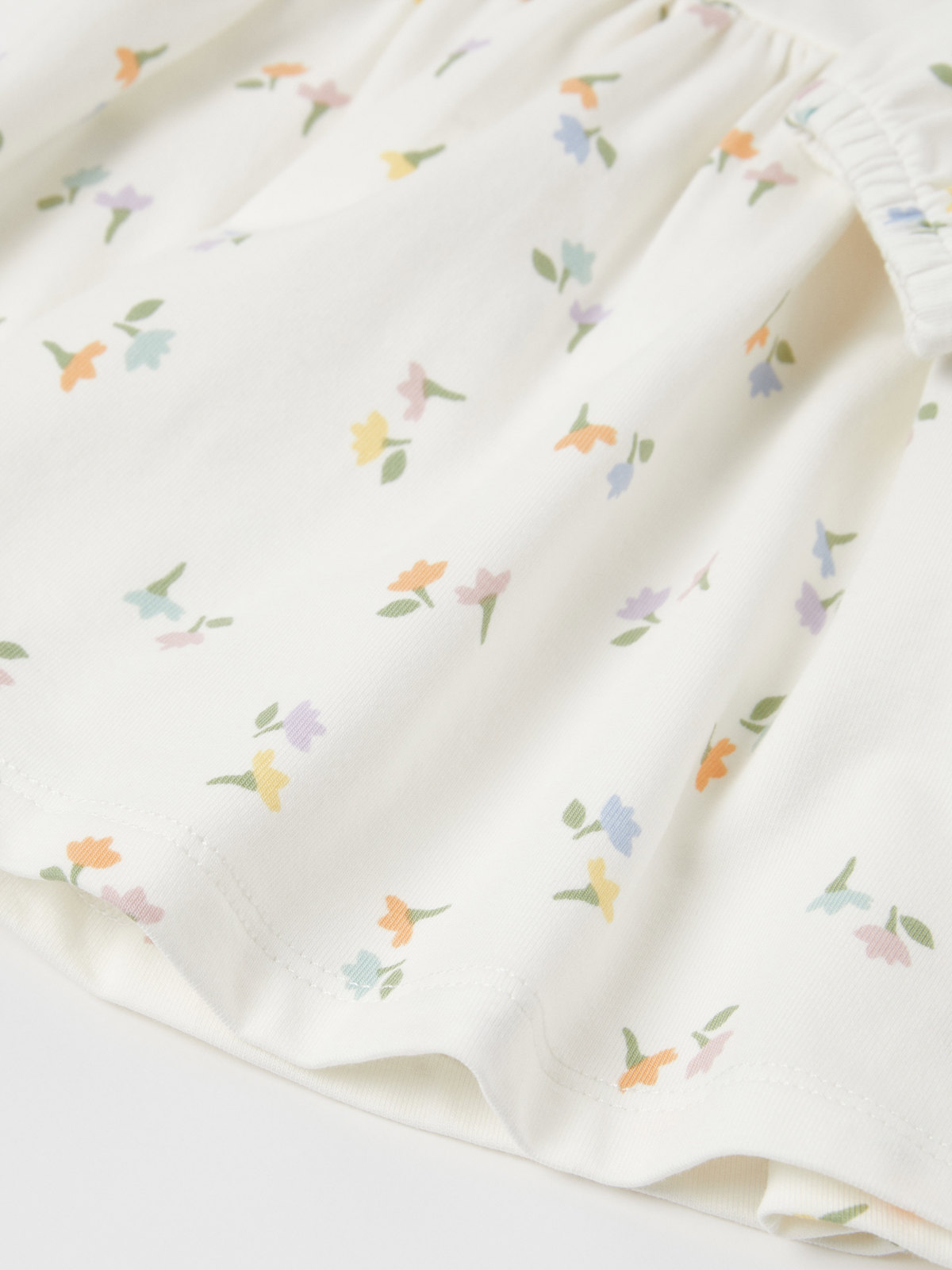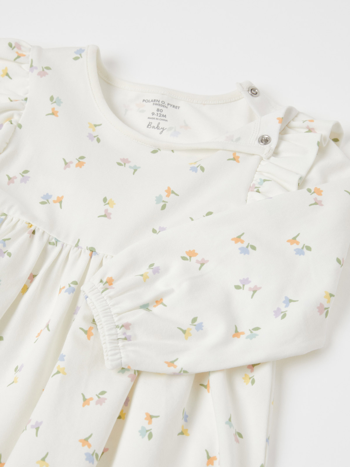 Bedårande klänning i mjuk ekologisk bomullstrikå. Klänningen är helmönstrad med små blommor och prydd med volanger över axlarna.