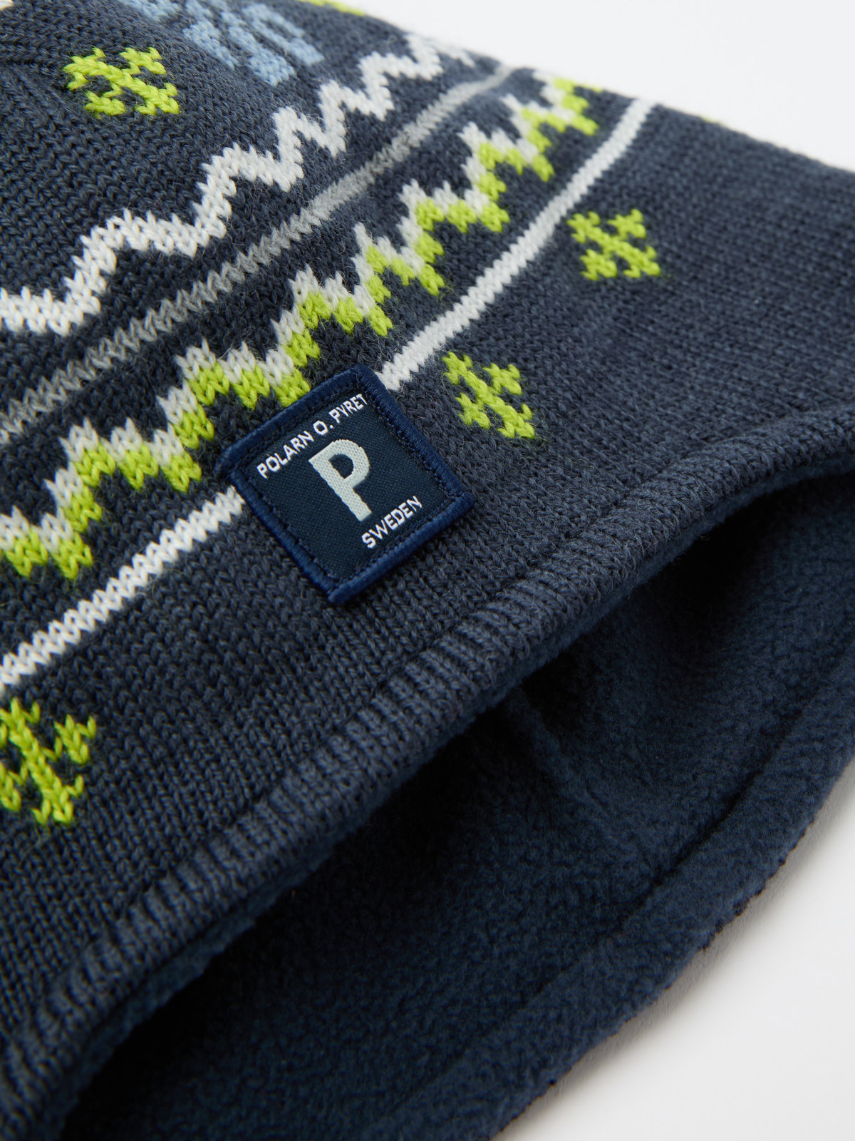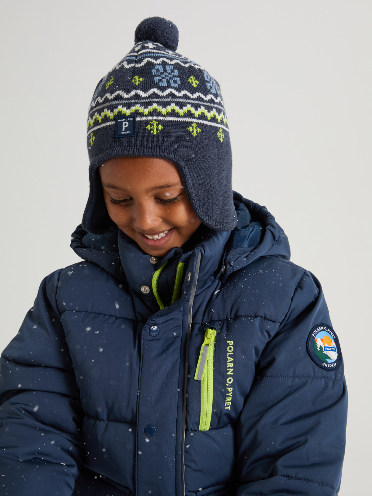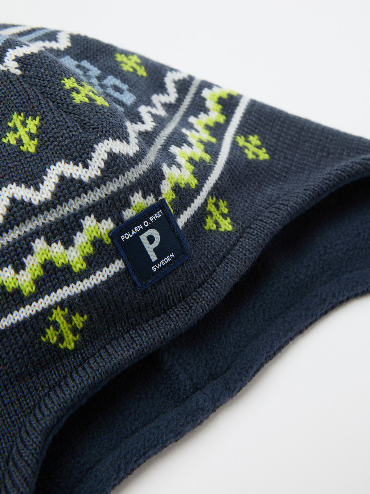 Vindtät jaquardmönstrad hjälmmössa i värmande ullmix med fin pompom. Mössan är fodrad med mjuk fleece.