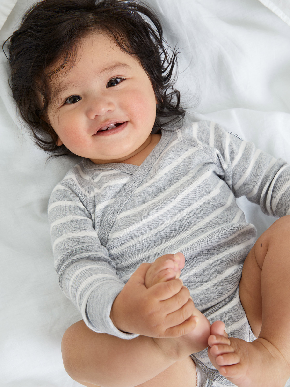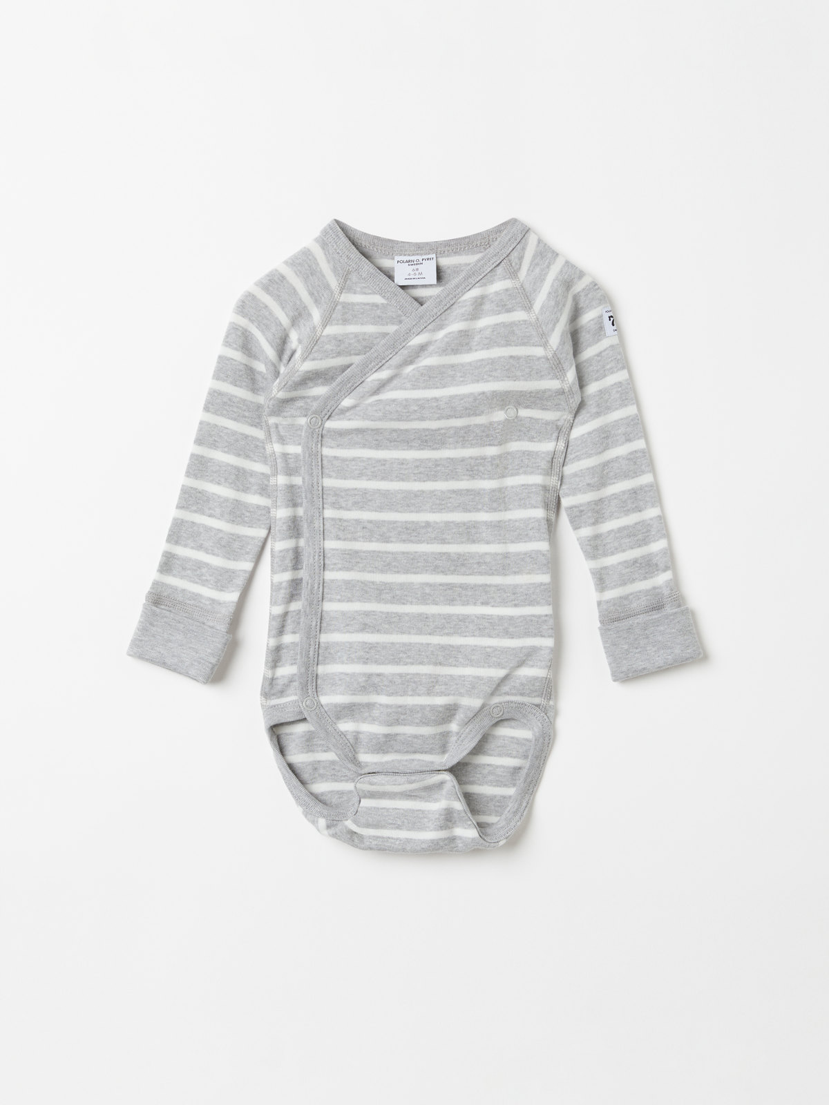 En enfärgad omlottbody i 100% ekologisk bomull för nyfödd. Bodyn har mjuk ribbad mudd vid ärmsluten som går att vika ned allteftersom babyn växer. Tryckknapparna längst med omlottöppningen och i grenen underlättar kläd och blöjbyten.