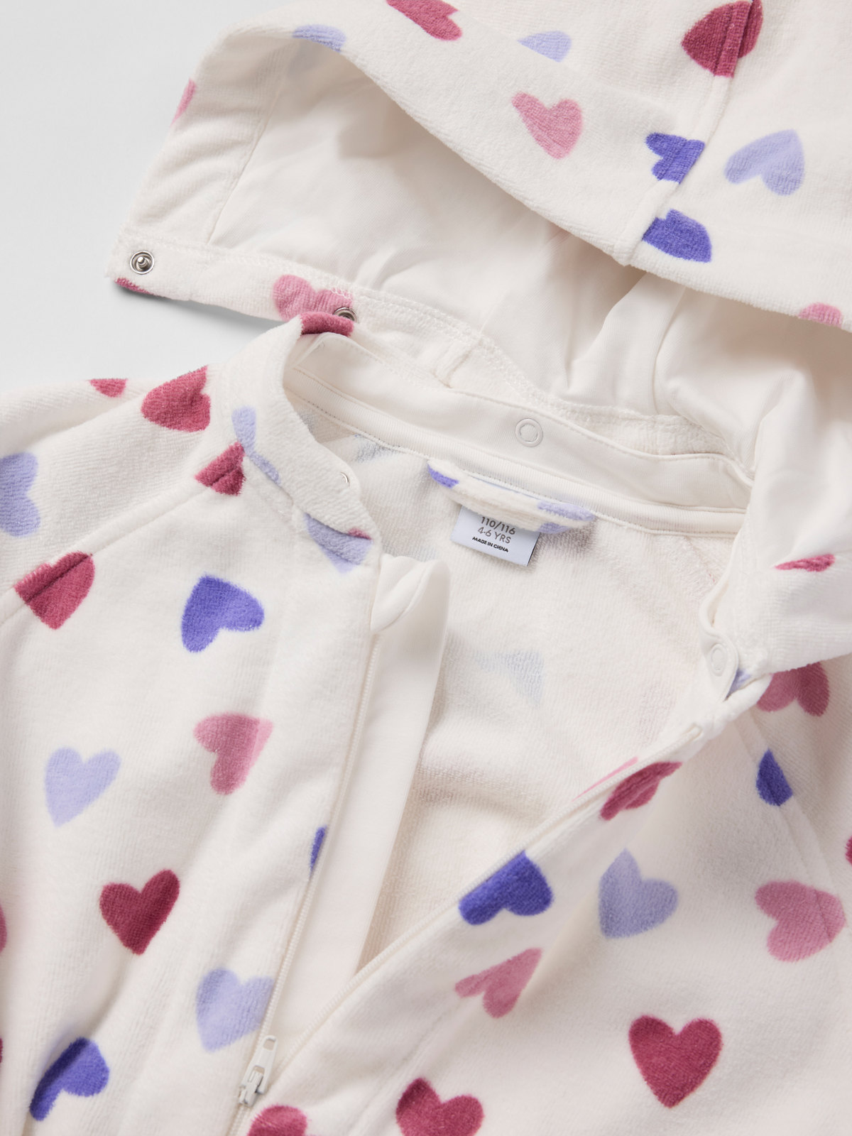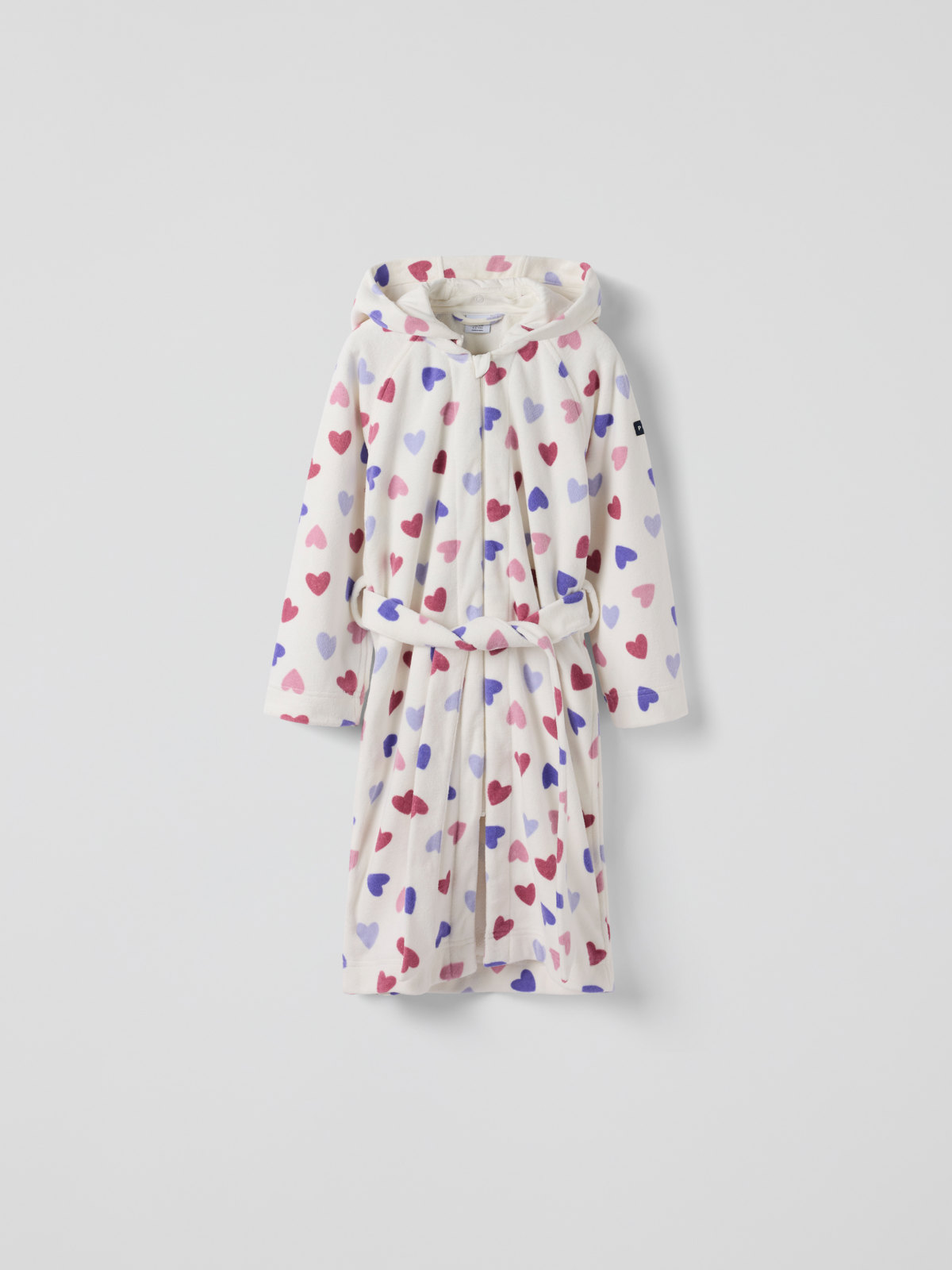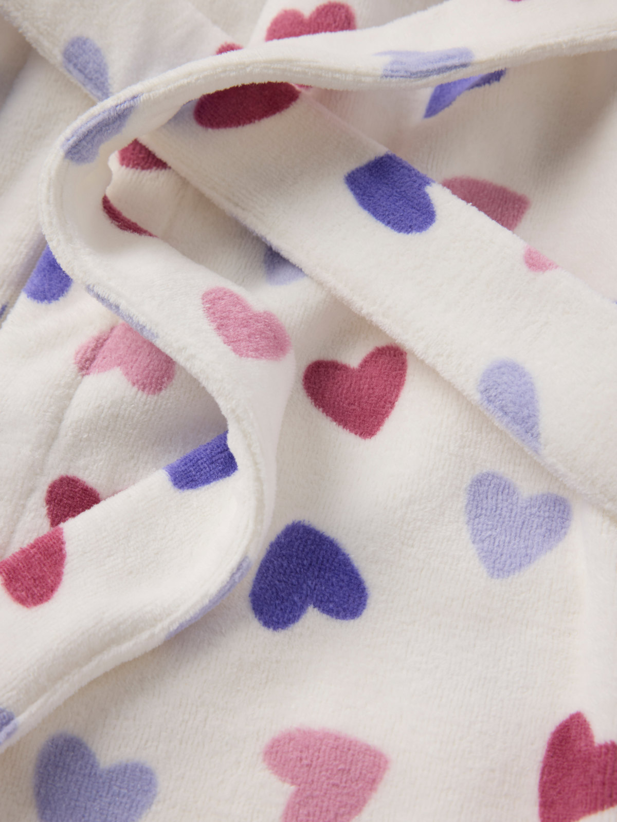 Badrock i mjukt och skönt material av ekologisk bomull och återvunnen polyester helmönstrad med hjärtan. Badrocken har avtagbar huva fodrad med bomullstrikå och slutar mitt på vaden. Den stängs med dragkedja och knytband.