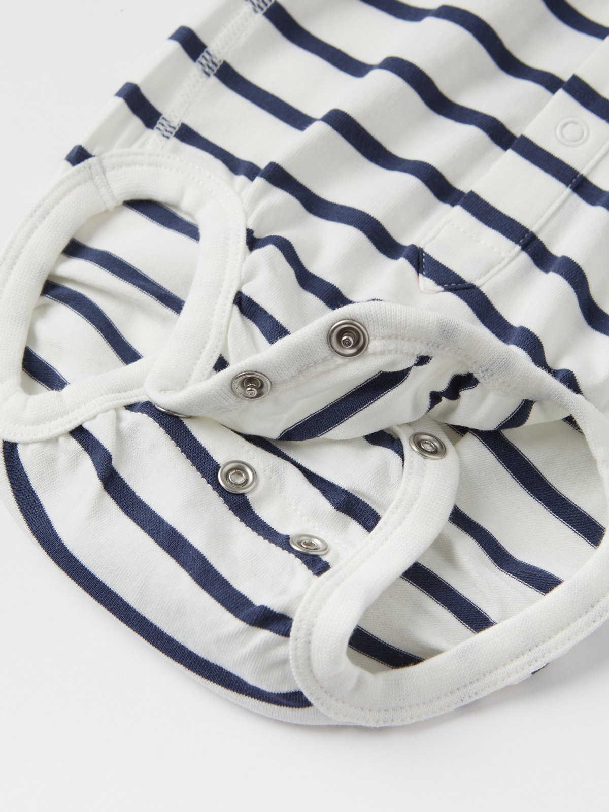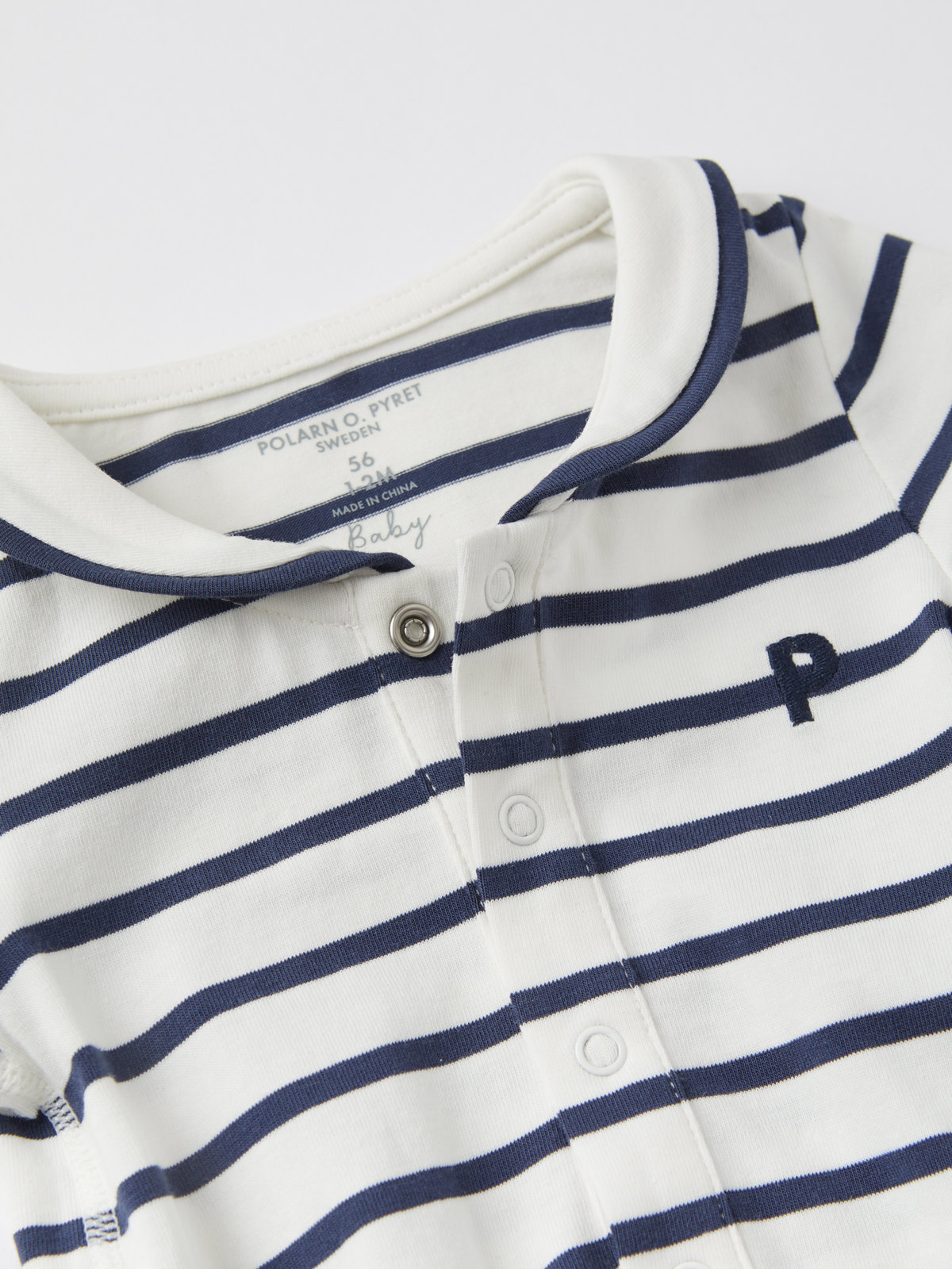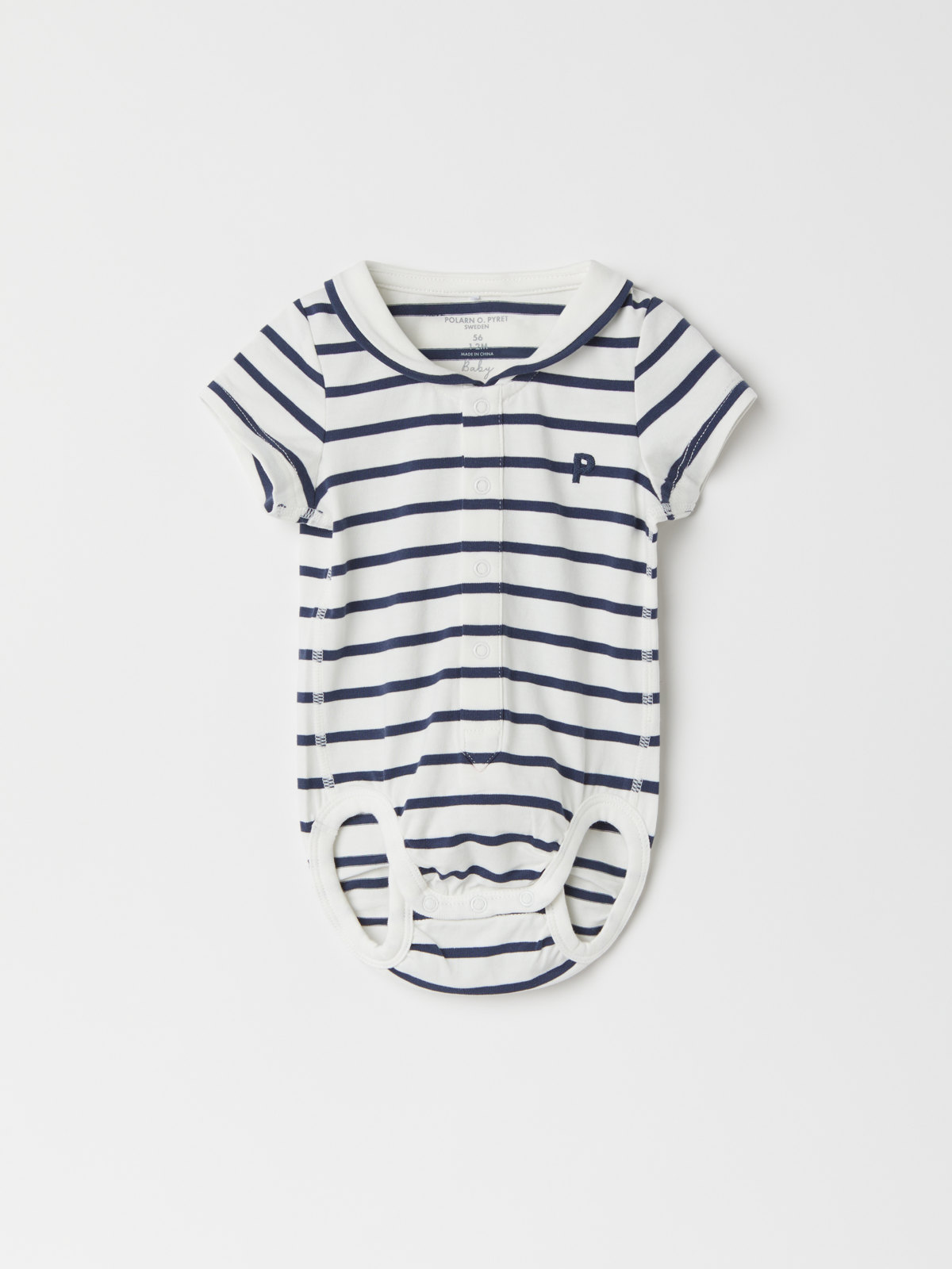 Sjömansbody i mjuk, ekologisk bomullstrikå för baby – fin till sommarens båtutflykter eller festligheter.
