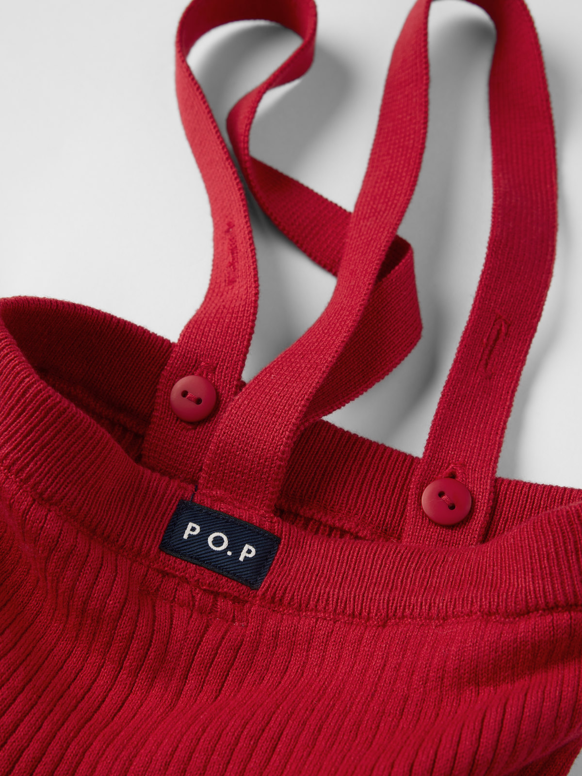 Finstickad hängselbyxa i 100 % ekologisk bomull. Passar lika bra för mys som till fest! Längden på hängslena går att justera med knappar. Midjan är ribbstickad och har mjuk resår för skön passform.