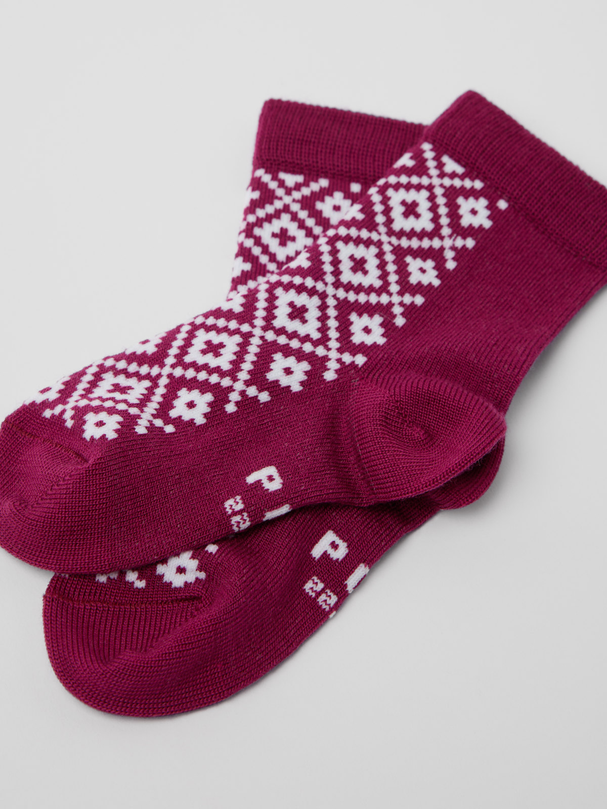 Ett par jaquardmönstrade strumpor i tunn merinoull som värmer gott och är mjuka för små fötter. Storleken är markerad på insidan av skaftet. Där finns också plats att skriva barnets namn. Lätt att hålla ordning!