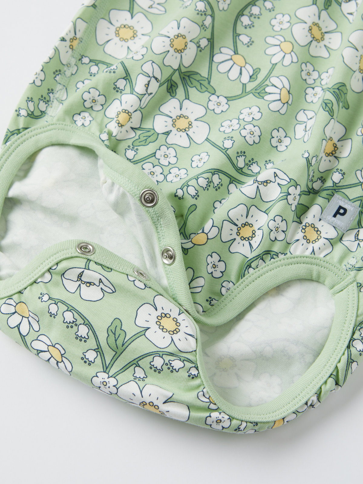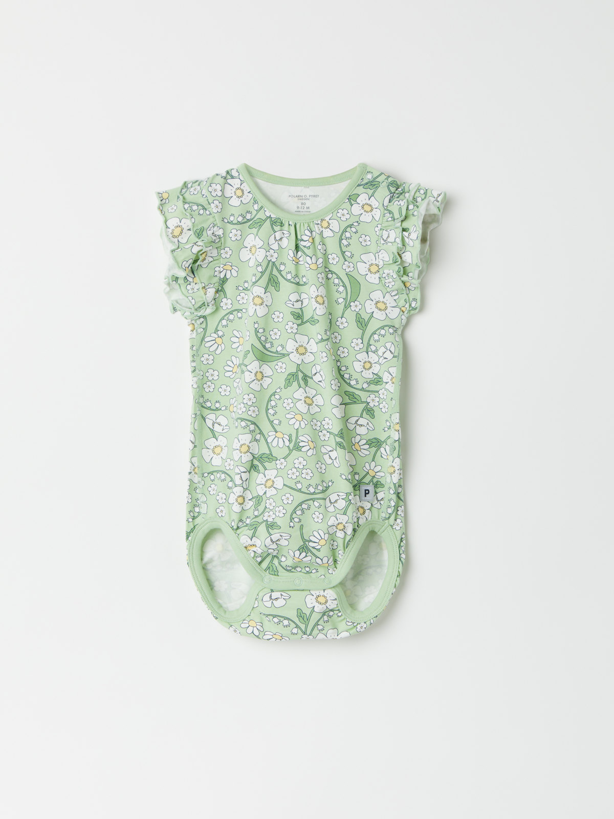 Söt body i mjuk, ekologisk bomull för baby. Bodyn är helmönstrad med blommor och har dubbla volangärmar.