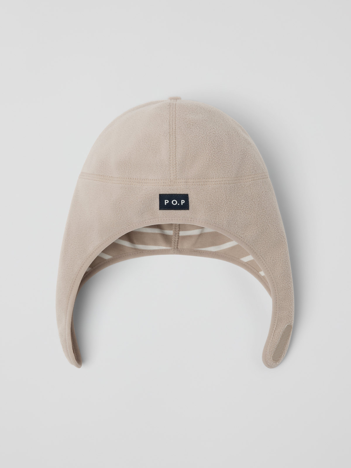 Vindtät och vattenavvisande hjälmmössa i mjuk fleece för baby. Mössan är tillverkad i återvunnen polyester och insidan är fodrad med mjuk ekologisk bomullstrikå med vår klassiska rand. Mössan stängs med kardborreband under hakan.