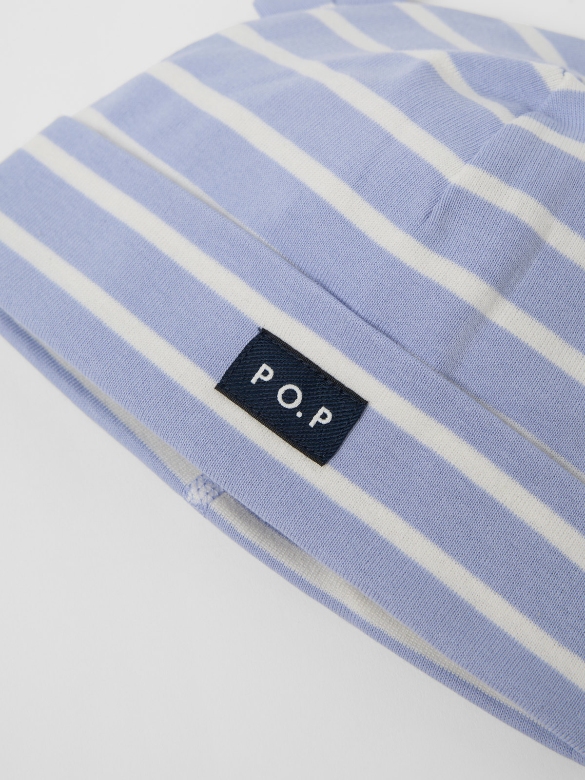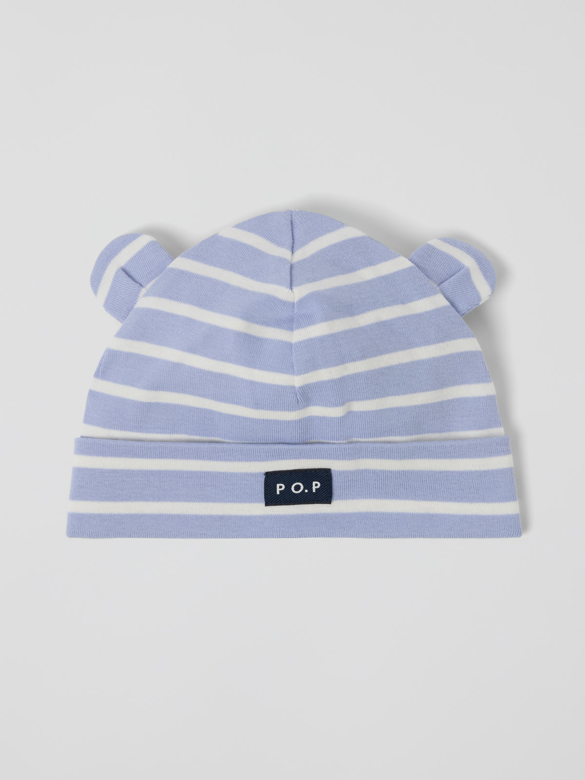 Randig mössa i 100 % ekologisk bomullstrikå för baby. Mössan är prydd med påsydda öron och har ett uppvik som kan justeras efter bebisens huvudstorlek.