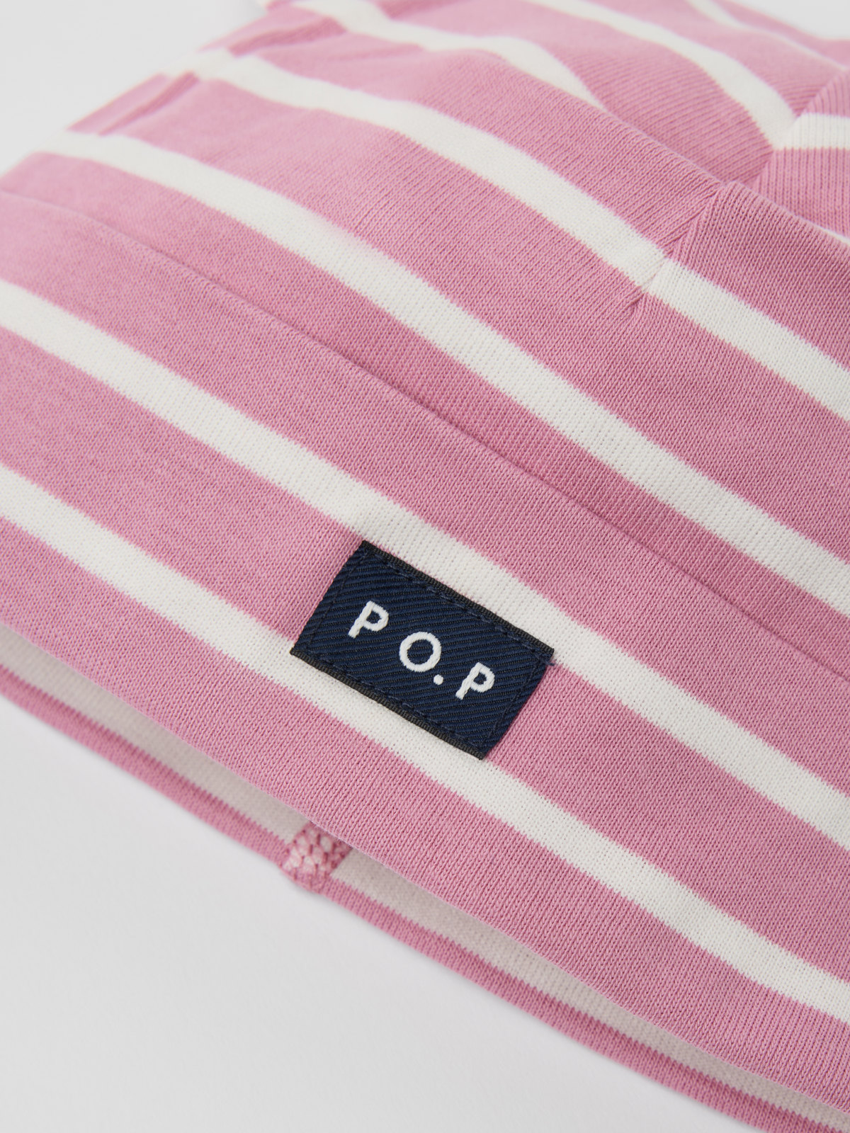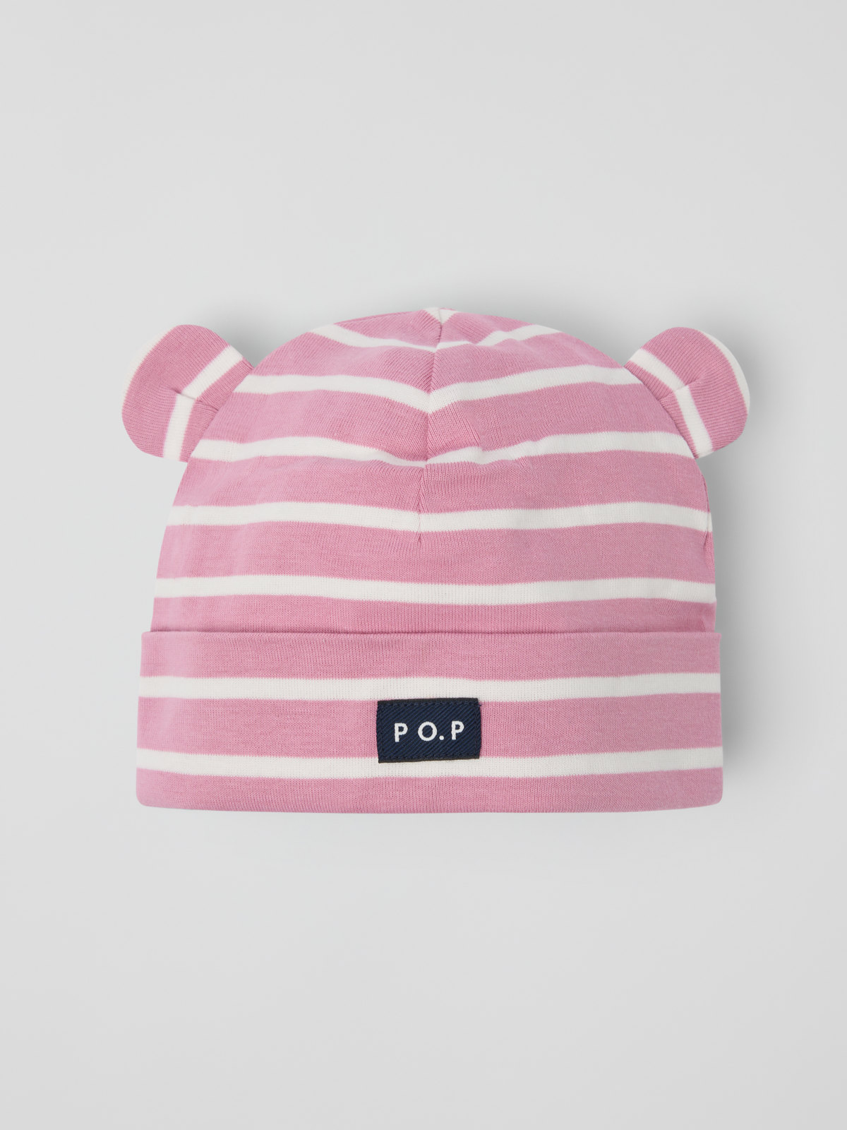 Randig mössa i 100 % ekologisk bomullstrikå för baby. Mössan är prydd med påsydda öron, och har ett uppvik som kan justeras efter bebisens huvudstorlek.
