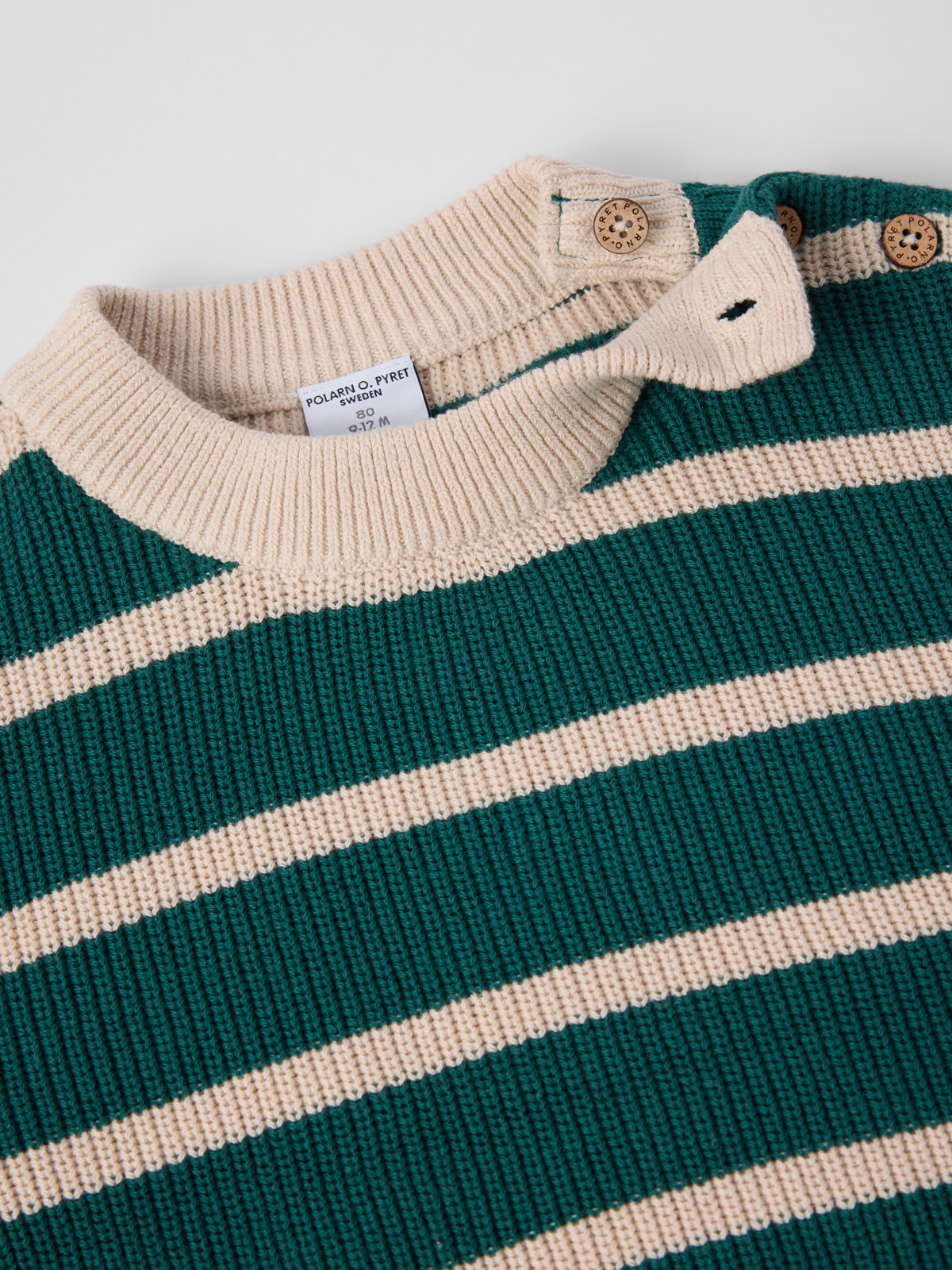 Stickad tröja i 100 % ekologisk bomull. En riktigt mysig höstfavorit. Tröjan har ribbad mudd i halsringning och i ärmslut.