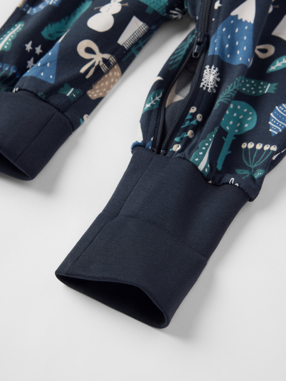 Pyjamasoverall i mjuk ekologisk bomull, sydd med extra mjuka, platta sömmar som är skonsamma mot känslig hud. Muddarna vid ärm- och benslut är extra långa och går att vika ned allteftersom barnet växer. Den långa dragkedjan från hals till benslut är öppningsbar både uppifrån och nedifrån för att underlätta klädbyten.