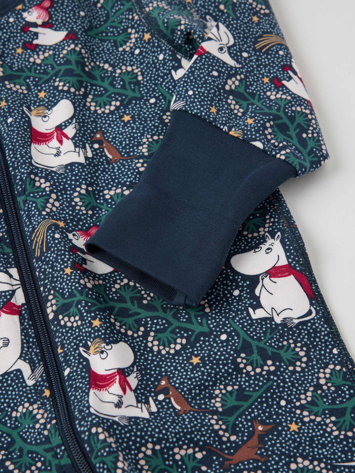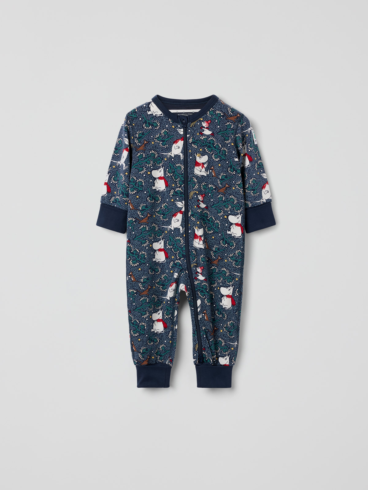 Pyjamasoverall i mjuk ekologisk bomull – en del av vårt älskade designsamarbete för att fira Mumins 80-årsjubileum 2025. Overallen är helmönstrad med illustrationer från Tove Janssons berättelser om mumintrollen. Muddarna vid ärm- och benslut är extra långa och går att vika ned allteftersom barnet växer. Den långa dragkedjan från hals till benslut är öppningsbar både uppifrån och nedifrån för att underlätta klädbyten.