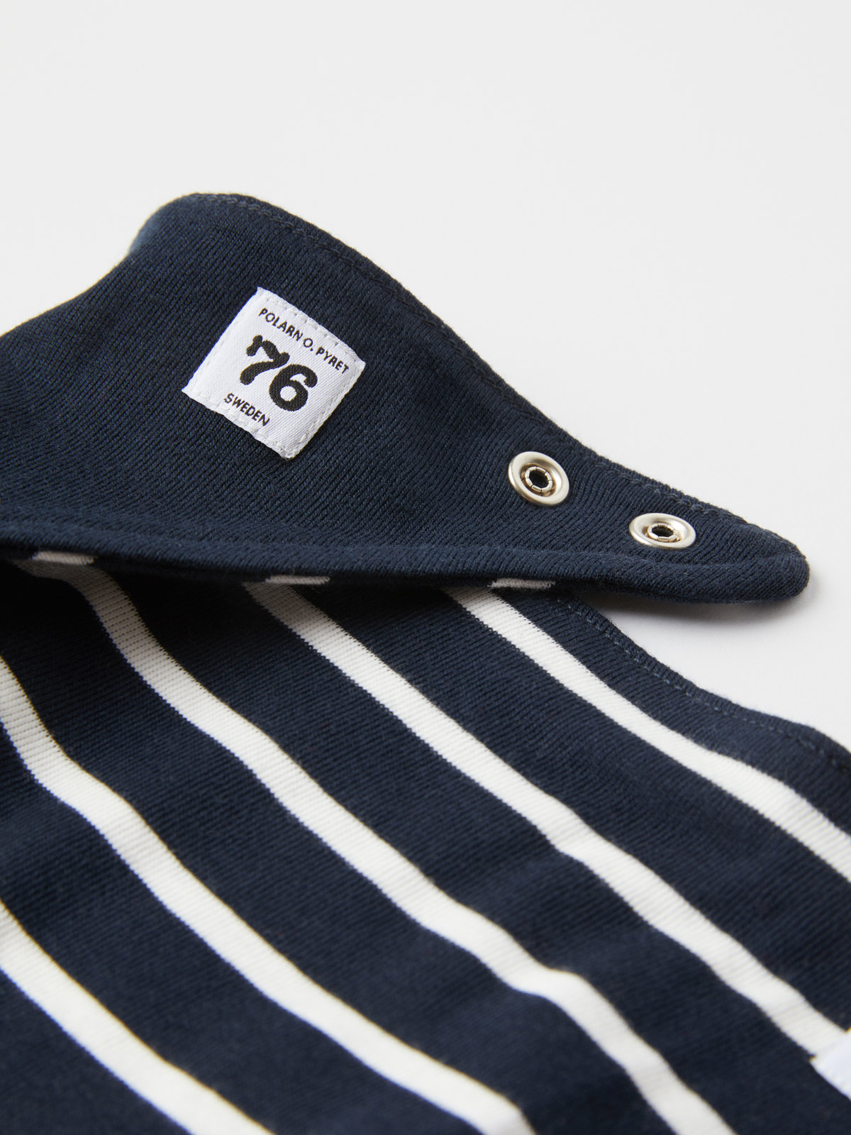 Randig dregellapp som skyddar kläderna och är tillverkad i mjuk ekologisk bomull. Ena sidan har vår klassiska rand och den andra sidan är enfärgad. Storleken i nacken kan regleras med tryckknappar.