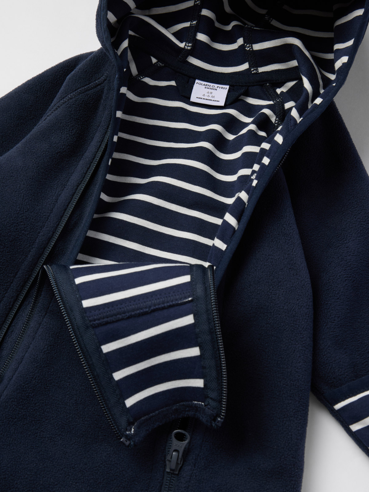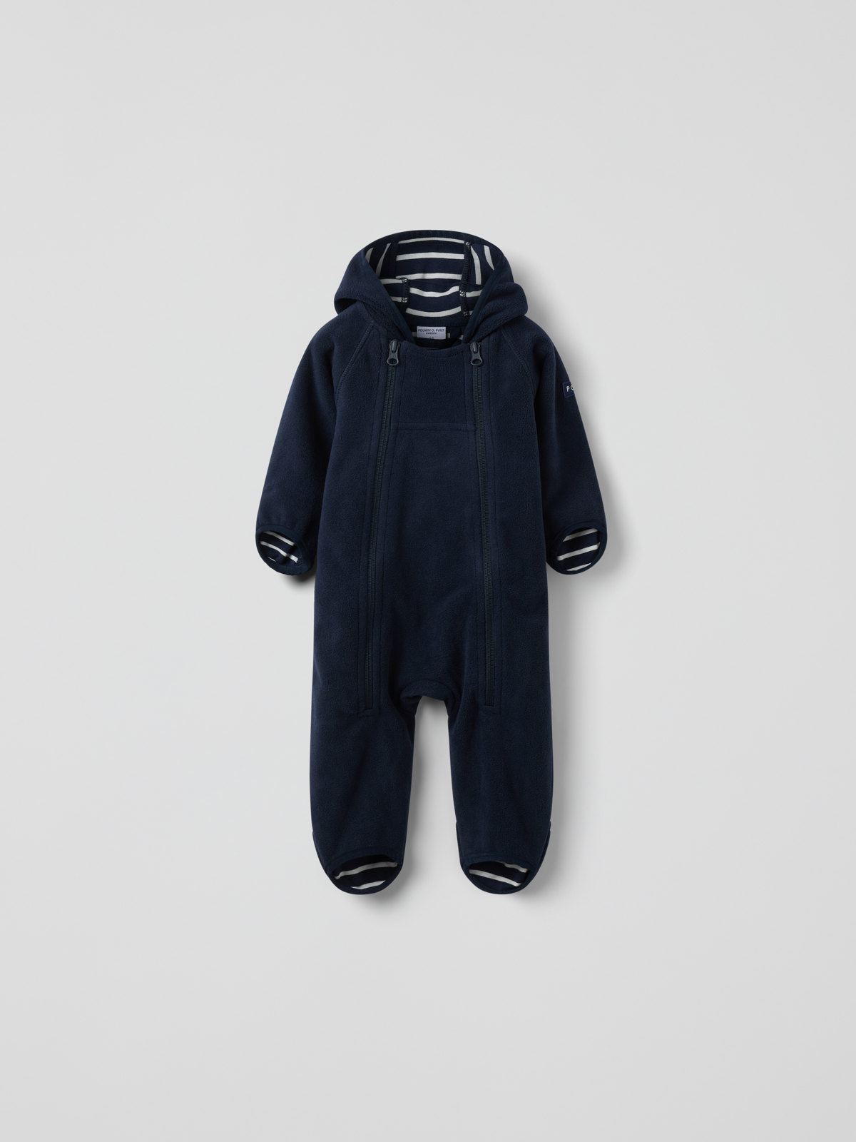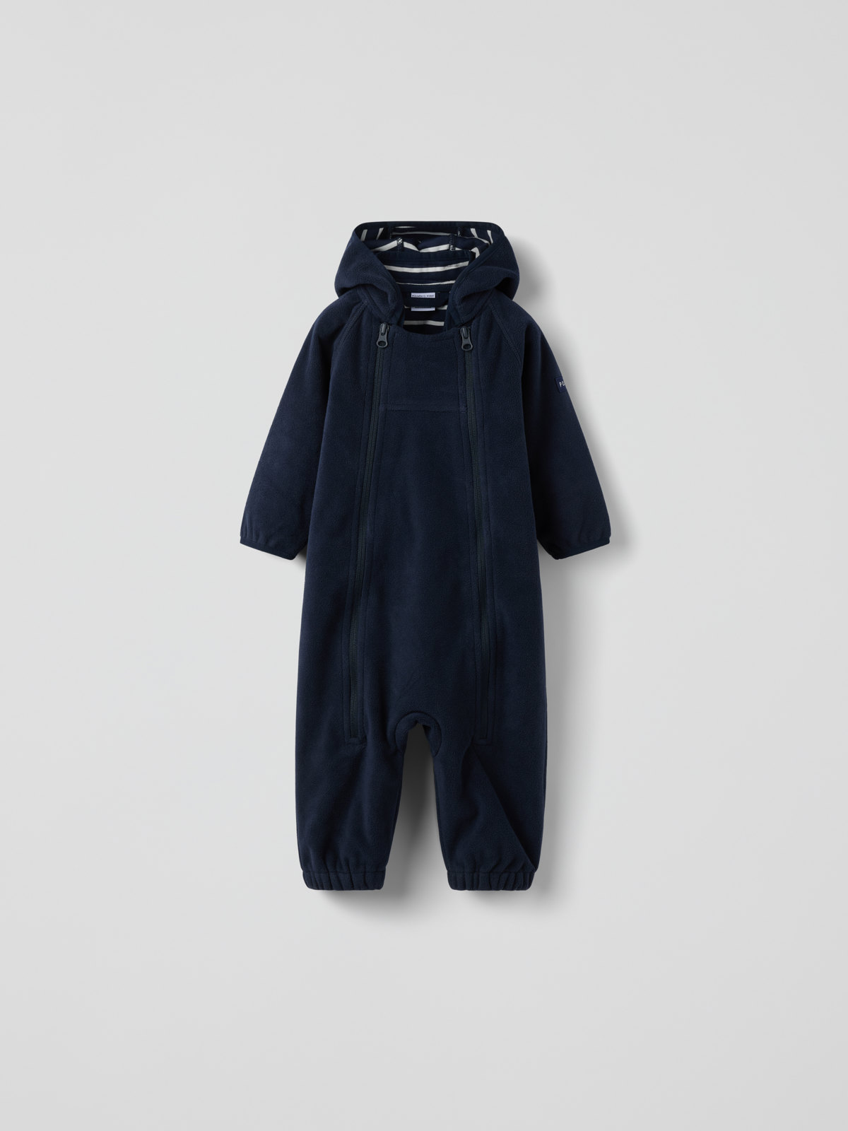 Vindtät och vattenavvisande vindfleeceoverall för baby. Perfekt att ha i vagnen! Overallen är tillverkad i återvunnen polyester med god andningsförmåga och är fodrad med mjuk trikå i 100 % ekologisk bomull med vår klassiska rand. Den har fast huva och dubbla dragkedjor fram för att underlätta klädbyten.