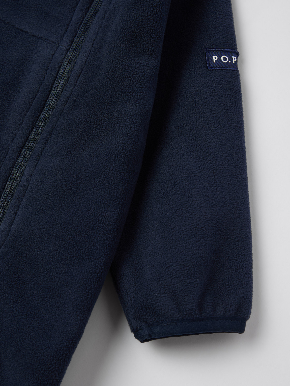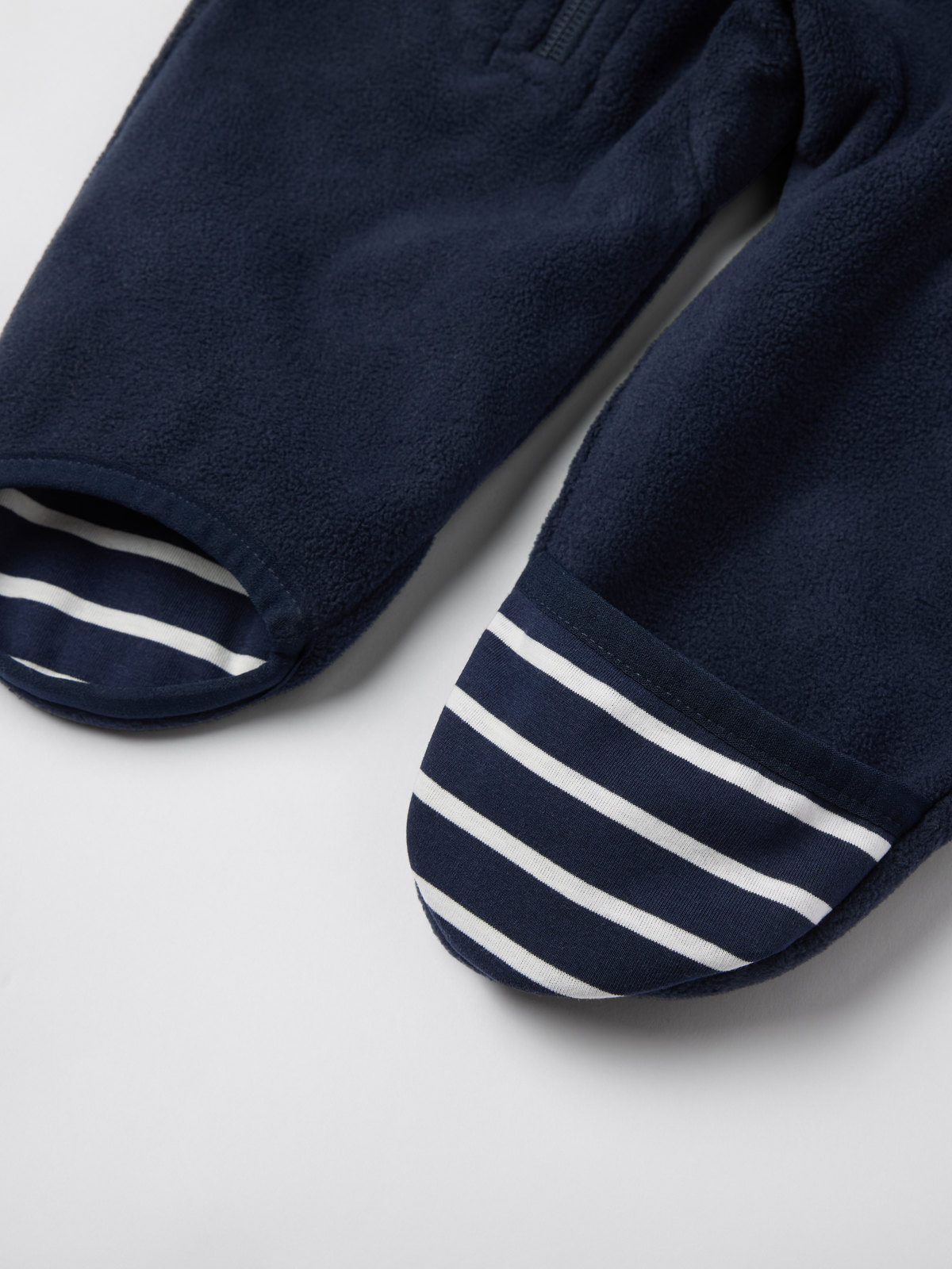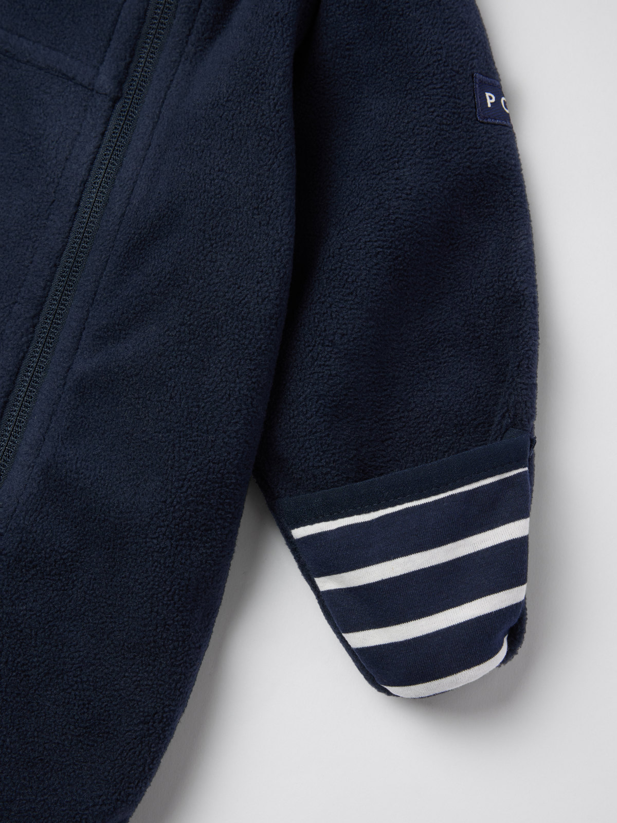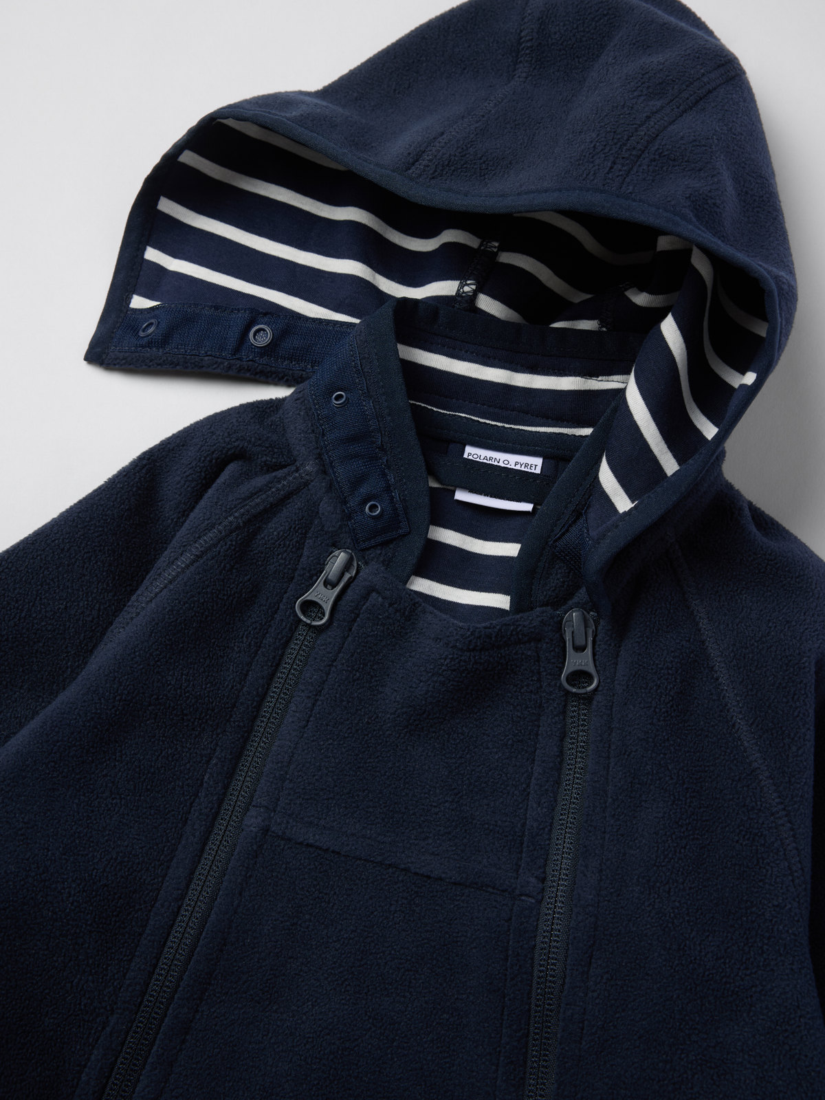 Vindtät och vattenavvisande vindfleeceoverall för baby. Perfekt att ha i vagnen! Overallen är tillverkad i återvunnen polyester med god andningsförmåga och är fodrad med mjuk trikå i 100 % ekologisk bomull med vår klassiska rand. Den har fast huva och dubbla dragkedjor fram för att underlätta klädbyten.
