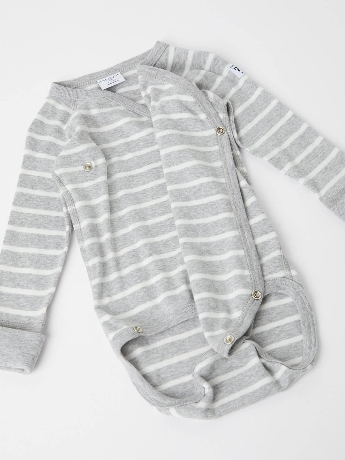 En enfärgad omlottbody i 100% ekologisk bomull för nyfödd. Bodyn har mjuk ribbad mudd vid ärmsluten som går att vika ned allteftersom babyn växer. Tryckknapparna längst med omlottöppningen och i grenen underlättar kläd och blöjbyten.