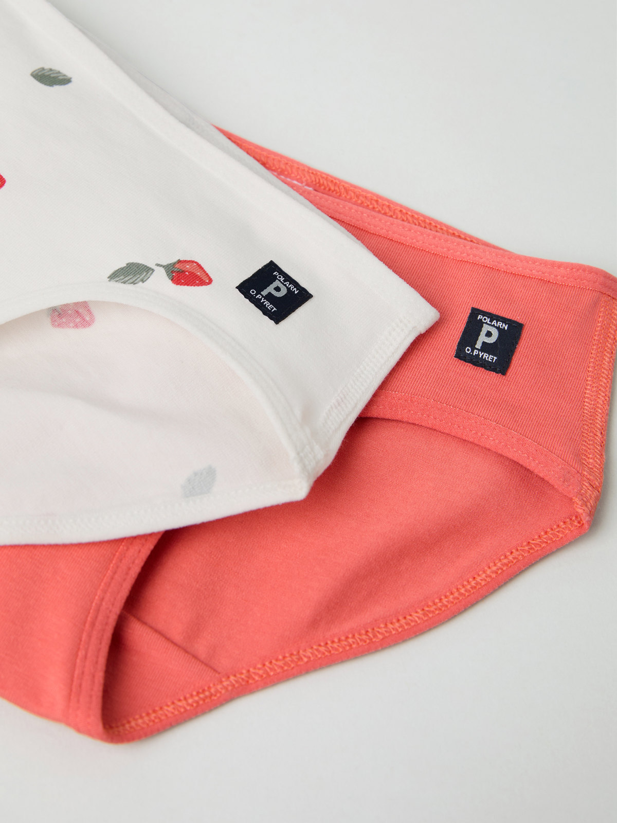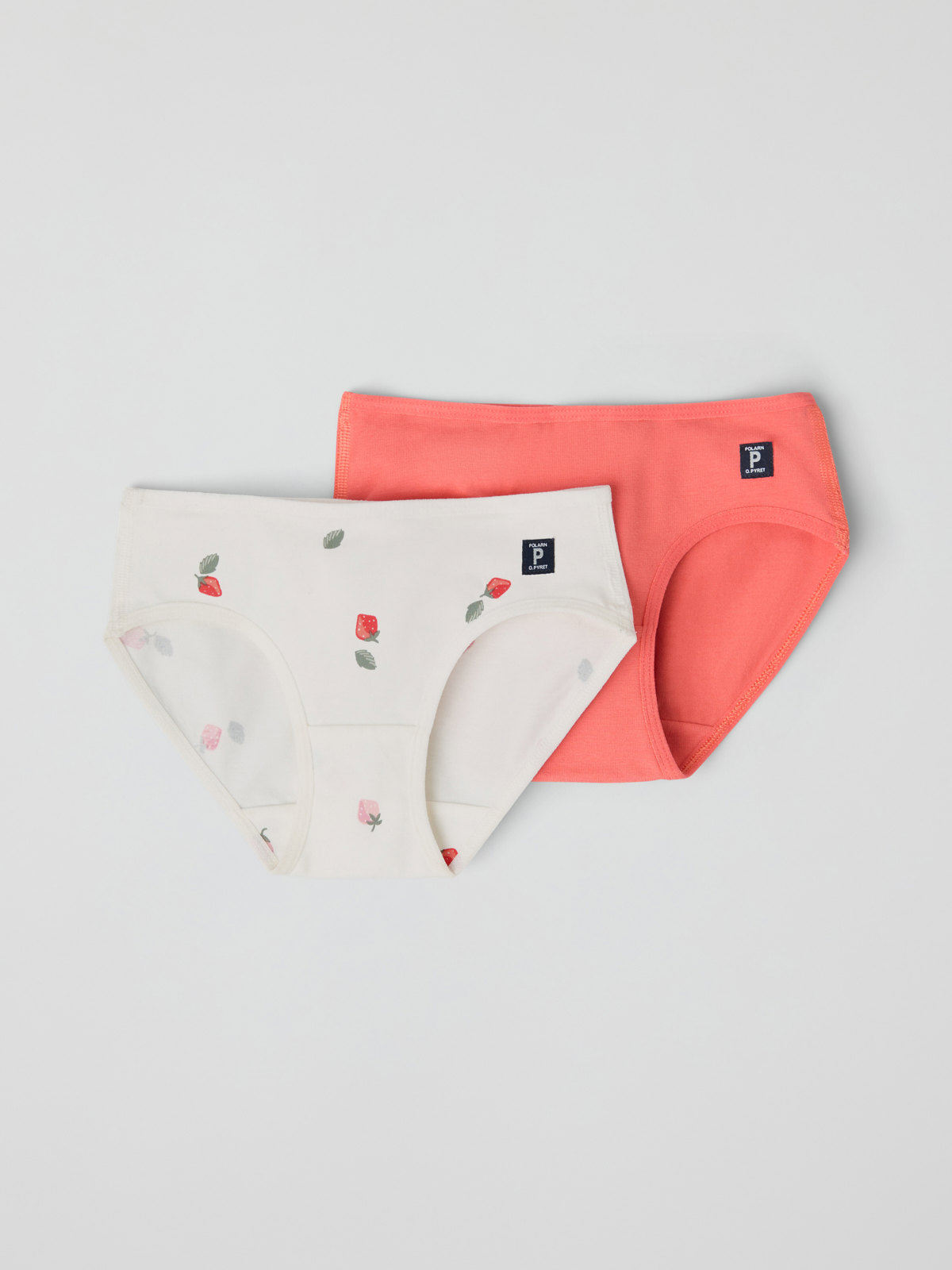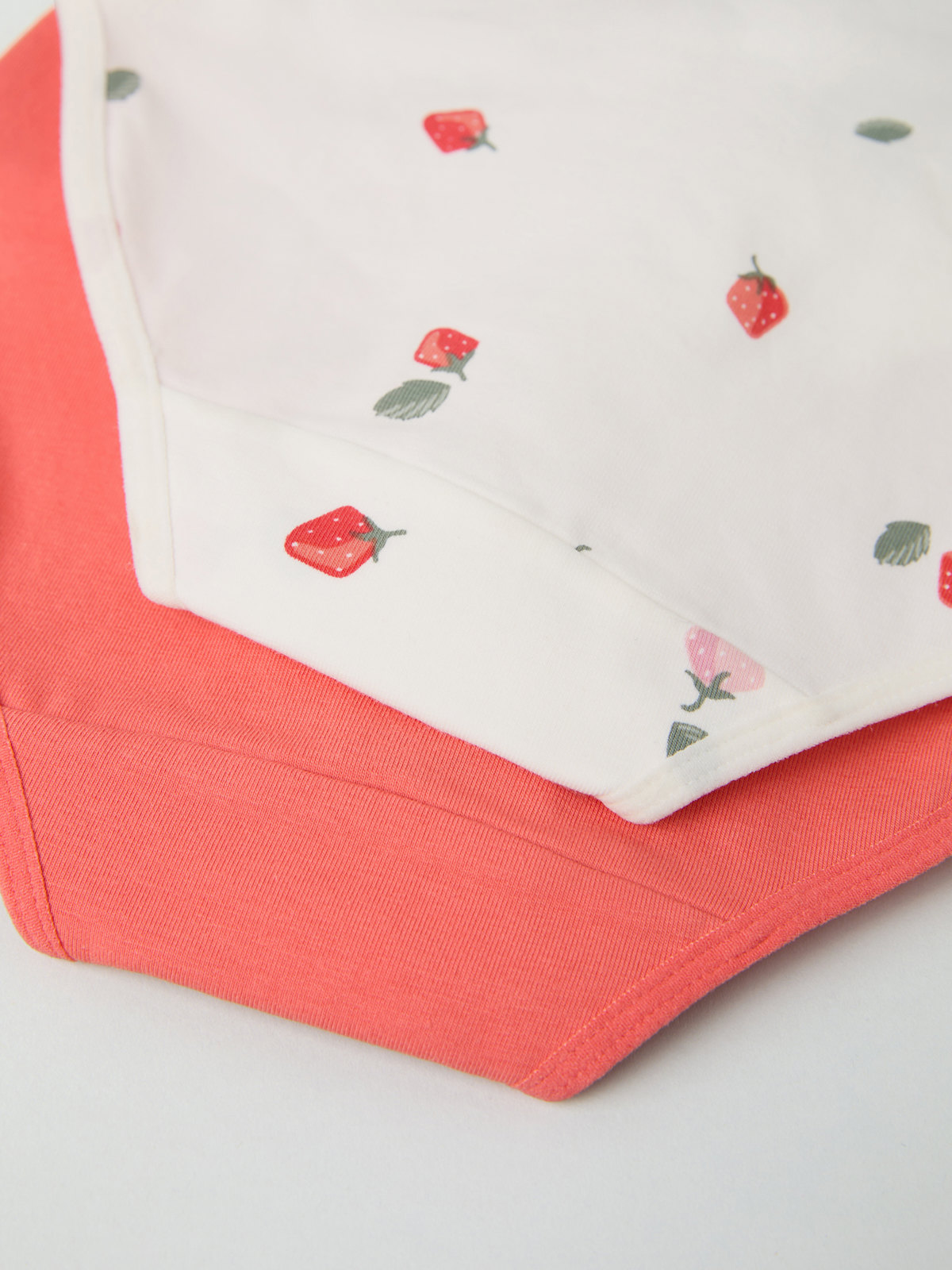 2-pack trosor i mjuk ekologisk bomull, sydda med extra mjuka sömmar som inte skaver. Det ena paret är helmönstrat med bär, det andra är enfärgat.
