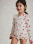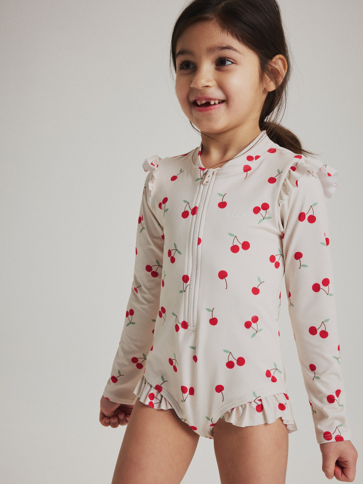 Långärmad baddräkt tillverkad i mjukt och skönt material av återvunnen polyester – perfekt för den som gillar att bada länge! Baddräkten har en smart dragkedja fram och är helmönstrad med körsbär. Den har söta volanger över axlar och ben.