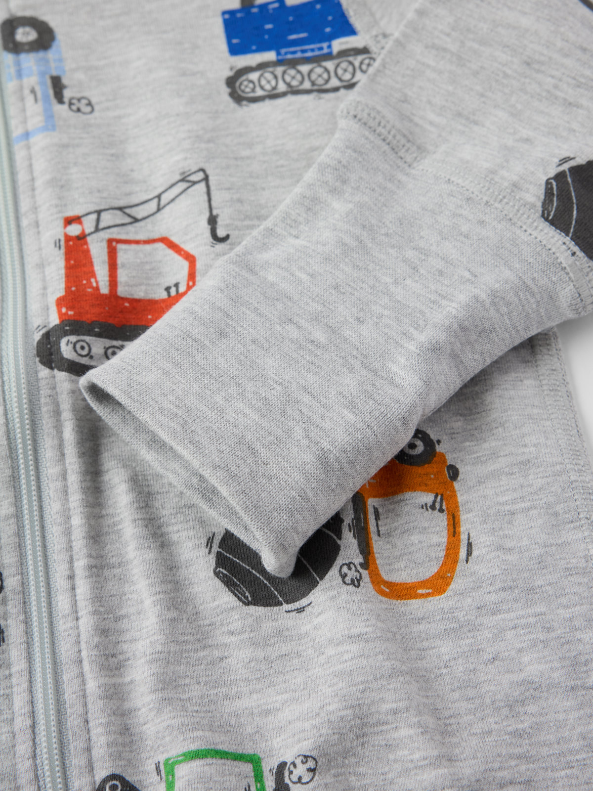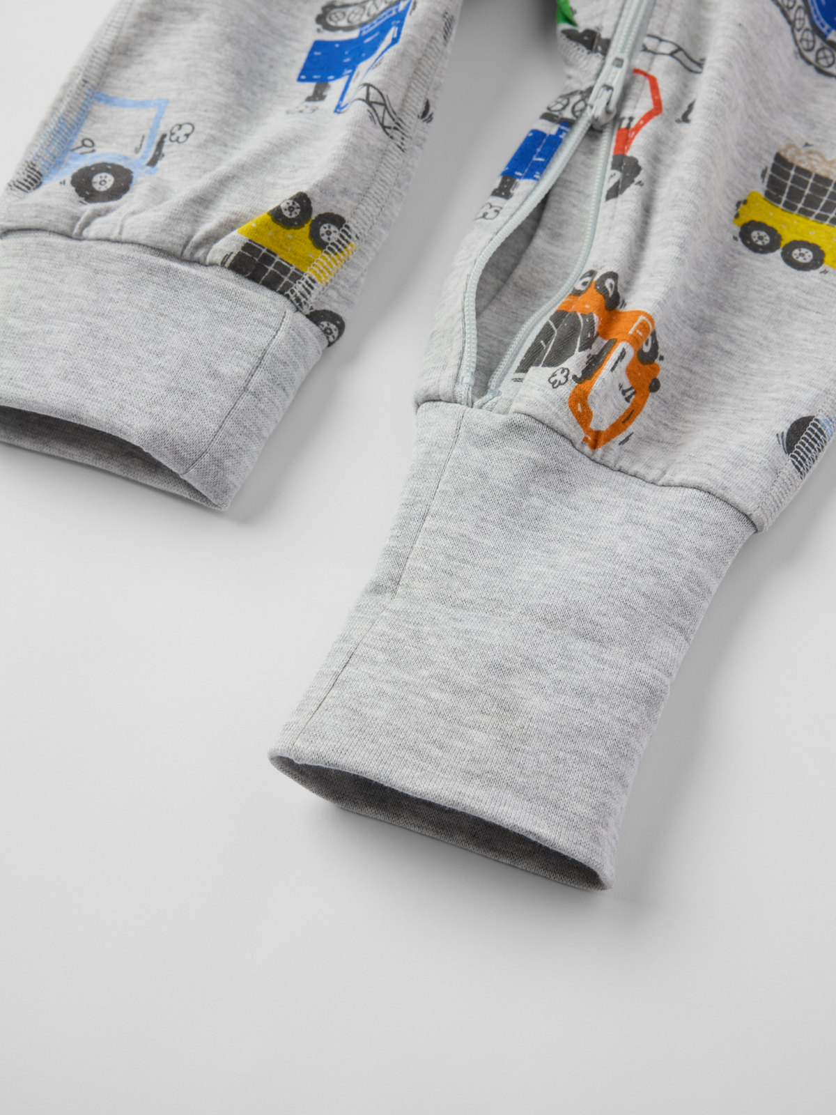 Pyjamasoverall i mjuk ekologisk bomull, sydd med extra mjuka, platta sömmar som är skonsamma mot känslig hud. Muddarna vid ärm- och benslut är extra långa och går att vika ned allteftersom barnet växer. Den långa dragkedjan från hals till benslut är öppningsbar både uppifrån och nedifrån för att underlätta klädbyten.